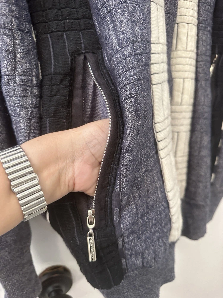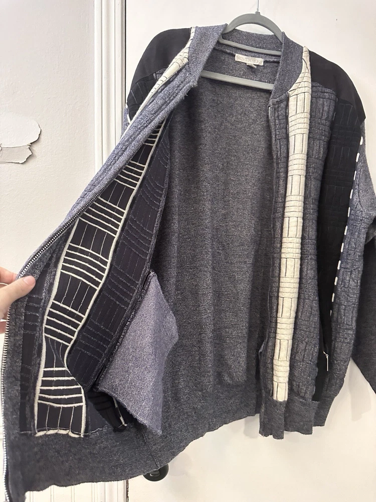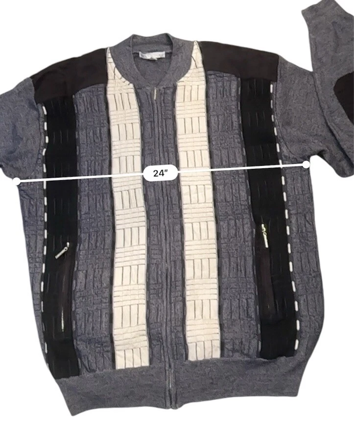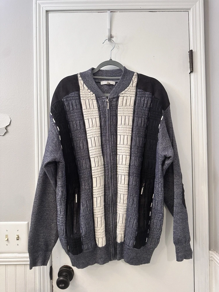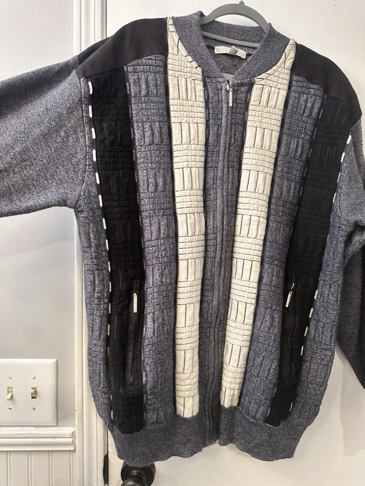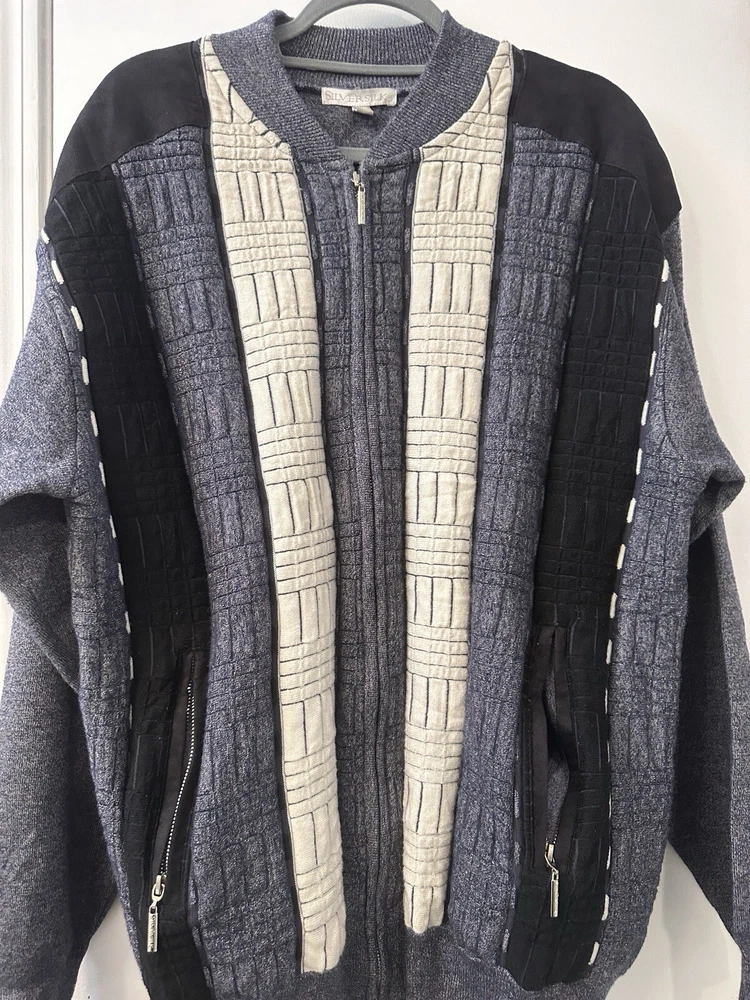 This rare Silver Silk men’s vintage jacket, size XXL, features an iconic patchwork knit design with contrasting fabric panels in black, beige, and grey, offering a bold and stylish look reminiscent of the 80s and 90s fashion. The jacket is complete with trendy elbow patches and a zip-up front, giving it a timeless appeal for those who love retro streetwear or unique statement pieces. Crafted from a comfortable blend of rayon and acrylic, this jacket is perfect for layering in the cooler months. Whether you’re looking to add a vintage touch to your wardrobe or stand out with a one-of-a-kind piece, this Silver Silk jacket is a must-have. Keywords: #VintageFashion, #PatchworkJacket, #ElbowPatches, #RetroStyle, #80sFashion, #Menswear, #UniqueStyle, #Streetwear, #statementpiece bold, textured sweaters and jackets, sometimes with intricate patterns and designs, making it a sought-after brand for vintage enthusiasts today.
