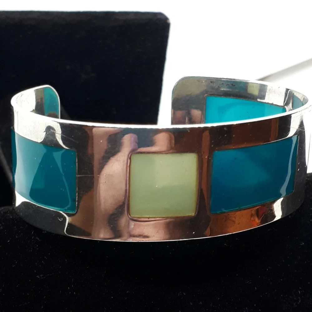 Silver Tone Bracelet Cuff Art Deco Style with Resin Inset Green and Yellow Silver Plated This art deco style bracelet was tarnished when I found it, and cleaned up nicely with silver polish. I do not know if the color pieces are resin or Bakelite. Unknown maker, no mark. The Bracelet opening is 1-1/4" wide. Bracelet width 2-1/4" Height is 1-3/4" Ships FAST from Canada with Tracking Canada to USA shipping is direct, usually within 4 to 7 mail days Note: C refers to Canadian Price and US refers to US price for US buyers, (as the exchange rate is in your favor). We take extra care in packaging to ensure safe arrival of your item. All parcels are shipped with tracking so that you can monitor the shipment progress and delivery. Please Follow Our Store for Updated Weekly Items . ** Have a Great Day! Happy Holidays! USA buyers save with currency exchange on purchase.We ship UPS, Canada Post and Fedex as postage requires. Thank you for being a valued customer!
