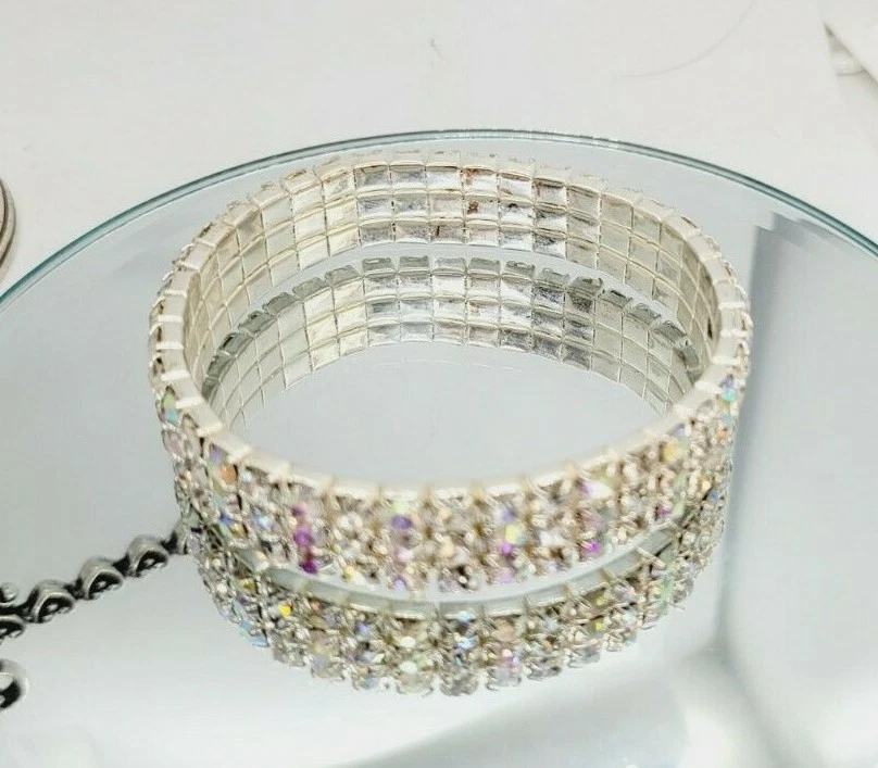 Silver Tone Crystal AB Aurora Borealis Stretch Bracelet One Size ROCKER Biker .5