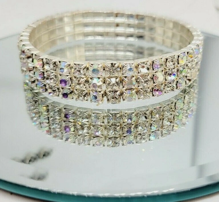 HomeSilver Tone Crystal AB Aurora Borealis Stretch Bracelet One Size ROCKER Biker .5