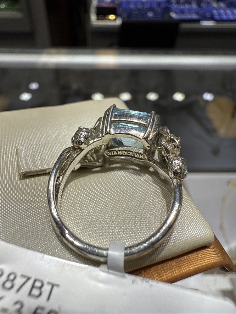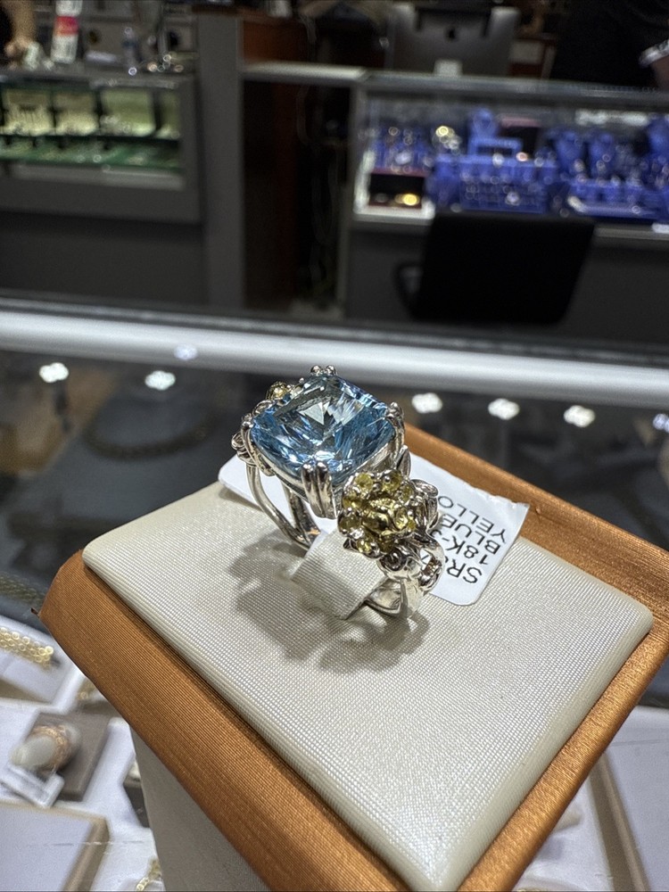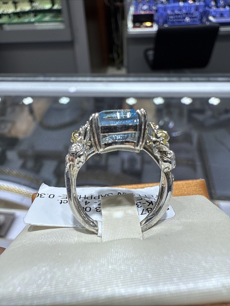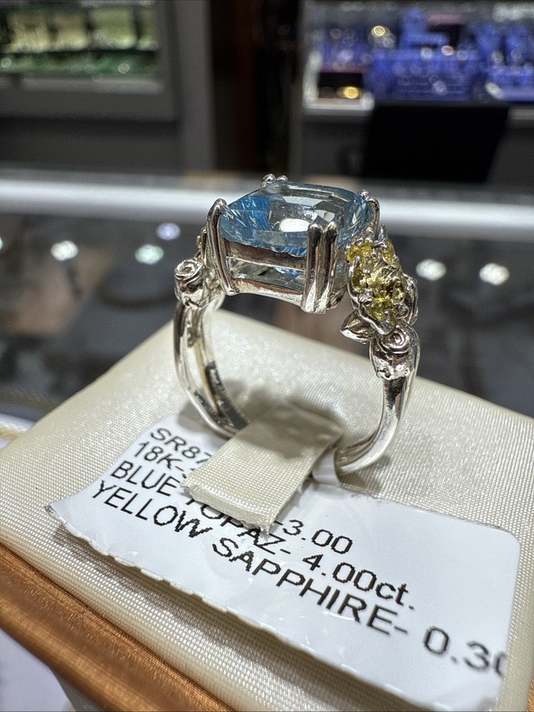 This Silver and 18kt Gold Blue Topaz Ring with Yellow Sapphires is a stunning piece that is perfect for special occasions like anniversaries and birthdays. The ring features a natural blue topaz as the main stone, accented with yellow sapphires on the side. It is signed by STAMBOLIAN and crafted with a combination of silver and 18kt gold, making it a luxurious and unique accessory. With a total carat weight of 4, this ring is a beautiful addition to any jewelry collection.