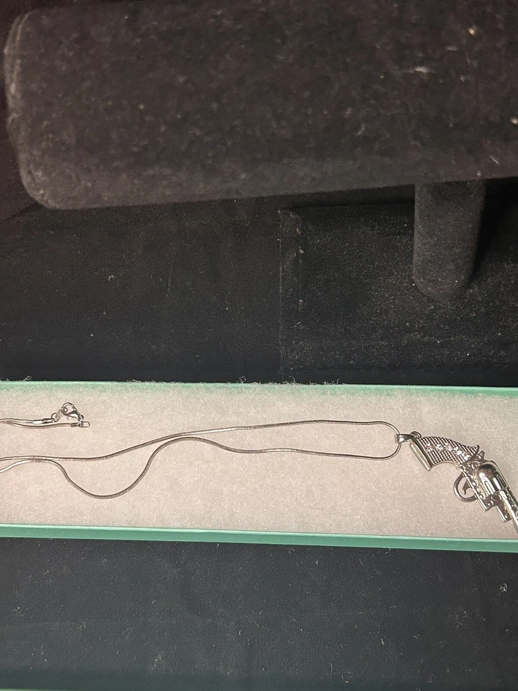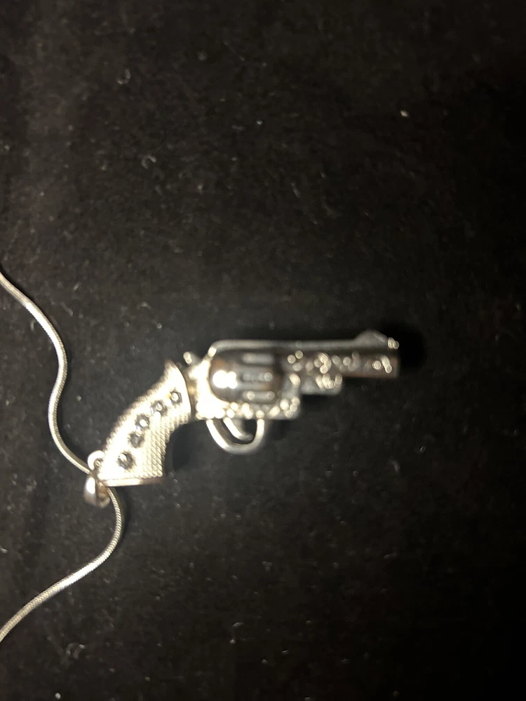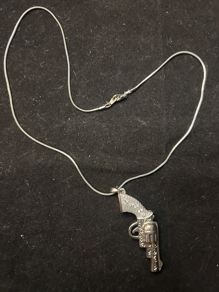 This is a stylish silver necklace featuring a revolver gun charm adorned with sparkling rhinestones on the handle. The charm adds a unique and edgy touch to the necklace, making it a standout piece of jewelry. The necklace comes with a gift box, making it a great option for gifting to someone who appreciates fashion jewelry with a charm-inspired design.