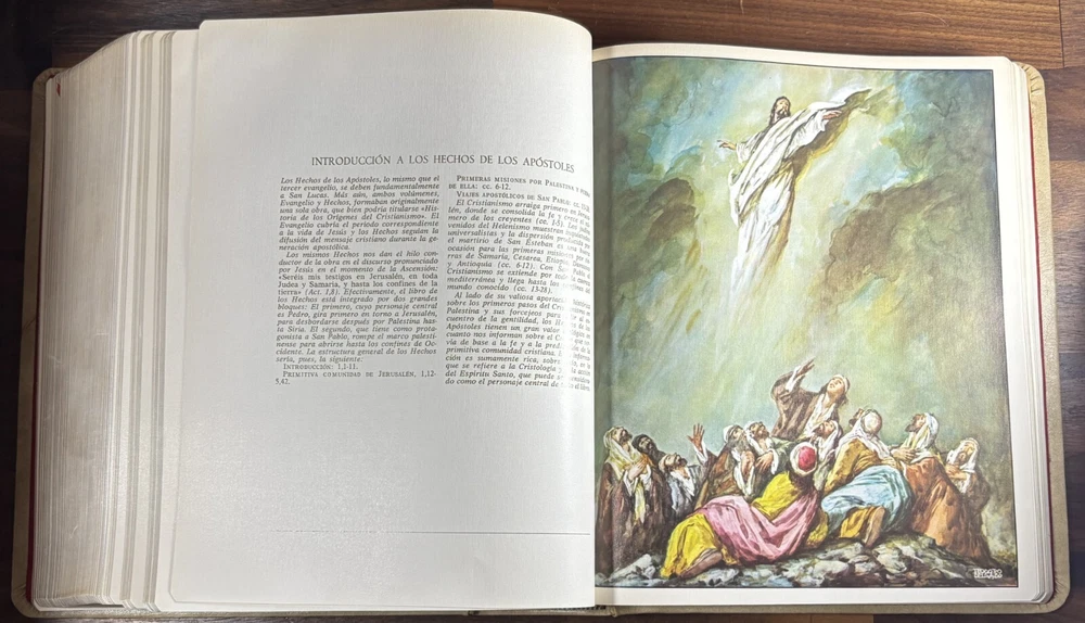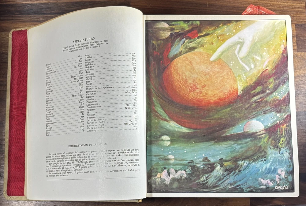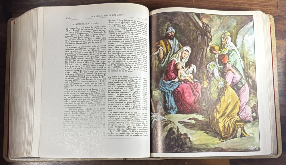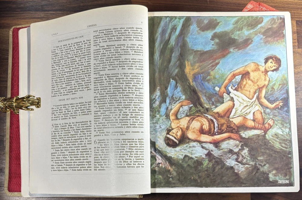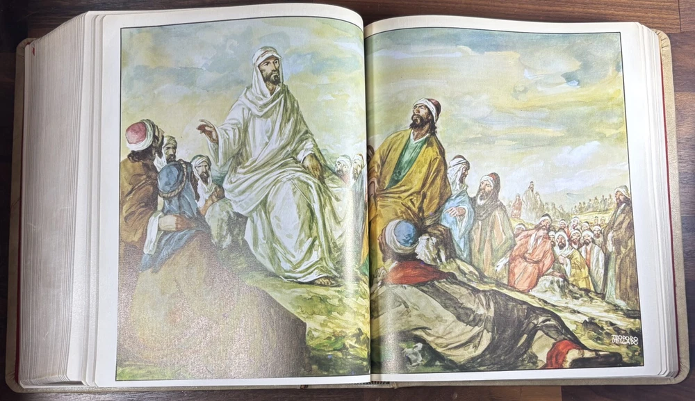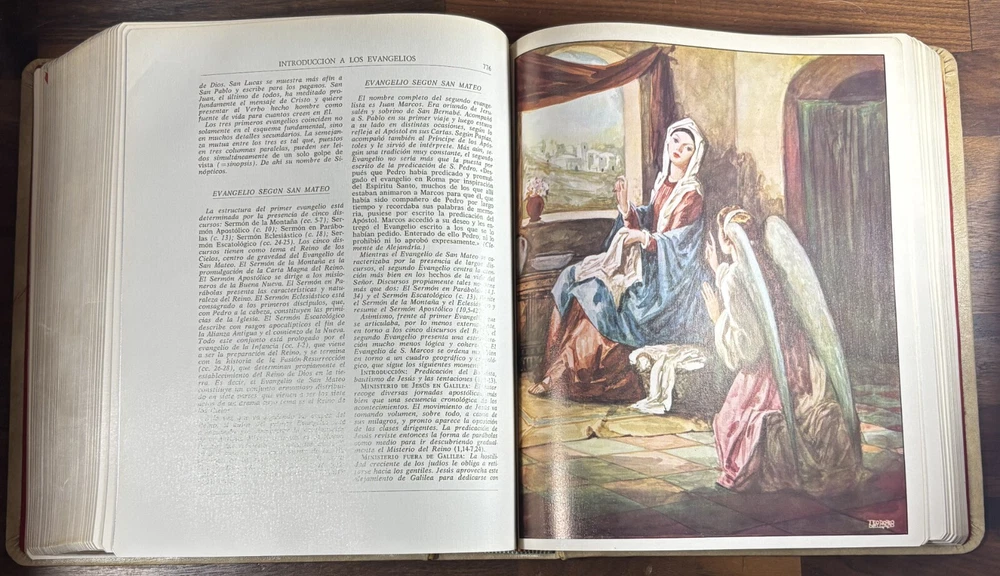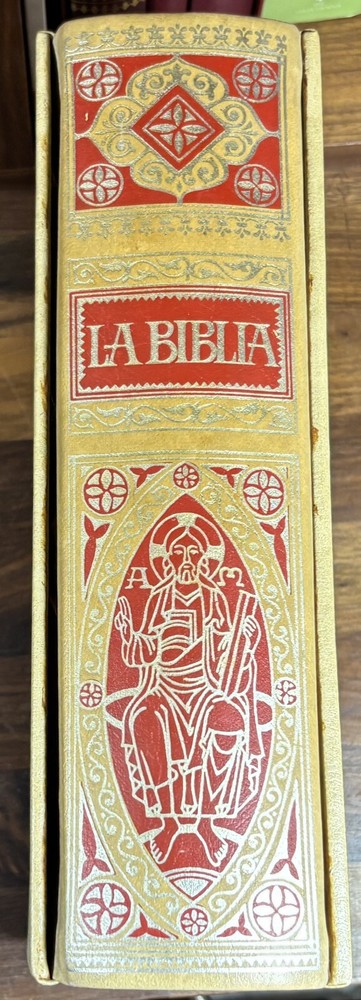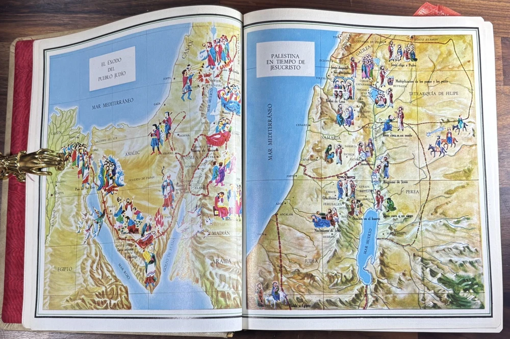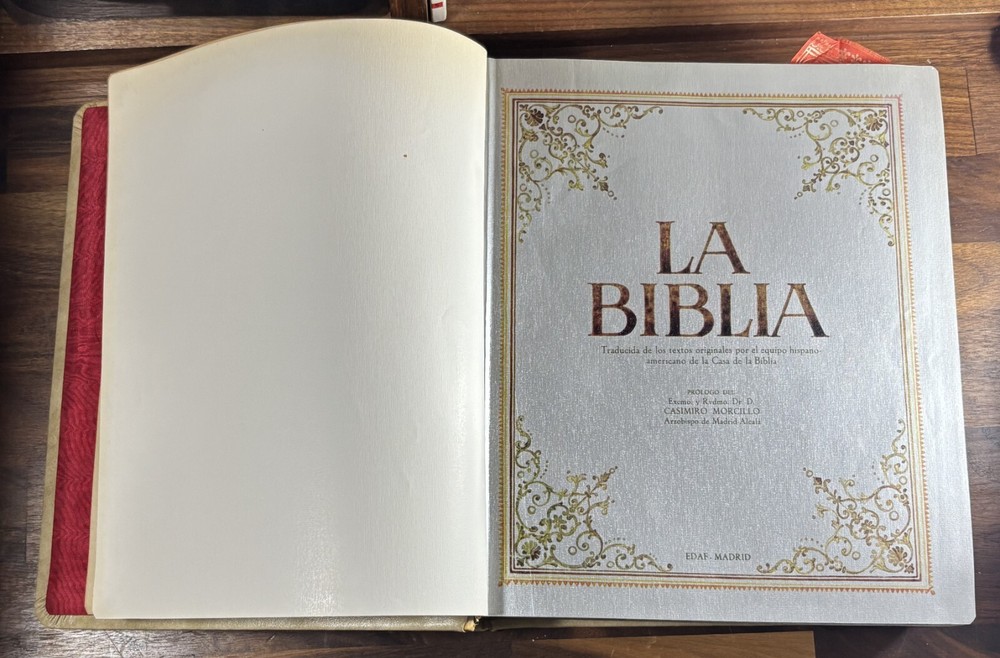 Majestic Cross Adorned Spanish Bible, With Many Illustrations, From 1974 Beautiful Bible with a silver-plated cross adorned with gemstone inlays, featuring numerous illustrations by painter Teodoro Delgado (1907-1975). Published by the Casa de la Biblia in 1974, it has a leather cover, Bible paper, and gilded edges. This tome has no tears or foxing and with minimal signs of aging. Number of pages: 1028, in addition to numerous illustrations and maps. Dimensions: Weight - 3.7KG Height - 27.5cm Width - 22.6cm Thickness - 7cm The Cross on the cover: 26 x 20 cm