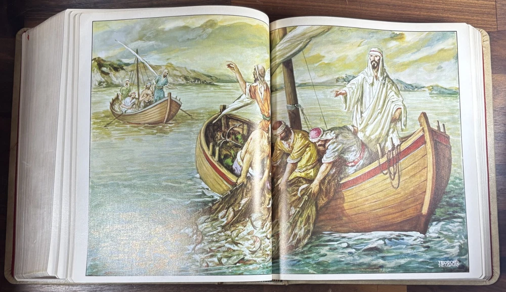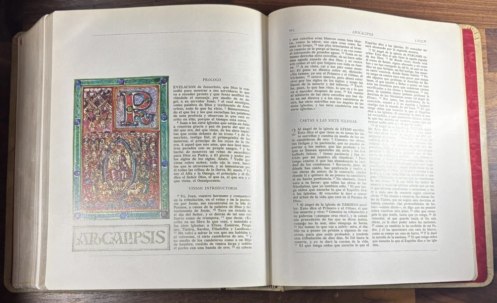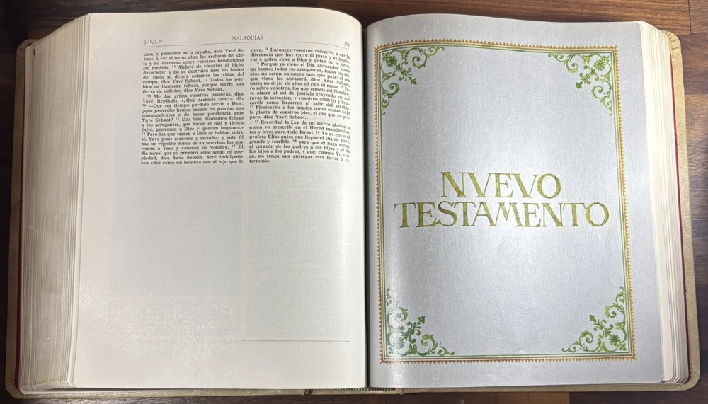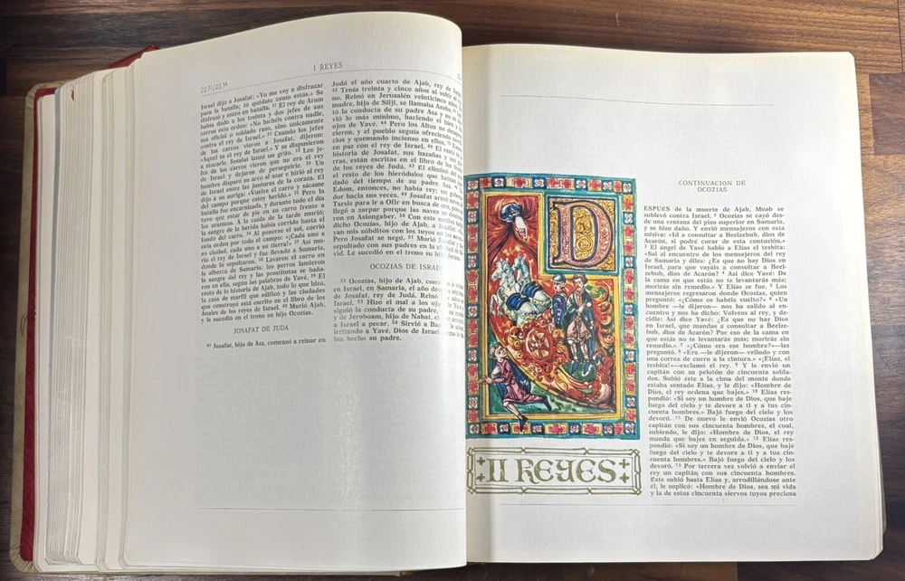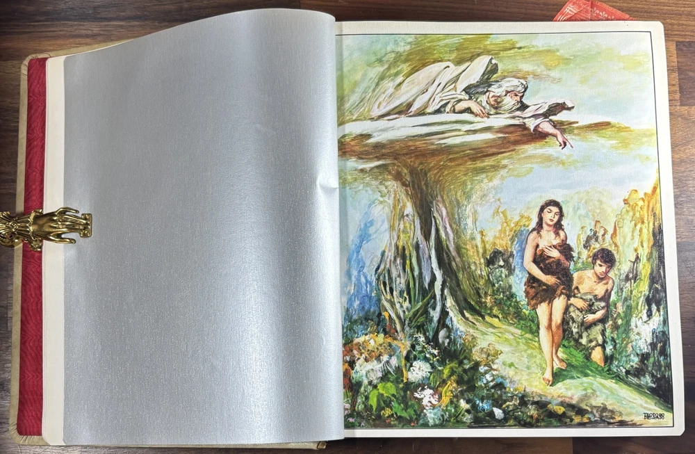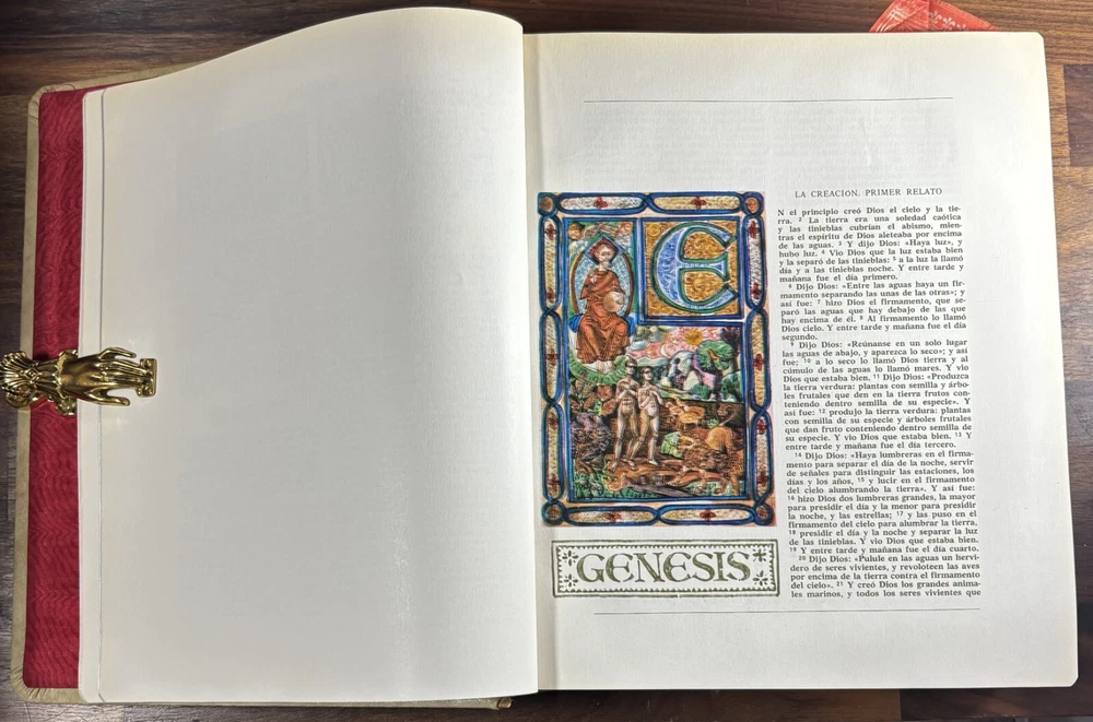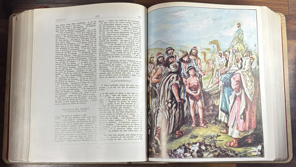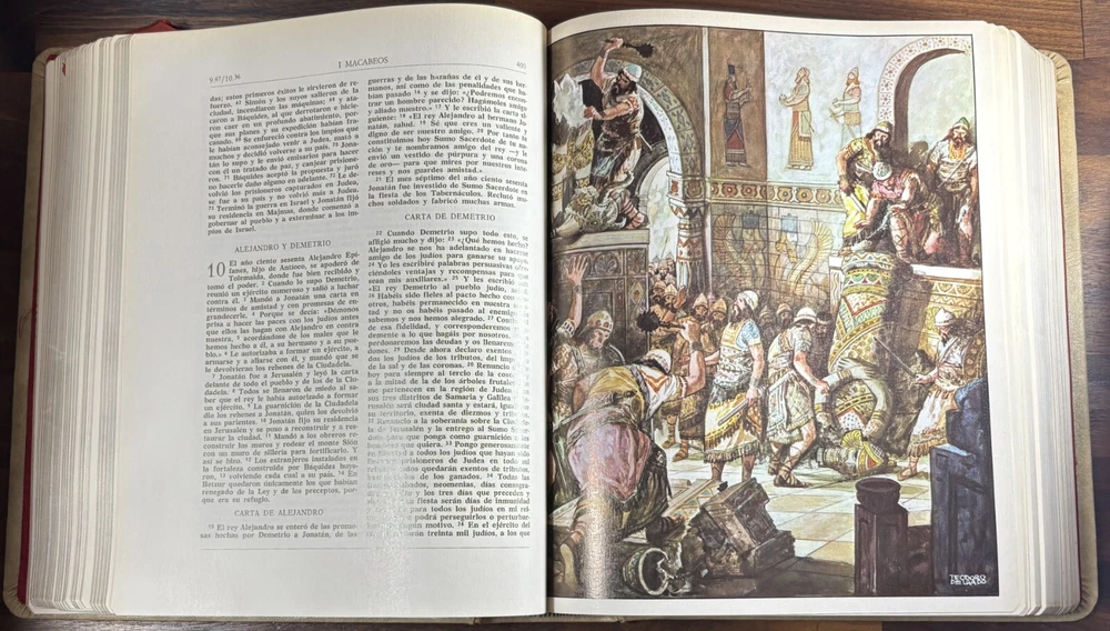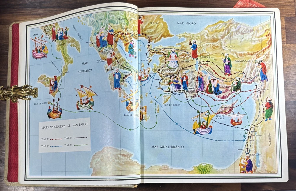 Majestic Cross Adorned Spanish Bible, With Many Illustrations, From 1974 Beautiful Bible with a silver-plated cross adorned with gemstone inlays, featuring numerous illustrations by painter Teodoro Delgado (1907-1975). Published by the Casa de la Biblia in 1974, it has a leather cover, Bible paper, and gilded edges. This tome has no tears or foxing and with minimal signs of aging. Number of pages: 1028, in addition to numerous illustrations and maps. Dimensions: Weight - 3.7KG Height - 27.5cm Width - 22.6cm Thickness - 7cm The Cross on the cover: 26 x 20 cm