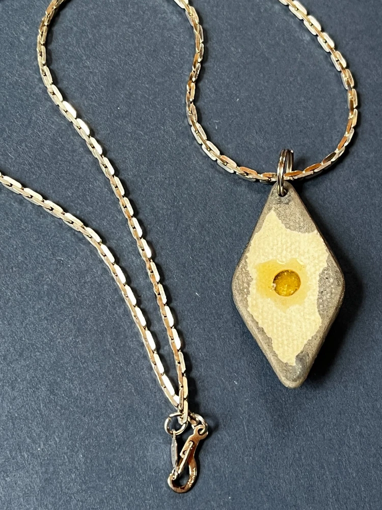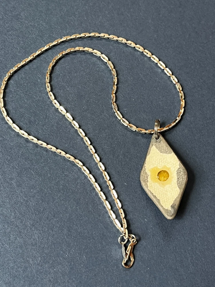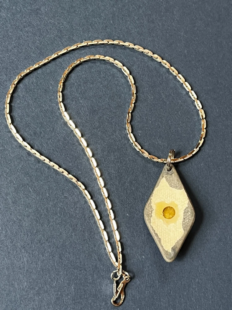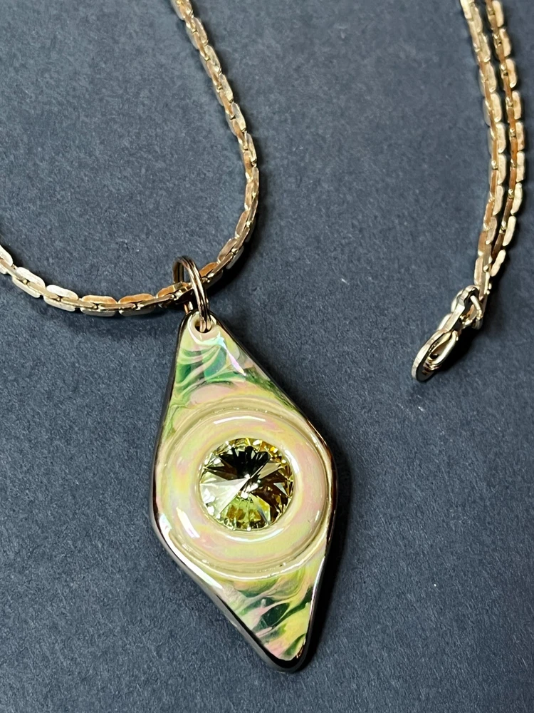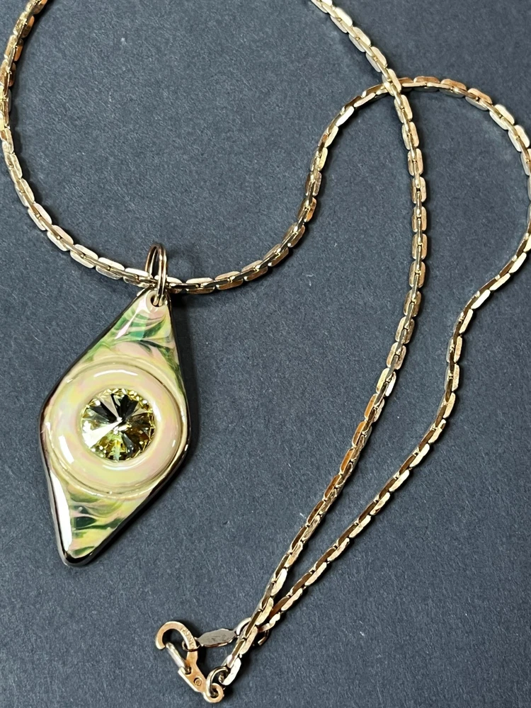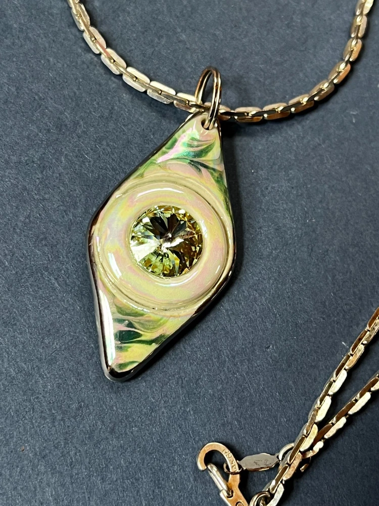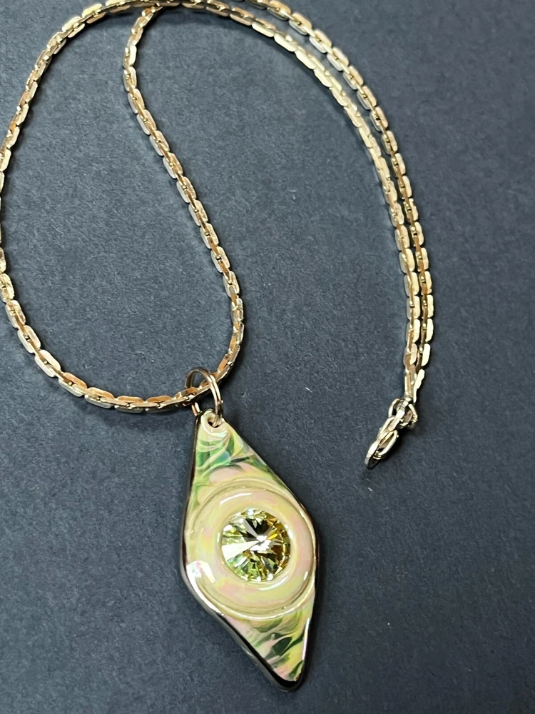 Silvertone Chain w Handmade Green Swirl Lusterware Ceramic Pottery Trapezoid w Rivioli in Center Pendant Necklace – the chain is 19 inches in length – the pendant is 1 and 5/8 th ’s inches long x 7/8 th ’s inches – VERY GOOD condition – ready to wear – (Location – Large Clear Plastic Bag in Large Creel Style Basket) ************************************************************************************************************************************************************************************************************************* COMBINED SHIPPING: 1 win = price listed; 2 wins = 50% of lowest listed shipping price; 3 wins = additional $1.00; 4 WINS (in 7 days) = no additional charge on entire order; Combined Shipping includes AUCTION wins as well as STORE wins (Buy It Now). FREE shipping on combined shipping orders exceeding $100.00 and 4 wins of jewelry only or books only. I will ship worldwide, however, additional shipping charges will apply. I will always attempt to use the cheapest route possible. If you need faster shipping, I will work with you, but you will need to pay the extra shipping charges. I will only be shipping once/week. BOOKS rated using the following scale: FINE – as new condition NEAR FINE – very minor edgewear or other hardly noticeable defect; gift inscription or previous owner’s name might be present or remainder mark; VERY GOOD – minor edgewear, cornerwear, maybe subtle writing or scribbling; remainder mark might be present; previous owner’s name or gift inscription might be present; subtle creases or wrinkles might be present; one or two very tiny tears; pages might be browning; GOOD – multiple condition issues – edgewear, cornerwear, writing or scribbling not affecting the text, creases or winkles, small tears, browning pages; FAIR – many condition problems but still a readable copy POOR – heavy damage but still readable; some books with neat illustrations might be sold with a few pages missing