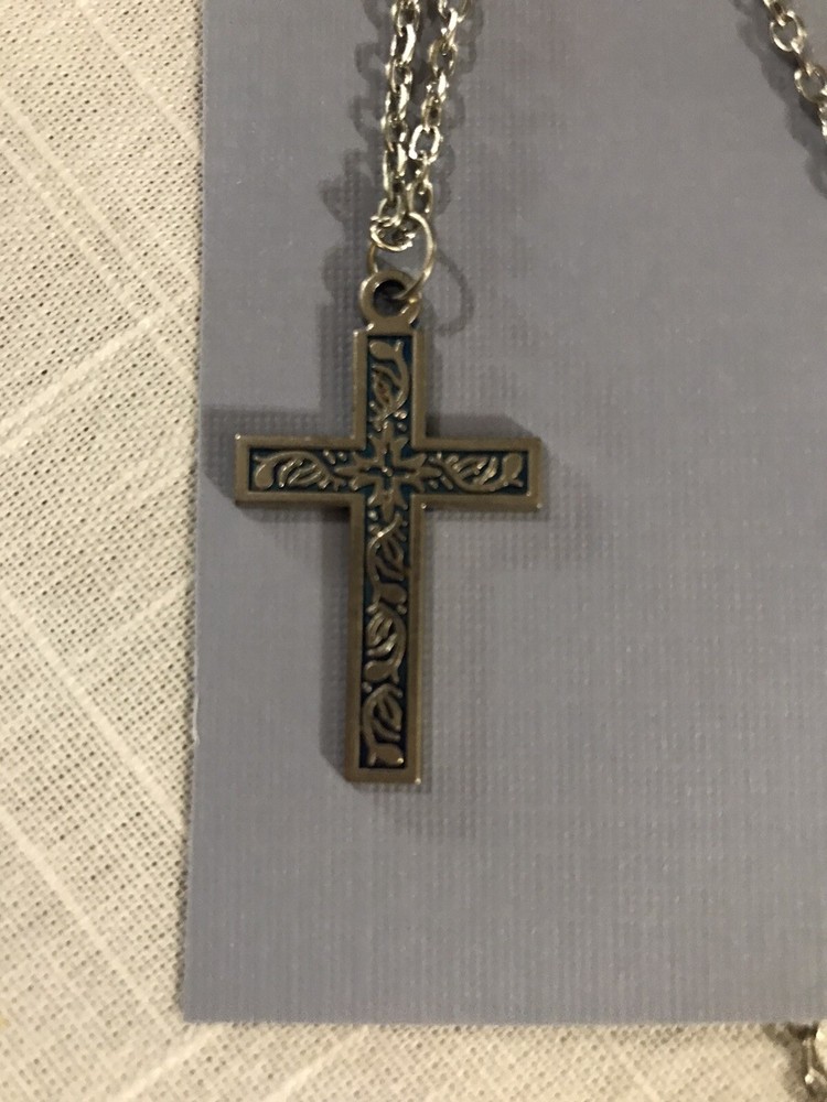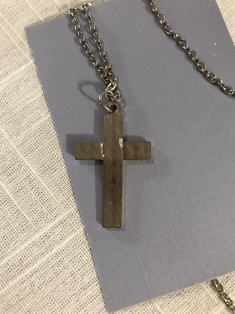This is a silvertone pendant necklace featuring a cross charm on a 20-inch chain. The necklace is designed in a religious theme, making it a Christian jewelry piece. The pendant is in a classic cross shape and style, perfect for those looking for a simple yet meaningful accessory. The necklace is pre-owned and exudes a timeless and elegant look with its silver color and charming design.