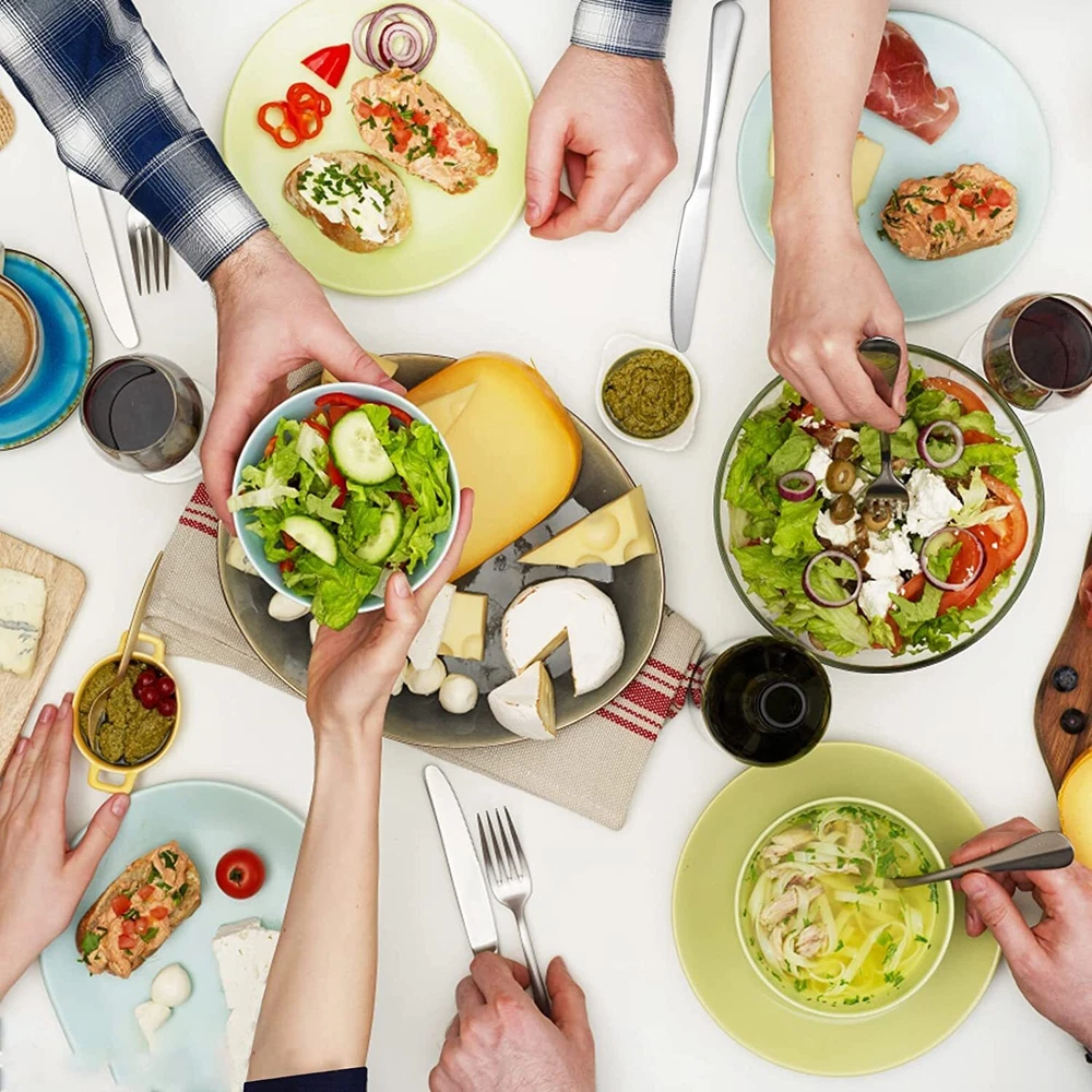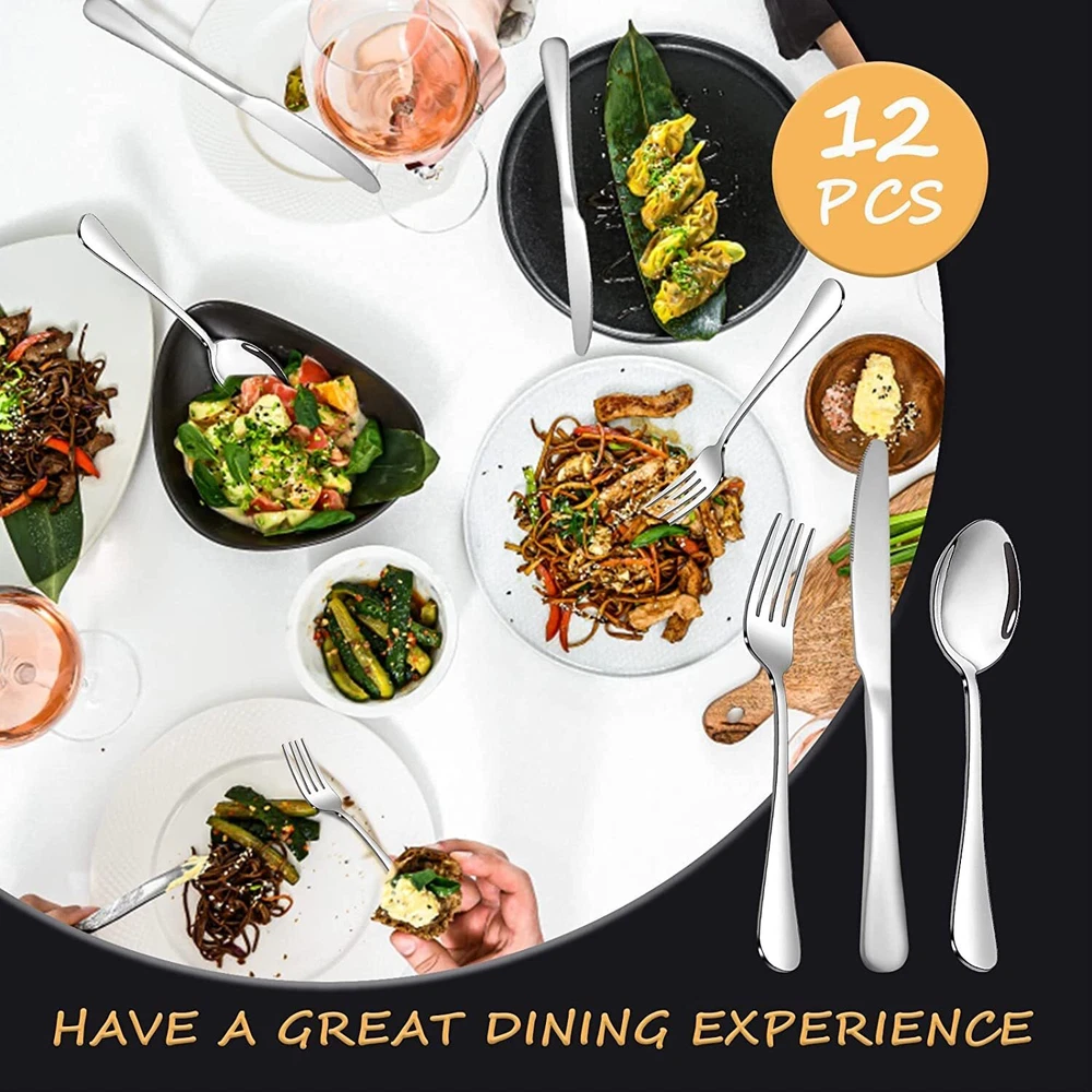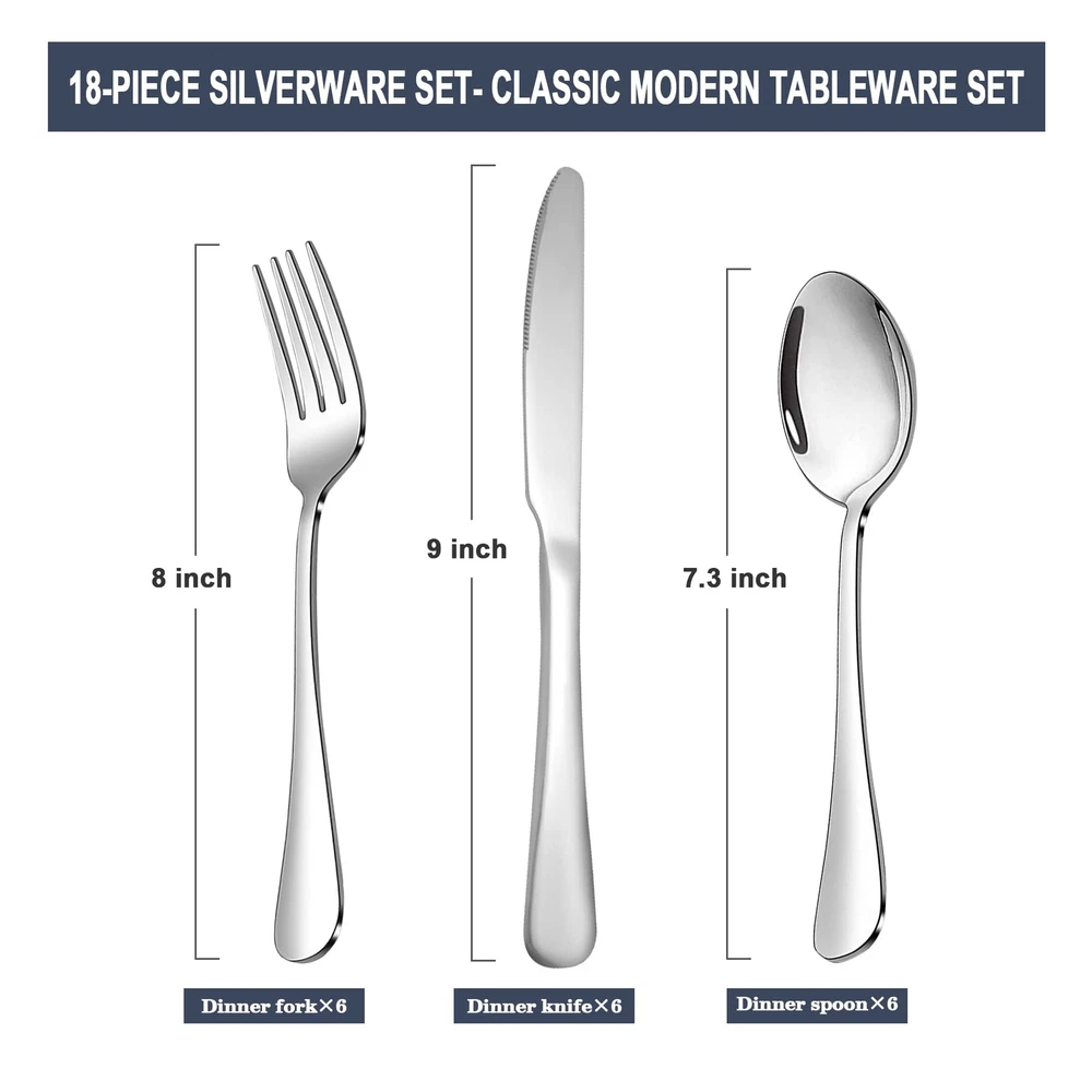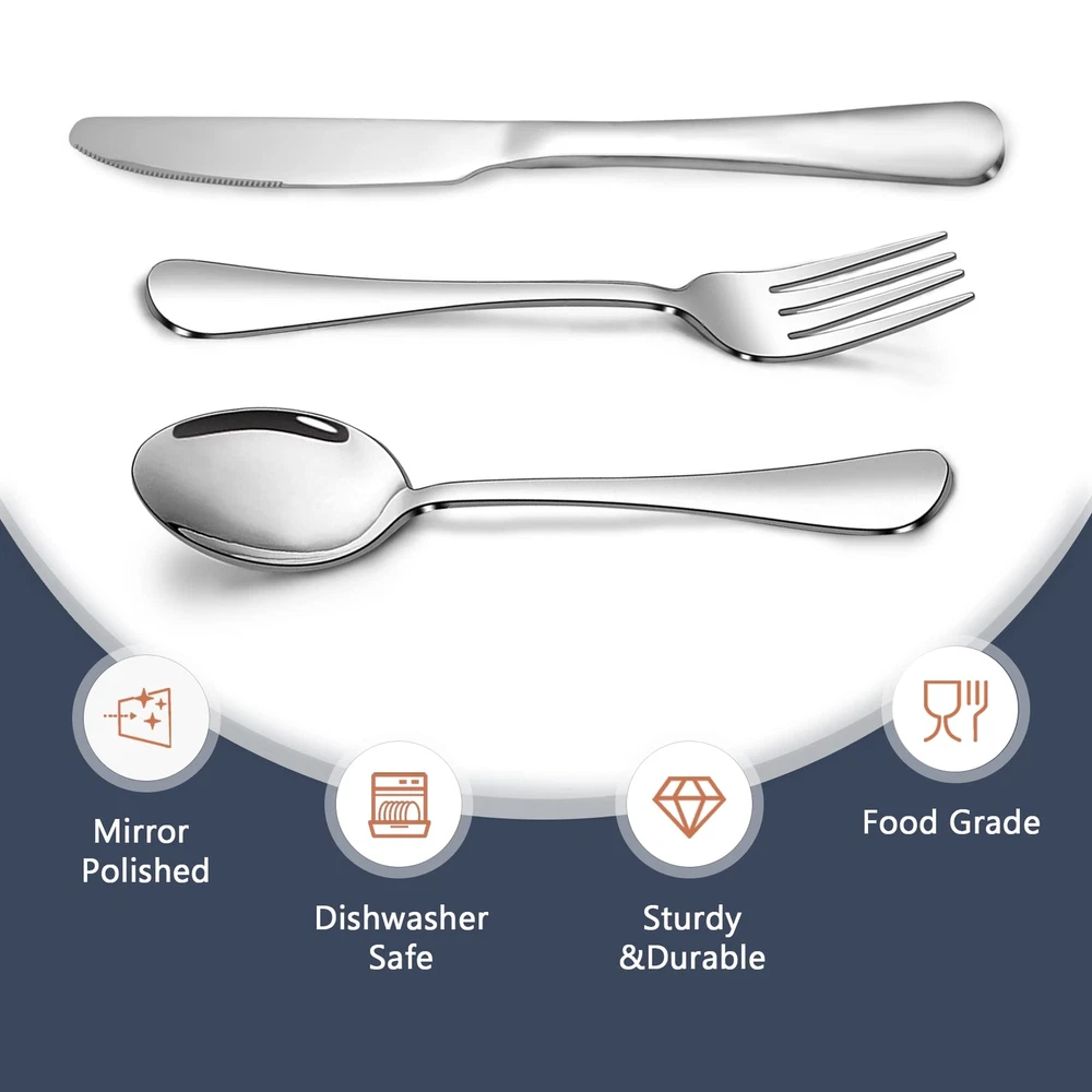 This flatware set is made of high quality food grade stainless steel which is very durable, rust-proof, corrosion resistant, non-toxic, BPA free, no metal aftertaste. Meanwhile, its sturdiness ensures that it will not bend easily providing you with long - term use. Most importantly, they’re dishwasher safe. HIGH-QUALITY STAINLESS STEEL: Made of premium food-grade stainless steel, providing the longest term value and the best properties, it offers nice resistance to rust and corrosion to get the most sturdy and healthy experience while using, never bend in daily use. [9 Inch Knives-8PCS]- 8 piece dinner Knives have an ergonomically designed rounded edge handle for a comfortable grip.The sturdy construction makes the knives less bendable, adding more elegance and class to your table and making your daily dining experience more satisfying. [7.3 Inch Spoons-8PCS]- 8 piece soup spoons have an ergonomically designed rounded edge handle for a comfortable grip.The sturdy construction makes the spoon less bendable, adding more elegance and class to your table and making your daily dining experience more satisfying. [Multi-purpose use]- This knives forks spoons silverware set is perfect for formal occasions, parties or festivals, such as parties, weddings, restaurants, celebrations, family dinners,camping etc. [Dishwasher Safe]- The total quantity of dinner kinves and dinner forks and dinner spoons is 24. They are all designed ergonomically, which has mirror polished and smooth edges for a comfortable feel. Meanwhile, this kitchen utensil set has a sturdy structure, so it can be used for a long time. Most importantly, the silverware sets are dishwasher safe, so you can just put them in a dishwasher for saving time in hand washing.