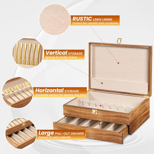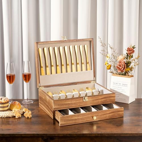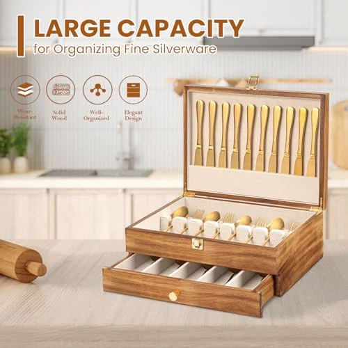 Menu 1. We require immediate payment. 2. We currently accept payment via eBay managed payments only. 3. Once payment is cleared, we will dispatch your shipment within 1-3 business days. Please refer to the "Shipping" tab for more information regarding shipping speed to your destination. Silverware Storage Box, 2-Layer Flatware Storage Case with Drawer, Wooden Silverware Chest with Linen Liner, Rustic Silverware Case for Storing Fine Flatware and Utensils (Brown) Product description Premium Silverware Storage Box: This wooden silverware storage case with drawers combines rustic charm with elegant design, providing 2-layer space to organize daily utensils or store exquisite silverware for gatherings or special occasions. Size of silverware box: 14.9"W x 11.1"D x 5.5"H Authentic Wood Craftsmanship: Crafted from solid wood in a rustic country style, this sturdy and durable silverware chest exudes a sense of luxury. The silverware boxes for flatware features the linen lining to effectively prevent scratching or damage to your silverware, ensuring they're intact for years to come. Large Capacity Silverware Case: Vertical slots for butter knives, stackable compartments for salad and dinner forks and spoons, and a pull-out drawer for additional cutlery make organizing easy. Home Decorative Silverware Storage: Enhance your home's aesthetic with this wood silverware flatware storage box, displaying it in a cabinet or display case to add a touch of sophistication, resembling a piece of art. Ideal Gift: This flatware chest makes an excellent holiday gift for family and friends who own silverware sets, suitable for Mother's Day, Father's Day, Memorial Day, Christmas, and Thanksgiving, etc. PLEASE MESSAGE US IF YOU HAVE ANY OTHER QUESTIONS, AND MANY THANKS FOR READING ALL OF THIS. Copyright ©#. All Rights Reserved.
