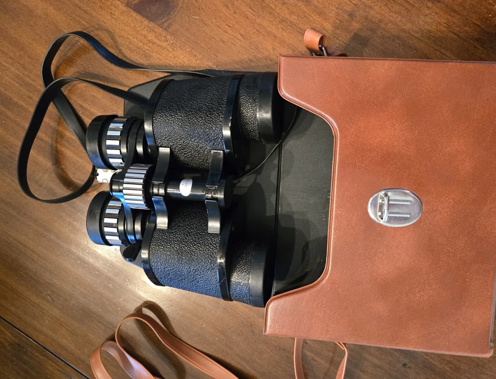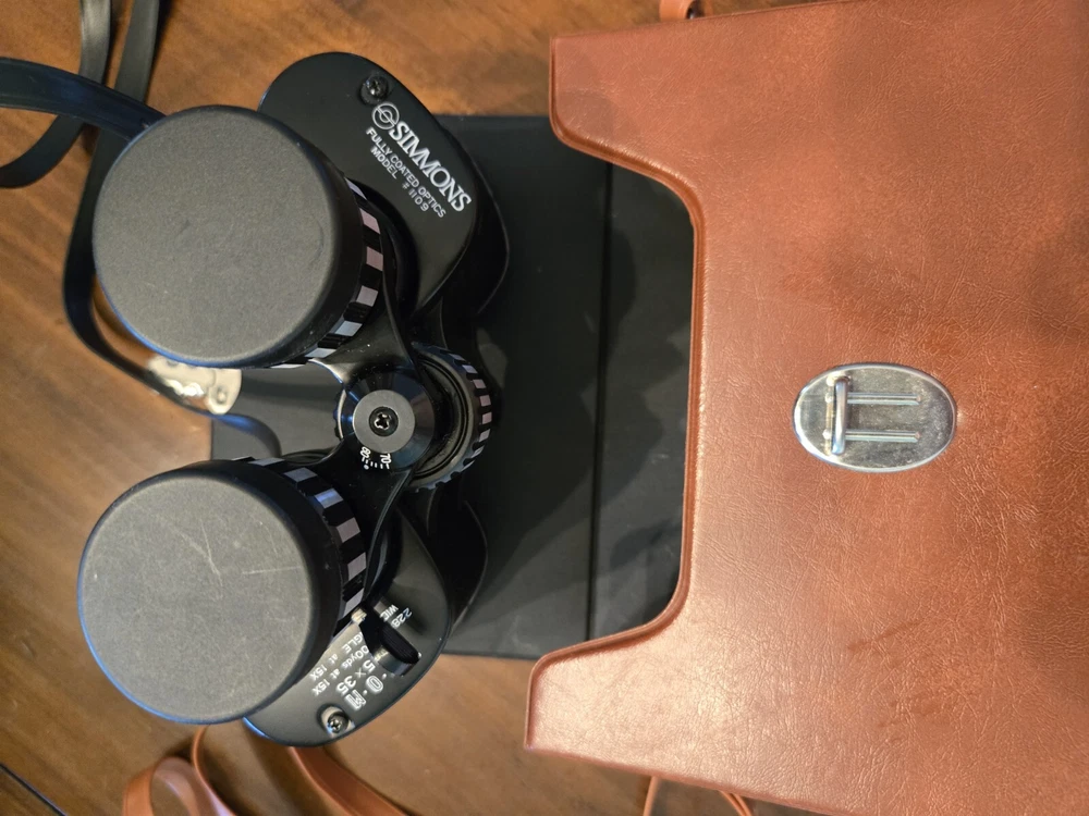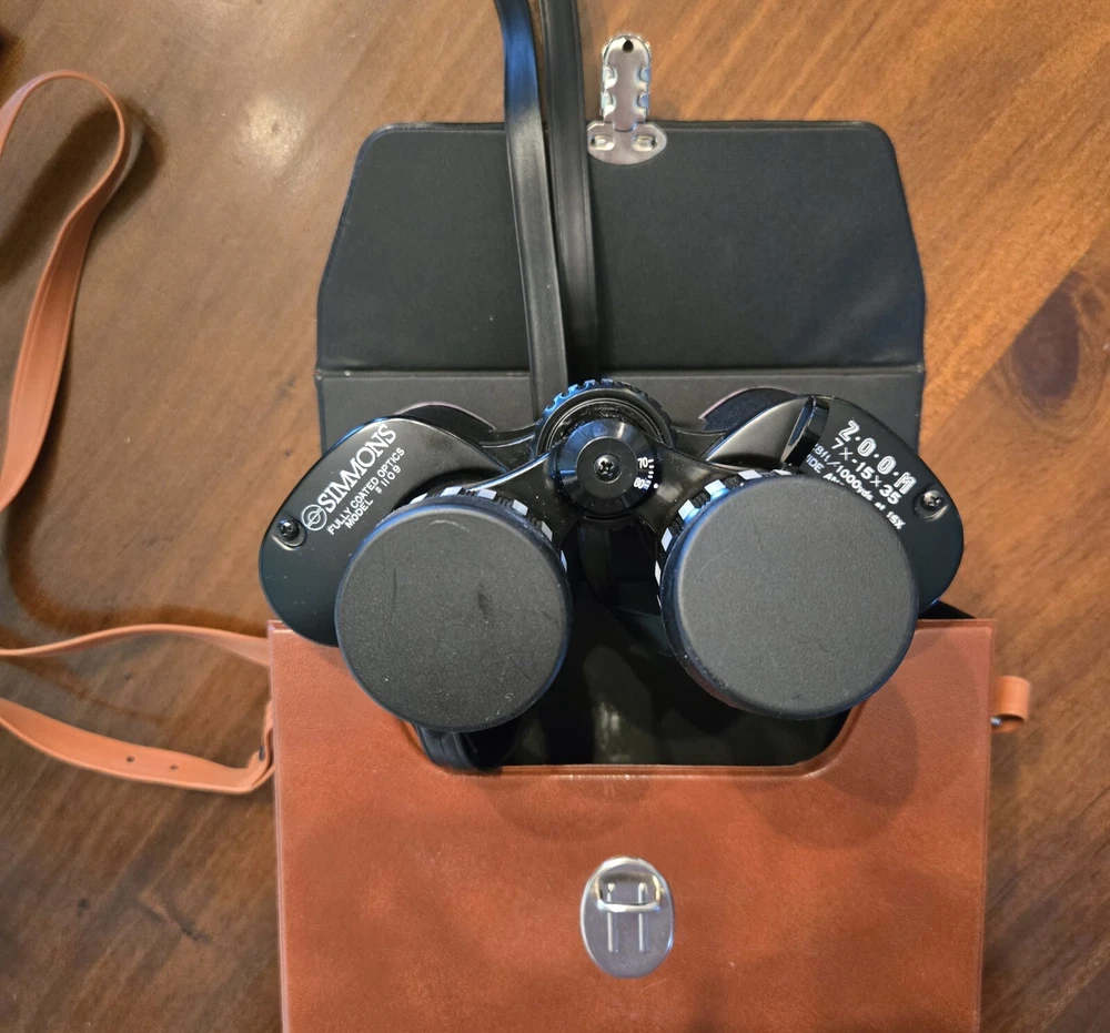Simmons Binoculars Model #1109 are versatile binoculars with a maximum magnification of 15x and a 35mm objective lens diameter. They feature fully coated lenses, a wide-field lens, and a zoom lens for detailed viewing. The binoculars come equipped with lens covers for protection and are ideal for general-purpose use. Includes storage/carrying case with strap
