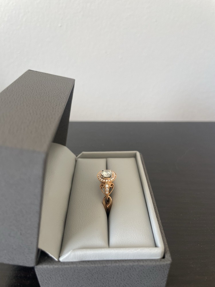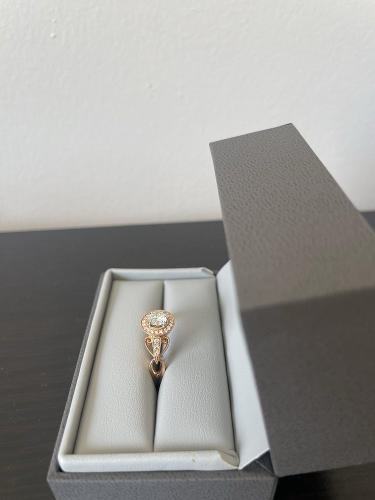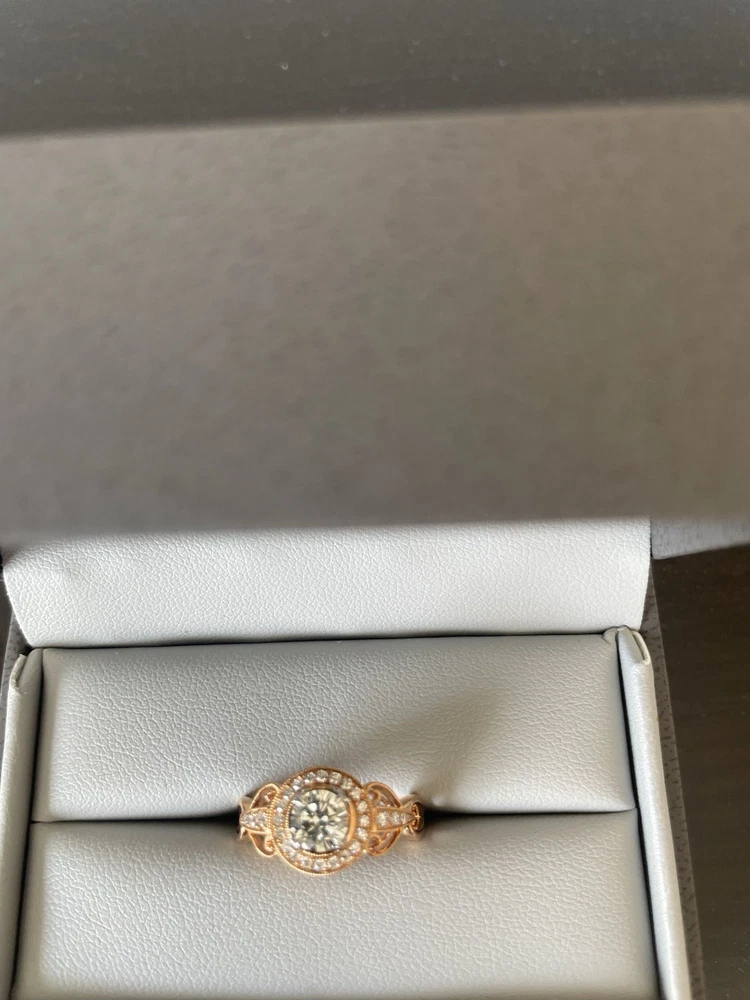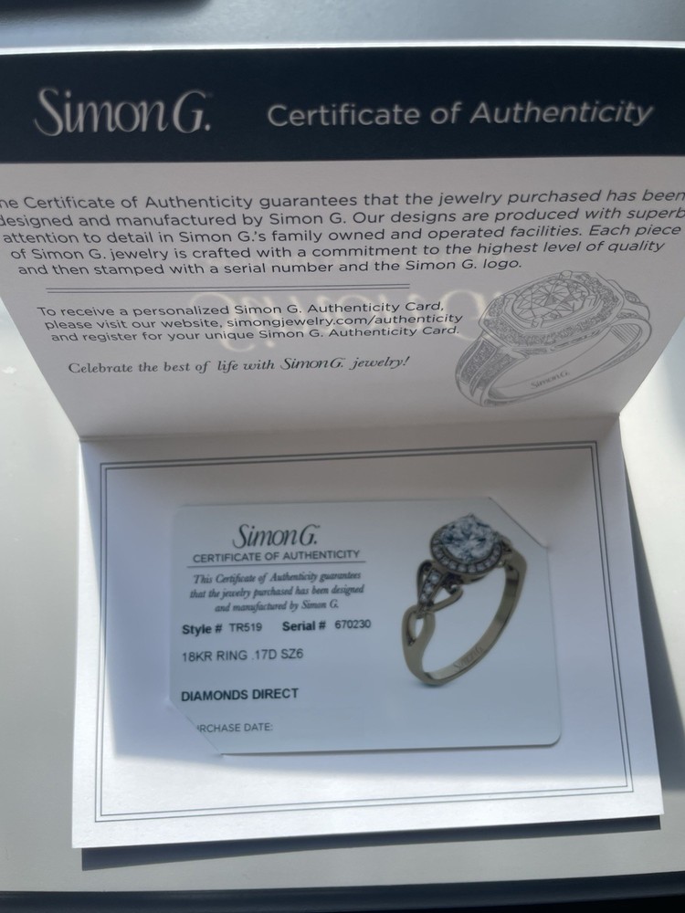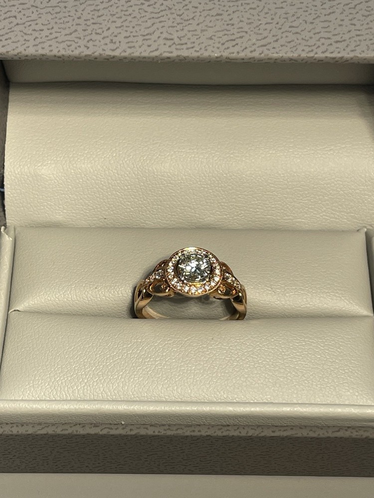 Never Been Worn! It is an 18 Karat Rose Gold Ring consisting of a Center Round Cut Diamond that weighs .5 carats in a 4 prong setting. The diamond is graded by the Gemological Institute of America, report number G-1329545016, and measures 5.18x5.21x3.01 millimeters. The Color Grade is L and Clarity Grade is VS1. The mounting is designed by Simon G. Jewelry and consists of brilliant round cut diamonds with an estimated combined total weight of .17 carats I have all paperwork for this ring.