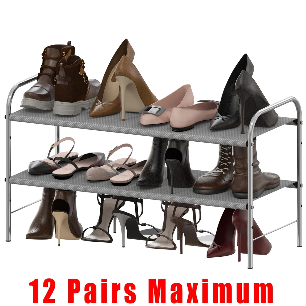 SimpleHouseware 2-Tier Shoe Rack Storage Organizer, Grey Stores up to 12-15 pairs of shoes, Additional bottom storage for slippers. Sturdy metal construction with washable 600 D polyester fabric, each shelf holding up to 30 lbs. Easy Assembly Personalized Storage: You can remove the panel to build into a 2-tier or 3-tier shoe rack to fit different kind of shoes. Great solution to keep your entryway, closet, dormitory, patio, mudroom and garage away from mess. Product Dimension: 11.2''D x 26.8''W x 15.1''H