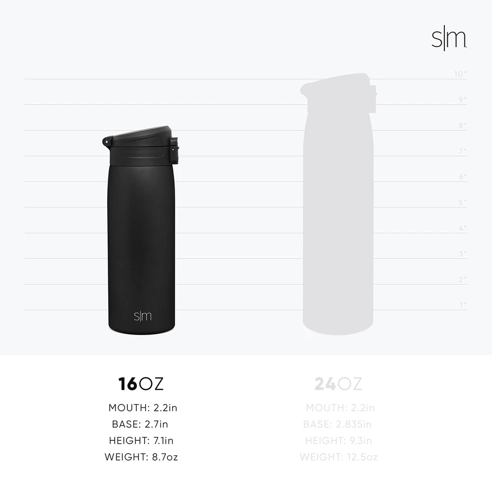 Simple Modern Insulated Thermos Travel Coffee Mug with Snap Flip Lid | Leakproof Reusable Stainless Steel Tumbler Cup | Gifts for Women Men Him Her | Kona Collection | 16oz | Midnight Black Product Details Style: 16oz Color: - Midnight Black Brand: Simple Modern MPN: KNA-16-MB UPC: 191719089469 EAN: 0191719089469 Brand: Simple Modern Capacity: 16 ounces Color: - Midnight Black Recommended Uses For Product: Travel Special Feature: Reusable Brand: Simple Modern Capacity: 16 ounces Color: - Midnight Black Recommended Uses For Product: Travel Special Feature: Reusable Age Range (Description): Adult Product Dimensions: 2.7"W x 5"H Model Name: Kona Insulated Travel Mug Thermos with Flip Lid - Item Weight: 7.27 Ounces Theme: Monochrome Material: Stainless Steel Number of Items: 1 Included Components: Tumbler Product Care Instructions: Hand Wash Only Base Diameter: 2.7 Inches Cap Type: Flip Top Cap With Lid: Yes Is Dishwasher Safe: Yes Is Microwaveable: No Is Oven Safe: No UPC: 191719089469 Manufacturer: Simple Modern Global Trade Identification Number: 69 Item Weight: 7.3 ounces Country of Origin: China Item model number: KNA-16-MB Date First Available: June 12, 2019 Double Wall Insulated: Thermos keeps beverages at ideal temperature for hours Leakproof: Our BPA Free, lockable, & insulated flip lid prevents spills Travel Friendly: Fits cupholders and backpack pockets for commuters and life on-the-go Dishwasher Safe Limited Lifetime Warranty & US Patented The Simple Modern Kona Travel Mug comes with a lockable, push-button flip lid. The tumbler is double-walled, vacuum insulated 18/8 stainless, keeping your beverage hot or cold for hours. The Kona fits all cupholders and perfect for you morning commute.