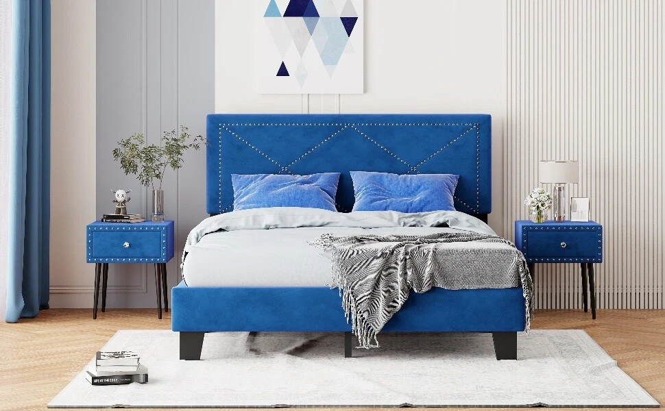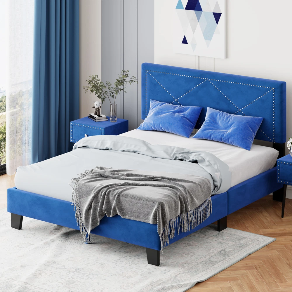 Brand Unbranded Item Length 66.77 Item Width 24.80 Item Height 4.72 Color Blue Frame Material Solid Wood MDF Type BED FRAME Compatible Mattress Size As described Diamond-ring-1 Simple life Simple Queen Size Upholstered Bed Frame with Rivet Design, Modern Velvet Platform Bed with headboard, Blue Classic Rivet Design: The rivet design is added to the headboard to make it more simple and fashionable, suitable for most American decoration styles, and it is also attractive when placed in the bedroom. Elegant Velvet Covering: The bed frame is wrapped in velvet material, giving a soft and comfortable atmosphere. The entire bed exudes a sophisticated feel. The headboard features a comfortable velvet fabric backrest, giving you and your partner a great sleeping experience. Sturdy and Durable: Made of solid MDF and plywood, the bed frame provides powerful support for objects weighing up to 650 pounds. The structure ensures longevity and the bed frame is sturdy and the bed head won't wobble. No Box Spring Required: This queen bed frame comes with 10 plywood slats, so this bed doesn’t require a box spring. 5.Size Information: Overall Dimension: 82.3*64.2*44.9 inch (L*W*H), Suitable for mattress 10-12" queen size.(Mattress is not included) Simple Queen Size Upholstered Bed Frame with Rivet Design, Modern Velvet Platform Bed, Blue This upholstered platform bed features a velvet headboard with a charming rivet design. These rivets add a touch of elegance and attraction to the bed. This bed seamlessly blends comfort and modern flair. Sturdy wood frame construction and a wooden slat system to add extra stability and safety. Despite its size and solidity, this piece comes with hardware and instructions included and anyone can assemble it, without a problem. Features: Product Type Bed Color Blue Material MDF+Plywood+Velvet+Metal Size Queen Detail Product Dimension Please refer to the size image Weight Capacity 650 Number of Slats 10 Recommended Mattress Thickness 10-12" Assembly Required Yes Country of Origin Malaysia Item Specifics Brand Unbranded Item Length 66.77 Item Width 24.80 Item Height 4.72 Color Blue Frame Material Solid Wood MDF Type BED FRAME Compatible Mattress Size As described Payment Returns Diamond-ring-1 Simple life DESCRIPTION PAYMENT SHIPPING RETURN POLICY CONTACT US Shop Category Store Home Other Hot Item Delivery New List Item Help & Info Payment Policy Shipping Policy Return Policy FAQ About Us Simple Queen Size Upholstered Bed Frame with Rivet Design, Modern Velvet Platform Bed with headboard, Blue Classic Rivet Design: The rivet design is added to the headboard to make it more simple and fashionable, suitable for most American decoration styles, and it is also attractive when placed in the bedroom. Elegant Velvet Covering: The bed frame is wrapped in velvet material, giving a soft and comfortable atmosphere. The entire bed exudes a sophisticated feel. The headboard features a comfortable velvet fabric backrest, giving you and your partner a great sleeping experience. Sturdy and Durable: Made of solid MDF and plywood, the bed frame provides powerful support for objects weighing up to 650 pounds. The structure ensures longevity and the bed frame is sturdy and the bed head won't wobble. No Box Spring Required: This queen bed frame comes with 10 plywood slats, so this bed doesn’t require a box spring. 5.Size Information: Overall Dimension: 82.3*64.2*44.9 inch (L*W*H), Suitable for mattress 10-12" queen size.(Mattress is not included) Simple Queen Size Upholstered Bed Frame with Rivet Design, Modern Velvet Platform Bed, Blue This upholstered platform bed features a velvet headboard with a charming rivet design. These rivets add a touch of elegance and attraction to the bed. This bed seamlessly blends comfort and modern flair. Sturdy wood frame construction and a wooden slat system to add extra stability and safety. Despite its size and solidity, this piece comes with hardware and instructions included and anyone can assemble it, without a problem. Features: Product Type Bed Color Blue Material MDF+Plywood+Velvet+Metal Size Queen Detail Product Dimension Please refer to the size image Weight Capacity 650 Number of Slats 10 Recommended Mattress Thickness 10-12" Assembly Required Yes Country of Origin Malaysia Item Specifics Brand : Unbranded Item Length : 66.77 Item Width : 24.80 Item Height : 4.72 Color : Blue Frame Material : Solid Wood MDF Type : BED FRAME Compatible Mattress Size : As described Payment Returns All rights reserved.