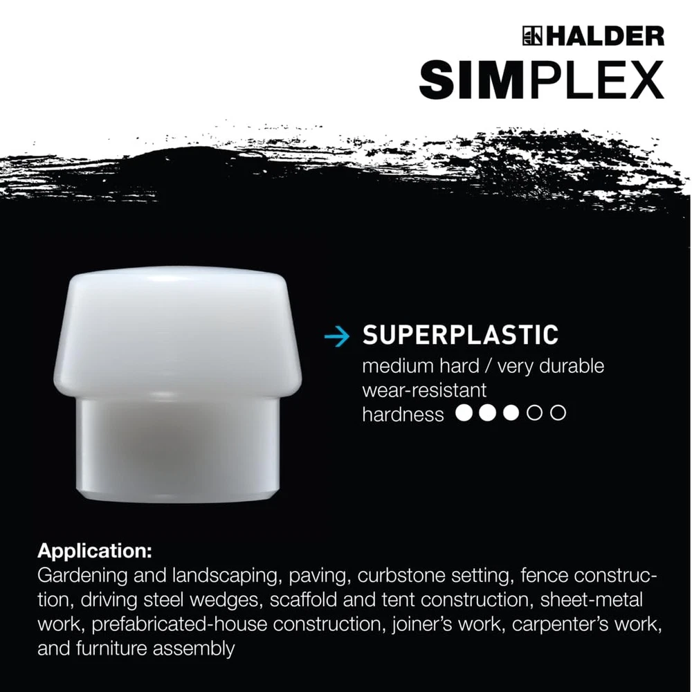 SIMPLEX soft-face mallet with the insert combination of TPE-soft (blue, soft, no marring) / superplastic (white, medium hard, very durable) Cast iron housing with integrated handle protection sleeve and excellent break resistance High-quality, vibration-damping, and ergonomically shaped wooden handle; grip area with double coat of varnish (resistant to dirt) All parts can be replaced / retrofitted, resulting in great savings in cost and resources Available in sizes of D30mm to D60mm.