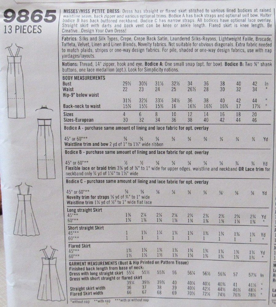 Simplicity 9865 Women 4-6-8 Design Your Own Evening Gown Cocktail Dress Pattern Simplicity 9865 Women 4-6-8 Design Your Own Evening Gown Cocktail Dress Pattern Simplicity Sewing Pattern 9865, dated 1995 "Design Your Own" pattern (EASY) Evening Gown or Cocktail Dress features empire bodice variations and slim or flared skirt Misses Sizes 4--6--8 are ALL included fit busts 29½--30½--31½" UNCUT, factory folded, complete & unused condition Envelope is good ~I mail All patterns in an archival quality storage sleeve. ~I ship SAME or NEXT business day . . . always! ~I don't use tracking for patterns. They are shipping USPS Flat 1st Envelope. ~I personally guarantee delivery within 10 business days or will process a full refund! Please be sure to check my other store listings! Listing and template services provided by inkFrog