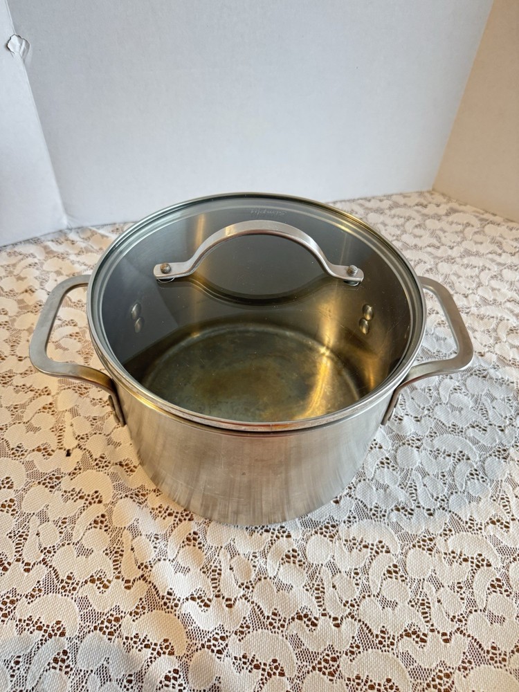 The Simply Calphalon Stainless Steel 6 QT./7.5L 806 Dutch Oven Stock Pot is a versatile and durable addition to any kitchen. Made of high-quality stainless steel, this pot is suitable for use on both electric and gas stoves. Its sleek silver color and compact 6-inch height without the lid, make it a stylish and functional piece for your cooking needs. Weighing 6 lbs, this pot is sturdy and reliable for everyday use.