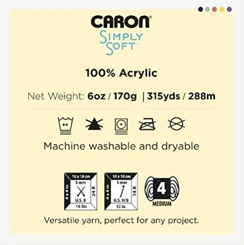Simply Soft yarn is of the most popular, versatile worsted weight yarns. Incredibly soft to the touch, this yarn is perfect from a variety of projects from baby to fashion to home décor. Simply Soft comes in an extensive array of colors, from neutrals, to pastels, brights, speckled, ombre, as well as vibrant neons – the perfect shade for every project! With a unique sheen, this yarn works up with a fabulous, lustrous look, with a beautiful drape. Conveniently machine washable and dryable for easy care. Content: 100% Acrylic. This yarn is great for knitting, crocheting, amigurumi and craft projects. Easy to care for: machine wash and dry. Ball Size Heather, Ombre, Paints, Speckle, Tweeds: 141 g / 5 oz, 215 meters / 235 yards Gauge:#4 Worsted (Medium). Knitting Gauge: 4” x 4” (10 cm x 10 cm) 16 sts x 20 rows with 5 mm knitting needle ,Crochet Gauge: 4” x 4” (10 cm x 10 cm) 12 sc x 13 rows with 5 mm crochet hook yarn takes color inspiration from everywhere, making it easy for you to find the perfect color for your project – or inspire you to try something new! Check out the many kinds of yarns and discover a versatile yarn for knit and crochet patterns like sweaters, blankets, pillows, accessories, and more! Simply Soft yarn is of the most popular yarn options and available in many different varieties, including Simply Soft Brites yarn, Simply Soft Heathers yarn, Simply Soft Tweeds yarn, and many more types and colors. It’s a comfortable and versatile worsted weight yarn that’s incredibly soft and available in brights, pastels, neutrals, and neons. Simply Soft yarn is also easy to care for, since it’s machine washable and dryable. You couldn’t ask for a better gift than baby apparel, home decor, or garments made from Simply Soft yarns.