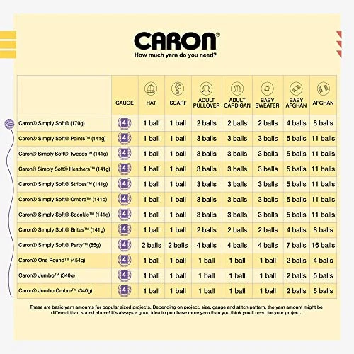 Simply Soft yarn is of the most popular, versatile worsted weight yarns. Incredibly soft to the touch, this yarn is perfect from a variety of projects from baby to fashion to home décor. Simply Soft comes in an extensive array of colors, from neutrals, to pastels, brights, speckled, ombre, as well as vibrant neons – the perfect shade for every project! With a unique sheen, this yarn works up with a fabulous, lustrous look, with a beautiful drape. Conveniently machine washable and dryable for easy care. Content: 100% Acrylic. This yarn is great for knitting, crocheting, amigurumi and craft projects. Easy to care for: machine wash and dry. Ball Size Heather, Ombre, Paints, Speckle, Tweeds: 141 g / 5 oz, 215 meters / 235 yards Gauge:#4 Worsted (Medium). Knitting Gauge: 4” x 4” (10 cm x 10 cm) 16 sts x 20 rows with 5 mm knitting needle ,Crochet Gauge: 4” x 4” (10 cm x 10 cm) 12 sc x 13 rows with 5 mm crochet hook yarn takes color inspiration from everywhere, making it easy for you to find the perfect color for your project – or inspire you to try something new! Check out the many kinds of yarns and discover a versatile yarn for knit and crochet patterns like sweaters, blankets, pillows, accessories, and more! Simply Soft yarn is of the most popular yarn options and available in many different varieties, including Simply Soft Brites yarn, Simply Soft Heathers yarn, Simply Soft Tweeds yarn, and many more types and colors. It’s a comfortable and versatile worsted weight yarn that’s incredibly soft and available in brights, pastels, neutrals, and neons. Simply Soft yarn is also easy to care for, since it’s machine washable and dryable. You couldn’t ask for a better gift than baby apparel, home decor, or garments made from Simply Soft yarns.