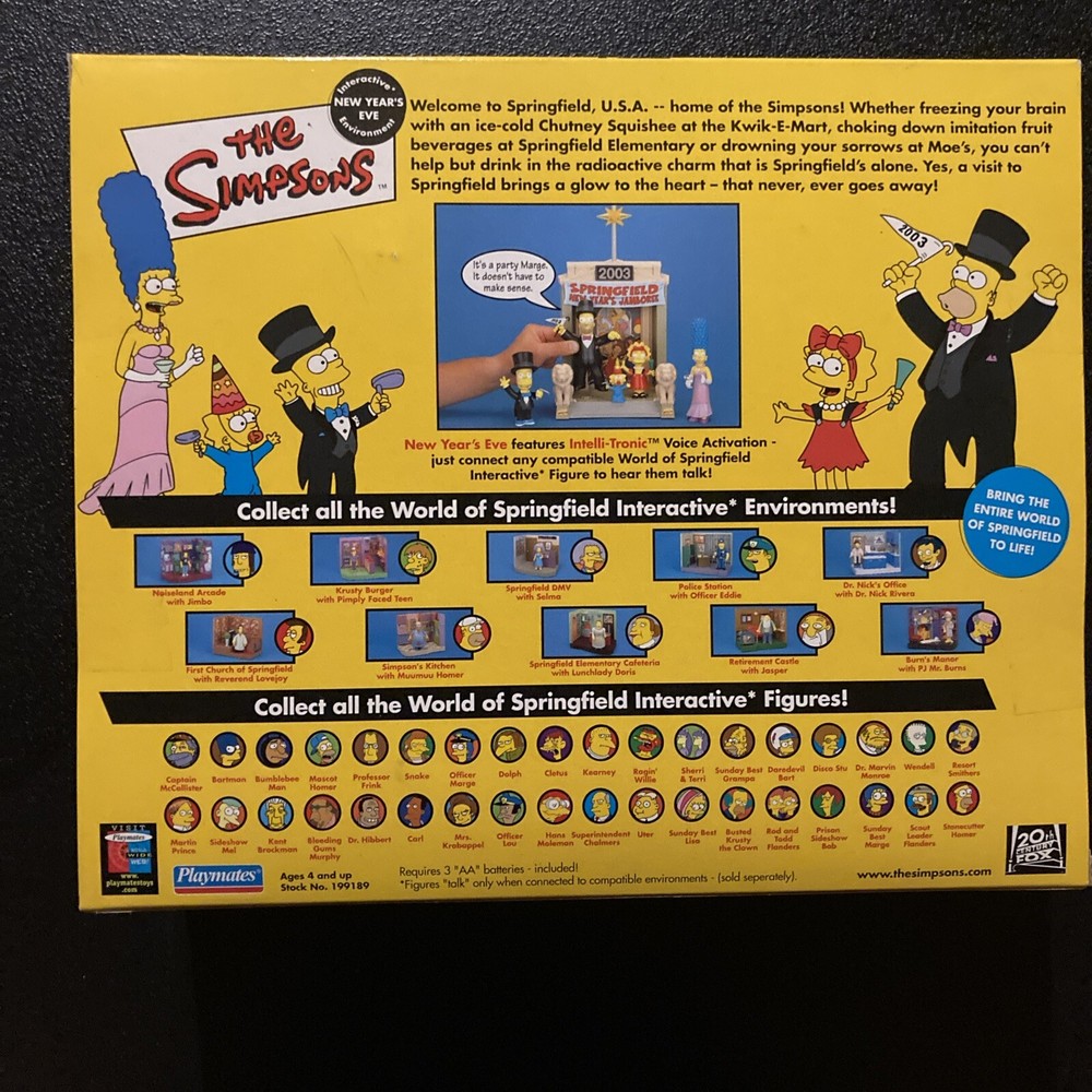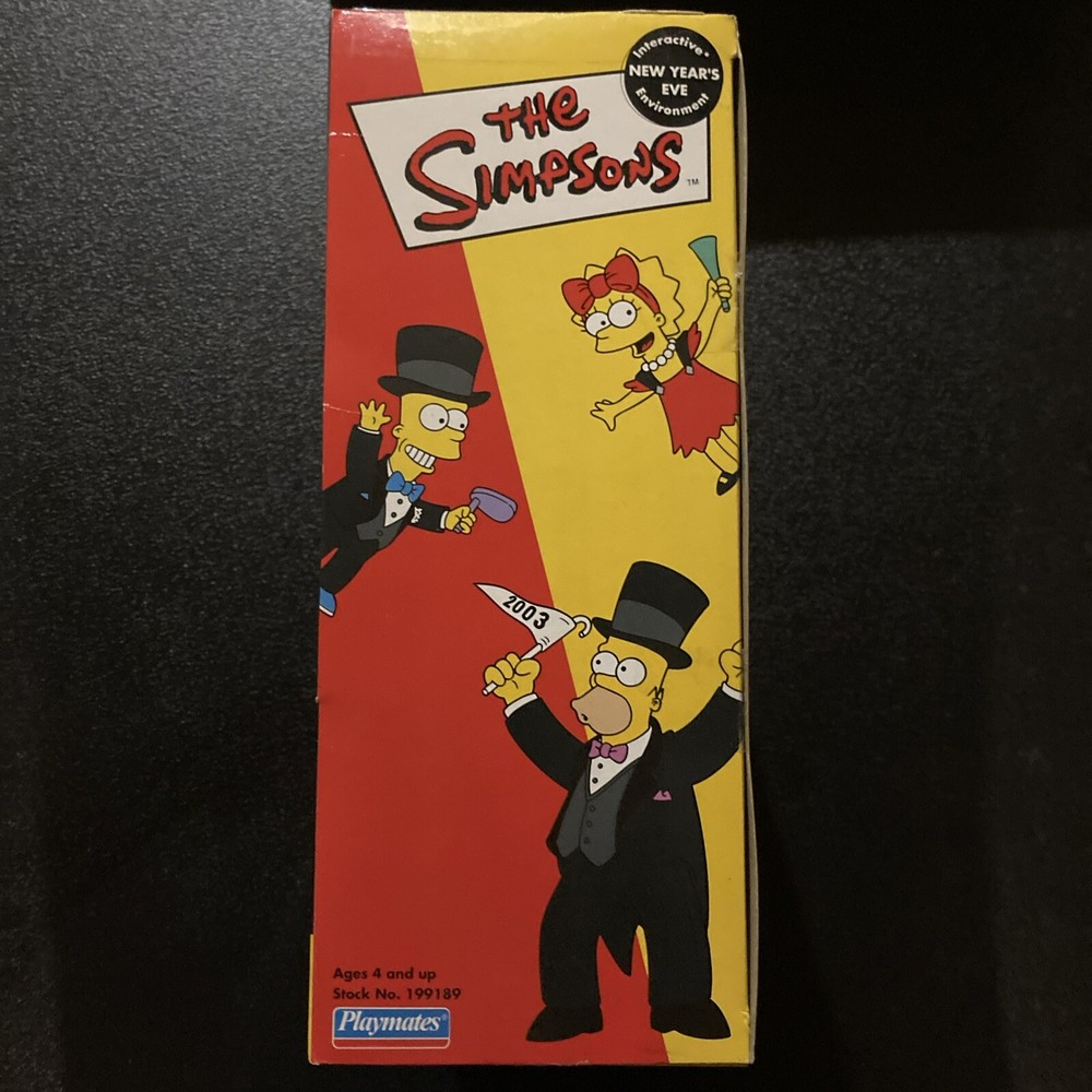 Celebrate the new year with The Simpsons Family WOS New Years Eve Interactive Environment Playmates 2003! This action figure set features the beloved characters Lisa Simpson, Homer Simpson, Bart Simpson, Maggie Simpson, and Marge Simpson in their festive attire. The 5in. plastic figures are unopened and in their original packaging, making them a great addition to any collector's display. The set also includes an interactive environment that allows fans of The Simpsons to recreate their favorite scenes from the TV show. With Playmates Toys as the brand behind this original licensed reproduction, this action figure set is a must-have for any fan of the iconic franchise. Recommended for ages 4+, this set is perfect for collectors and fans alike.