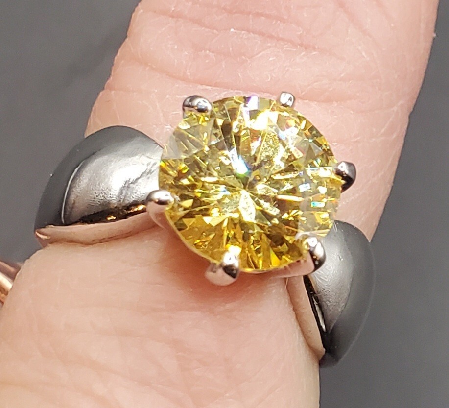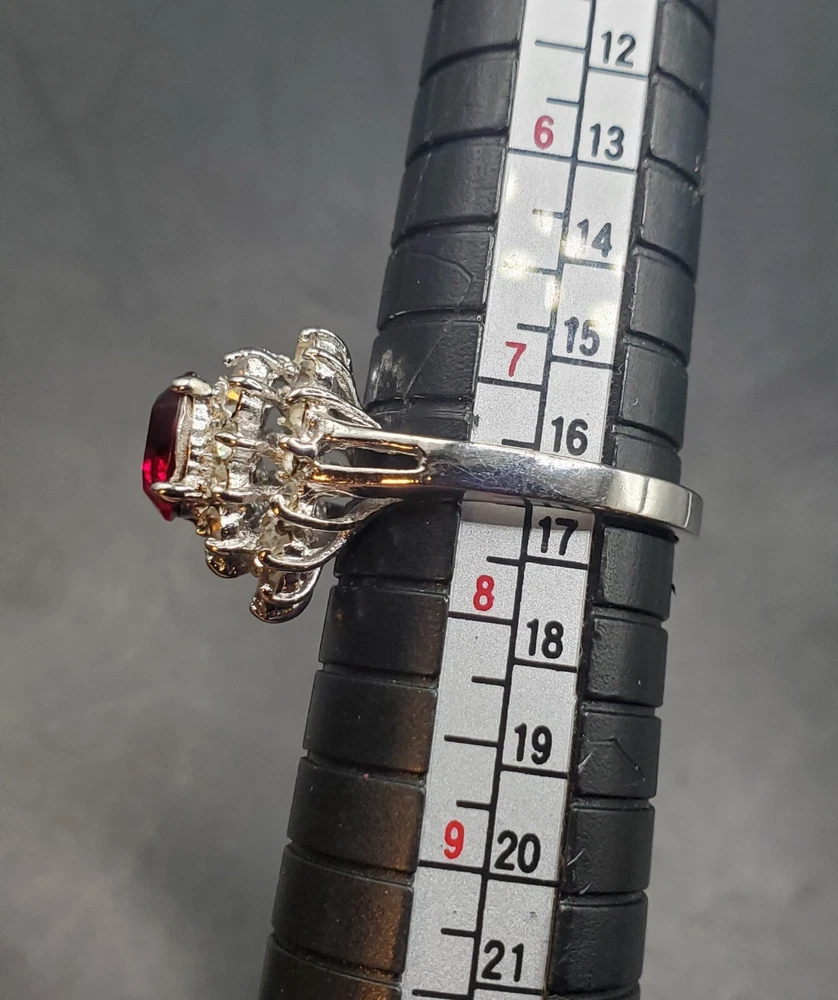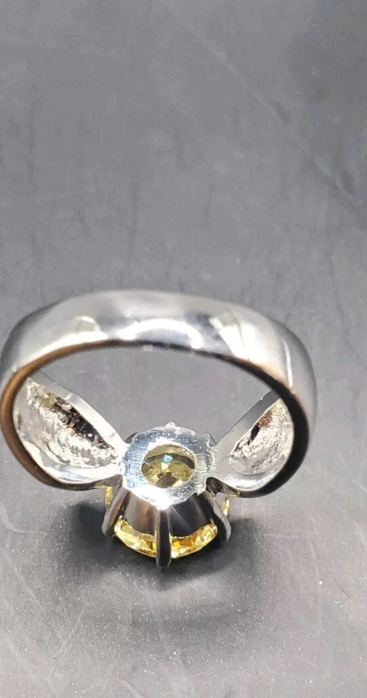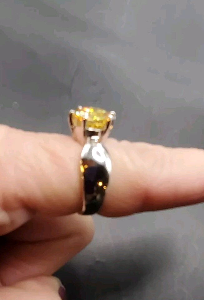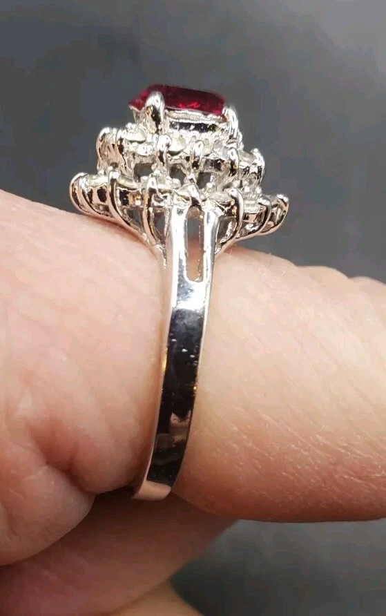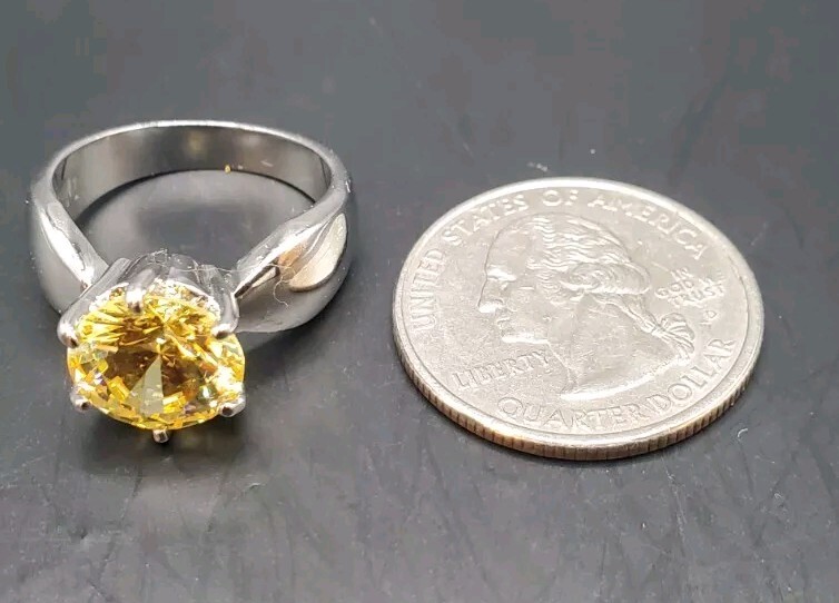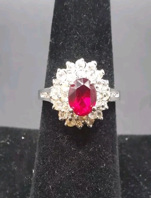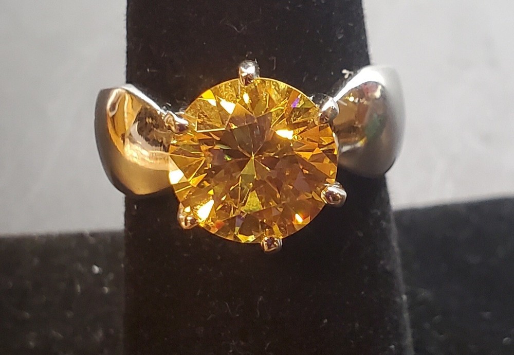 Two fashion rings, NEW without tags, both are size 7.5, price is for both rings. Large prong set simulatef citrine stone statement ring on wide silver tone band. Brilliant yellowish 9.5 mm stone reflects other colors in the light and has a starburst effect. The ring weighs 6.5 grams. Silver tone ring with prong set simulated red stone surrounded by multi tier halo of clear cubic zirconias. The stone is 7.5 mm long and the ring weighs 4.2 grams. Both rings are in new condition and are unmarked. Includes one new gold color ring gift box. I can ship multiple orders together and refund extra shipping charges paid.