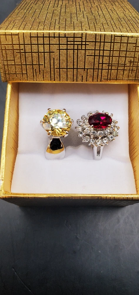 Absolutely love these stunning rings! The citrine piece has a bold, eye-catching design with a brilliant stone that shimmers in the light, while the red stone ring adds elegant flair with its dazzling halo. Both fit comfortably and look way more expensive than they are. Perfect for adding a touch of glam to any outfit—great value for two gorgeous rings!