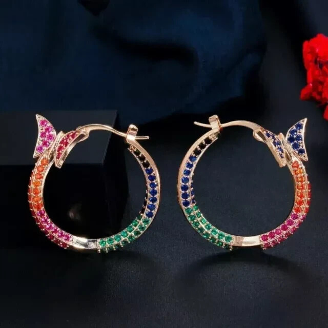 Simulated Multi Sapphire Round Butterfly Hoop Earrings in 14K Rose Gold Plate