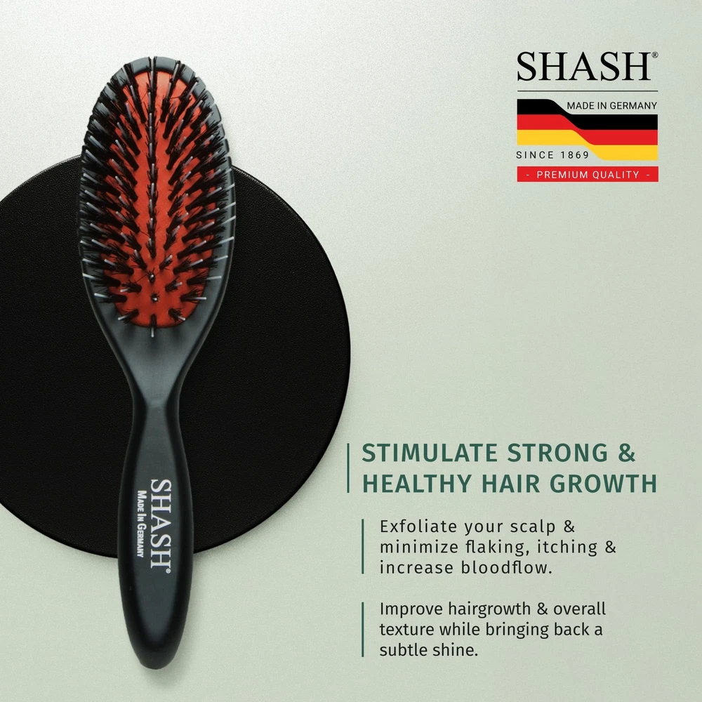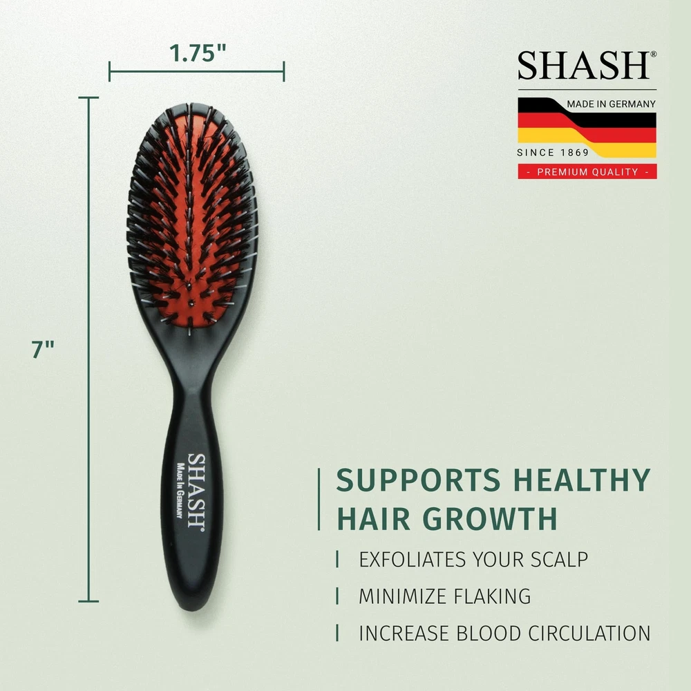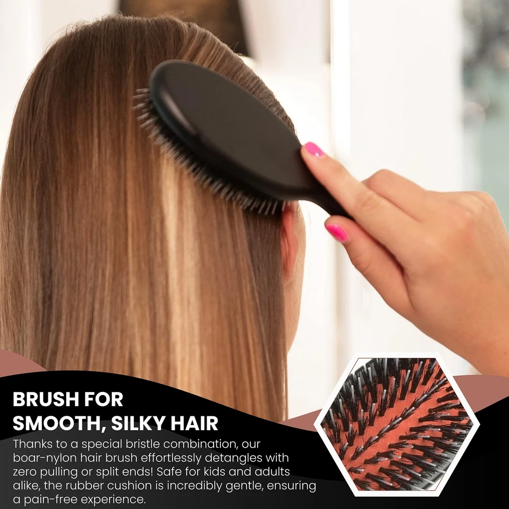 Say Goodbye to Painful Knots and Pulling! When the outer layer of hair is damaged, it opens and becomes tangled with other strands. And if you’ve ever brushed out knots, you know how painful that can be. But using the wrong brush can actually cause spilt ends, making the problem worse. Give hair the gentle care it needs with a Nylon Boar Bristle Brush from ! Featuring bundles of high quality, extra-fine boar bristles and a rounded nylon pin, it effortlessly combs the scalp to remove knots and tangles. Paired with a super-soft rubber cushion bed, it’s amazingly gentle with no pulling, pain or spilt ends. Great for men and women, it’s designed for normal to coarse hair. A natural alternative to cheap plastic brushes, our bristles help evenly distribute sebum across the scalp! Nourished and conditioned, hair is soft, smooth and never greasy. As it adds volume without creating frizz, hair is easier to manage, allowing you to achieve your go-to style. The bristles gently exfoliate your scalp, removing buildup and itchiness while promoting healthy growth. Made in Germany with eco-sourced beech wood, these brushes are in a class of their own! Several layers of sheer lacquer make them strong and long-lasting, while ergonomic handles ensure they’re a pleasure to use. It’s quality you won’t find anywhere else. Why Choose Our Nylon and Boar Bristle Brush? - Gently detangles hair without pulling - Naturally smooths and conditions hair - Exfoliates the scalp - Stimulates healthy hair growth - Made in Germany with premium materials Try Today Risk-Free with Our Satisfaction Guarantee! *Stock is limited. Order today to ensure availability. Order Your Boar Brush Now for Strong, Healthy Hair! Manual: Basic Steps for Brushing your hair: Dry or Damp Hair: For dry hair, brush gently to avoid frizz or breakage. o For damp hair, use a wooden pin brush which is designed for wet hair to minimize damage. Damp hair. Start from the bottom - Begin brushing at the ends, gradually working your way up to the roots. This prevents pulling and minimizes tangles. Brush in Sections: If your hair is thick or tangled, it’s easier to separate it into sections and work through each part methodically. - For a perfect styling it is necassary to style the hair in sections. The result will convince you. Dry hair: Stroke from the roots to the bottom of the hair. The natural hair sebum which is rich with natural oil can be spread to the bottom of the hair which often is dryer than the parts near the roots. Brush Maintenance: Clean Your Brushes Regularly: Hairbrushes can accumulate hair, oils, and product buildup. Clean them every 1-2 weeks (or more often if needed) by removing hair strands and washing them with warm, soapy water. Check for Damage: - Make sure the bristles are not bent or broken. Replace brushes that have become worn out to ensure proper care for your hair. Warnings Avoid Brushing Too Aggressively: Gentle brushing is key, especially for curly or fine hair, to avoid causing split ends or excessive breakage. Be Careful with Heat: If using heat tools with brushes, make sure to use brushes designed for hot tools (e.g., ceramic or heat-resistant brushes). Don’t Overdo It: - Brushing too much can cause damage and breakage. Brush just enough to smooth out tangles.