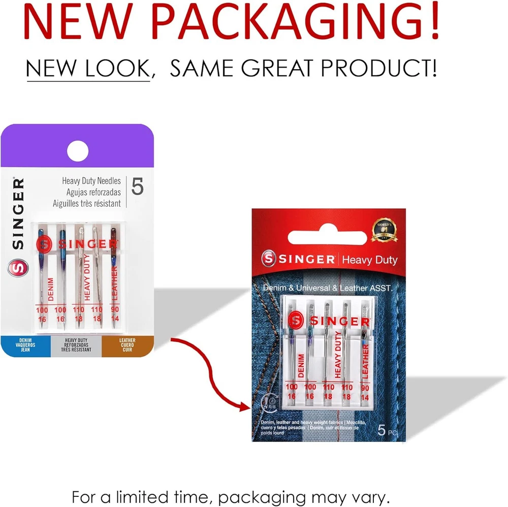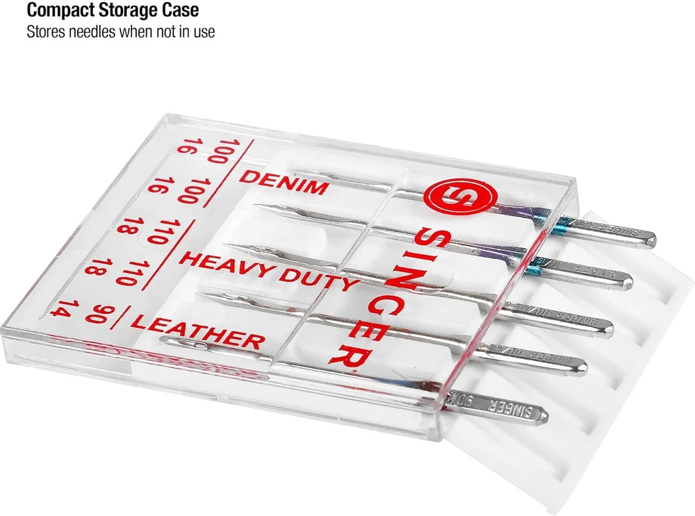 Singer 04801 Universal Heavy Duty Sewing Machine Needles, 5-Count Product Details Brand: SINGER Item Length: 4.52 Inches Compatible Devices: Domestic Sewing Machine Compatible Material: Leather Point Type: Regular Point Set of 5 heavy duty machine needles in assorted sizes Use for standard sewing projects on heavy fabrics such as denim, corduroy or leather Compatible with all quality sewing machines, including SINGER, Brother, and Kenmore brands (2) size 100/16 for medium weight denim, (2) size 110/18 for heavyweight cotton, and (1) size 90/14 for medium weight leather Machine needles come in slim and convenient case, marked with sizes on clear lid Use these SINGER heavy duty sewing machine needles when stitching heavy fabrics such as denim or leather. Assorted needle sizes allow you to choose the needle that best suits your fabric. The blue needles have a sharp point and slender eye for sewing jeans and other denim fabric. The brown needle, used with leather and vinyl, has a triangular point designed to make a clean hole in non-woven materials. Color-coded sizes of needles include: size 90/14 for use on leather, size 100/16 for use on denim, and size 110/18 for heavyweight woven fabrics. Needles come in a carrying case with sizes marked over needle slots, and can be used on SINGER, Brother, Kenmore and other quality sewing machines.