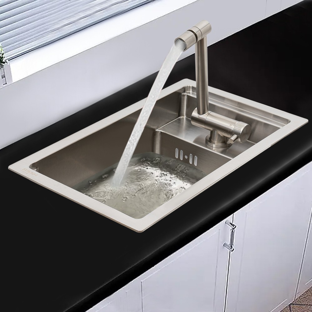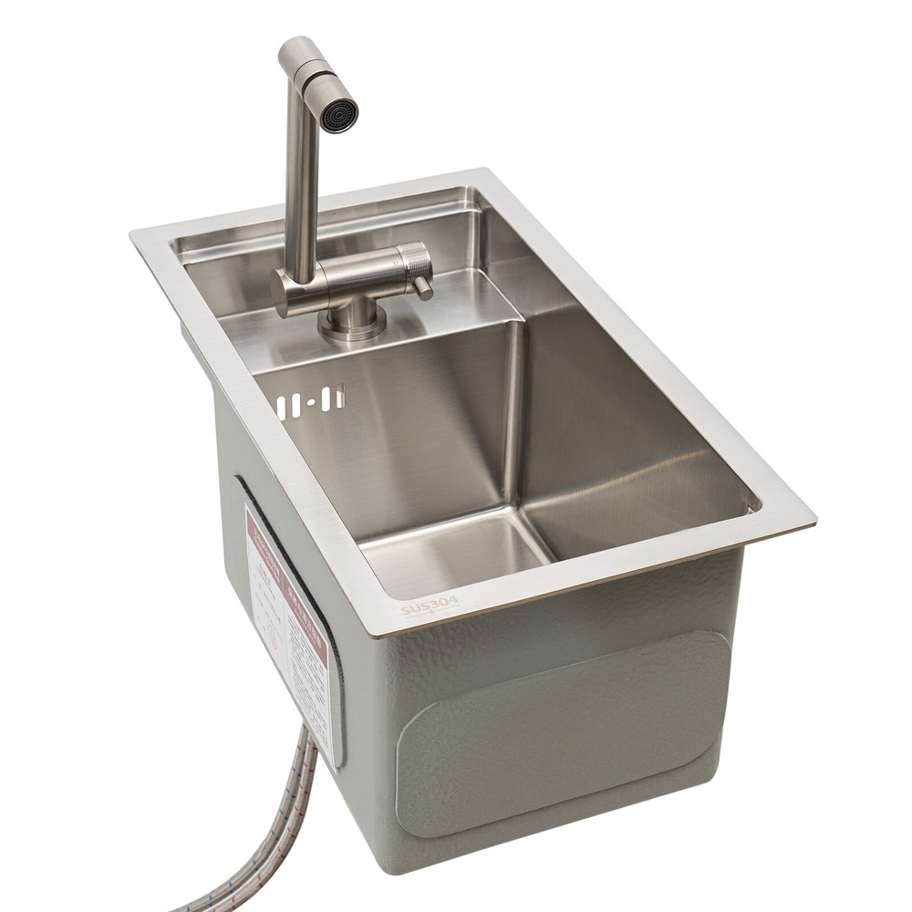 Single Bowl Bar Kitchen Laundry Sink Set Stainless Steel Hidden w/Folding Faucet Description Imagine being able to prepare food in the kitchen in the comfort of your family by simply covering the sink with a discreet design to prevent it from crowding your workspace. This remarkable product boasts several notable features that set it apart in the market. Key Features High-quality Material: The sink is crafted from high-quality brushed SUS304 stainless steel, known for its exceptional durability, corrosion resistance, and long-lasting performance. This ensures that our sink can withstand heavy daily use and maintain its elegant appearance for years to come. Expand Your Using Space: With foldable faucet and accompanying cover, the concealed sink easily blends into your countertop, creating an almost seamless and integrated look, and expanding your workspace for various kitchen activities. Multifunctional Sink: The sink comes with a hot and cold water faucet, so you can easily control the temperature of the water with the handle, either cold or hot, depending on your preference. The honeycomb bubble design of the faucet provides a soft dispense of water to prevent splashing and wetting of the countertop. Beautiful Appearance: Silver-colored sink has a metallic chic feel and the brushed finish adds a touch of sophistication to any kitchen or utility area. Its sleek and modern look not only enhances the overall aesthetics but also facilitates easy cleaning, effectively reducing the appearance of water spots and fingerprints. Sound Insulation & Anti-condensation Design: Rubber mute pads reduce water flow noise, providing you with excellent experience. The anti-condensation coating can effectively prevent the temperature difference from being too large. Easy to Drain: This sink features X-shaped water guide lines on the bottom that helps to drain quickly without clogging or splashing. Assembly in a Breeze: Complete installation accessories and a simple structure allow you to complete the assembly in a very short time! Guaranteed Customer Service: Our friendly customer service team would be happy to solve your issues with our sink. If you have any issues, feel free to reach out to us. Details R10 Rounded Corners: R10 small corner design with superior aesthetics, which improves safety and is easy to clean. Exquisite Overflow Holes: It allows you to say goodbye to water spills and keep your kitchen as clean as possible. Internal Platform: It allows you to place some cleaning utensils within reach, such as sponge wipes, detergents, to improve cleaning efficiency. Stainless Steel Drain Strainer: It easily filters leftovers, prevents clogging of the drain, and allows for smooth drainage PP Material Downpipe: It has high-temperature resistance and prevents anti-odor and anti-clogging . Handle with Plastic Protective Cover: It's easier to pull and put down and protects your hands. V-shaped Drainpipe: The v-shaped design pipe effectively isolates bad smells and prevents backwater, and clogging. Application It is suitable for kitchen, rv, wet bar, balcony, basement, yard, laundry, office or bathroom. Specifications Material: 304 Stainless Steel, PP, Plastic, Rubber Color: Silver Shape: Rectangular Surface Treatment: Brushed, Anti-condensation Coating Installation Type: Drop-In Assembly Required: Yes Number of Basins: 1 Sink Countertop Load-bearing Capacity: 5kg/ 11.02lbs Sink Load-bearing Capacity: 20kg/44.09lbs Gross Weight: 7.62kg/16.8lbs Sink Size: 43×25×22/16.9×9.8×8.7in Cover Size(L*W): 38.6×20cm/15.2×8in Package Size: 52×37×41cm/20.5×14.6×16.1in Package Included 1* Sink 1* Cold and Hot Faucet 1* Cover 1* Drain Strainer 1* Chinese Manual All Accessories for Installation Notes To increase the life of the sink, please do not scratch its surface with sharp objects. Please allow the slight color difference caused by the shooting light and 1-3cm error due to manual measurement, and make sure you do not mind before you order. Payment Delivery details Terms of sales About us Contact us Payment We accept ebay payment 。 Fees such as import duties, taxes are not included in the item price or shipping costs. These charges are the buyer's responsibility. Delivery details Shipping: 2-9 working days to: USA Terms of sales We maintain high standards of excellence and strive for hundred percent customer satisfaction. Feedback is very important to us. We hope that you contact us immediately before you give neutral or negative feedback, so that we can address your concerns. It is impossible to address issues if we do not know about them! About us Your satis faction is our ultimate goal. We work hard to earn your trust and future business. Our certified technicians have tested each item before shipping. The unit comes with 1 year limited warranty on all manufacturing defects. a) If you receive a defective item, you may return it or ask for a discount. Please contact us within 14 days after you receive the package. b) What you returned must be intact and in its original packaging as re? u. Customer is responsible for shipping costs of the returned item. c) We will cover the cost of shipping back t with the shipping rate indicated in the registration page. We will send you a new unit or refund the full payment you paid. Thank you. Contact us Business Hour Business Hour: Monday To Friday: 8:30 AM to 5:00 PM (Beijing China time) Due to time zones, our reply to your questions may not be immediately. But within above working time, we will reply your email within 24 hours. If it's non-workdays, please kindly be patient and wait till Monday. Please contact us with ebay message. Please feel free to contact us if you have any questions. Monday To Friday: 8:30 AM to 5:00 PM (Beijing China time) Due to time zones, our reply to your questions may not be immediately. But within above working time, we will reply your email within 24 hours. If it's non-workdays, please kindly be patient and wait till Monday. Please contac
