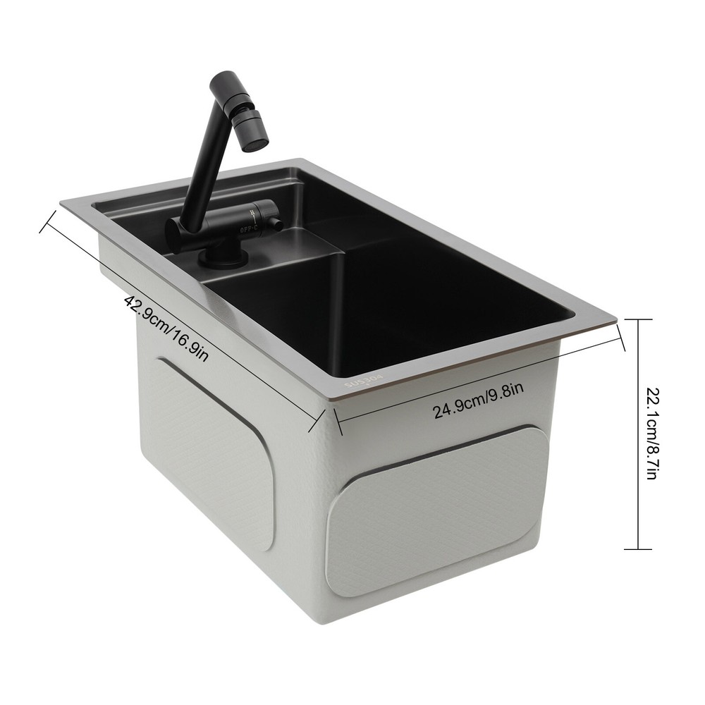 Single Bowl Kitchen Bar Sink Hidden Drop-in Kitchen Sink with Folding Faucet New Description Traditional sinks always have various problems, such as being too small, difficult to clean, and breeding bacteria. This stainless steel utility sink is made of 304 stainless steel and adopts a wire drawing and black diamond nano processes. It has a super large capacity and is oil-resistant, scratch-resistant, and high-temperature-resistant. With it, you can enjoy a more convenient and healthy life. Key Features Build to Last: High-quality stainless steel and exquisite black diamond nano and wire drawing processes make this item solid and have excellent corrosion resistance, oxidation resistance, and wear resistance , so it can withstand high-volume fast-paced commercial kitchen environments. Huge Space: The large storage space(16.9*9.8*8.7in) can accommodate a large number of plates at the same time, making it easy for you to clean after a gathering. Sufficient depth also reduces water splashing. Careful Design : The back is equipped with a sound-absorbing pad to reduce noise and a waterproof v apor condensation coating, which can keep it dry and clean for a long time without moisture regain. The foldable faucet with dense water outlets (360-degree rotation) (up and down 90 degrees) can bring you a more comfortable experience and reduce space occupation. Excellent Drainage: The multi-tier sealed and thickened U-shaped PP drainage pipe (inner diameter 3.54 inches, outer diameter 4.33 inches) that can resist deformation e ven when bent, and the detachable filter basket ensure faster drainage, reducing food and debris blockage and odor backflow. Easy to Clean : The smooth and oil-resistant surface and streamlined rounded corners allow you to easily clean it with water, a soft towel, and neutral soap. Simple Installation: Complete accessories and a simple structure greatly reduce installation difficulty and save installation time. You can also choose to install it on or in the countertop according to your needs, which is more convenient. Practical Accessories: The lid with hanging holes can effectively reduce the entry of dust and insects, and it is also convenient to hang on the wall, saving space. High-quality Service : We are committed to providing high-quality service. If you encounter any problems, please do not hesitate to contact us. Details Ceramic Valve Core: It has excellent explosion-proof performance and precise control of cold and hot water, ensuring safe, reliable, and leak-free operation. Sealing Ring : Multiple sealing rings can effectively reduce water leakage and save costs. Convenient Knob: This clearly marked handle allows you to adjust the temperature more conveniently. Overflow Hole : When water is full, it is discharged from the overflow port, effectively solving the problem of overflow. Application This product can be widely used in homes, restaurants, dessert shops, coffee shops, hotels, garages, gardens, pet shops, etc. for cleaning tableware, vegetables, fruits, pets, etc. Specification Material: 304 Stainless Steel Material of the Water Pipe: PP Color: Black Style: Modern Shape: Rectangular Surface Treatment: Wire Drawing and Black Diamond Nano Shape: Rectangle Installation Method: Countertop, Countertop Middle Assembly Required: Yes Number of Items: 1 Number of Hoses: 2 Swivel Angle of Faucet: 90 Degrees Rotation Angle of Water Outlet Nozzle: 360Β° Gross Weight: 7.62kg/16.8lbs Hose Length: 60cm/23.62in Inner Diameter of the Water Pipe: 90mm/3.54in Outer Diameter of the Water Pipe: 110mm/4.33in Product Size: 42.93*24.89*22.1cm/16.9*9.8*8.7in Package Size: 52*37*41cm/20.47*14.57*16.14in Package Included 1*Stainless Steel Utility Sink 2*Hoses 1*Chinese Manual All Accessories Required for Installation Notes Please confirm the appropriate size before purchasing. Please wear protective gloves during installation to avoid injury. The anti-condensation tier has the function of protecting the water tank from collision and deformation during transportation, so a small amount of detachment is a normal phenomenon and does not affect normal use and appearance. Besides, there may be some slight production marks on the surface of the product. Please allow the slight color difference caused by the shooting light and the 1-3 cm error due to manual measurement, and make sure you do not mind before ordering. Welcome!πŸ˜„ If you have some problem, please contact with us.πŸ˜„πŸ˜„ Payment Delivery details Terms of sales About us Contact us Payment We accept ebay payment 。 Fees such as import duties, taxes are not included in the item price or shipping costs. These charges are the buyer's responsibility. Delivery details Shipping: 2-9 working days to: USA Terms of sales We maintain high standards of excellence and strive for hundred percent customer satisfaction. Feedback is very important to us. We hope that you contact us immediately before you give neutral or negative feedback, so that we can address your concerns. It is impossible to address issues if we do not know about them! About us Your satis faction is our ultimate goal. We work hard to earn your trust and future business. Our certified technicians have tested each item before shipping. The unit comes with 1 year limited warranty on all manufacturing defects. a) If you receive a defective item, you may return it or ask for a discount. Please contact us within 14 days after you receive the package. b) What you returned must be intact and in its original packaging as re? u. Customer is responsible for shipping costs of the returned item. c) We will cover the cost of shipping back t with the shipping rate indicated in the registration page. We will send you a new unit or refund the full payment you paid. Thank you. Contact us Business Hour Business Hour: Monday To Friday: 8:30 AM to 5:00 PM (Beijing China time) Due to time zones, our reply to your questions may not be immediately. But within above working time, we wil