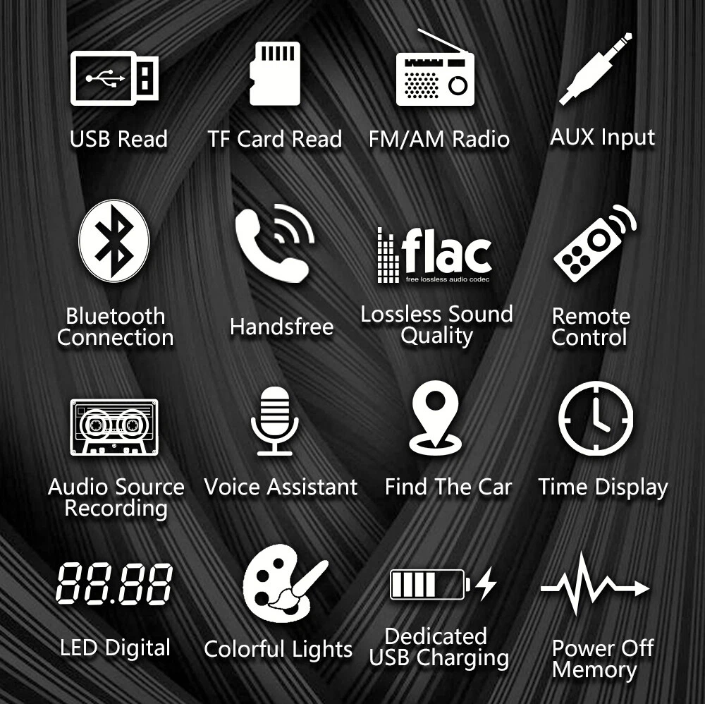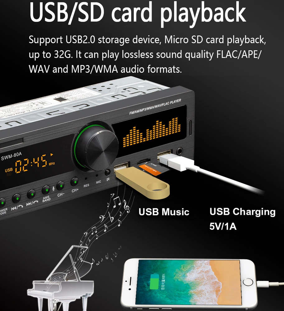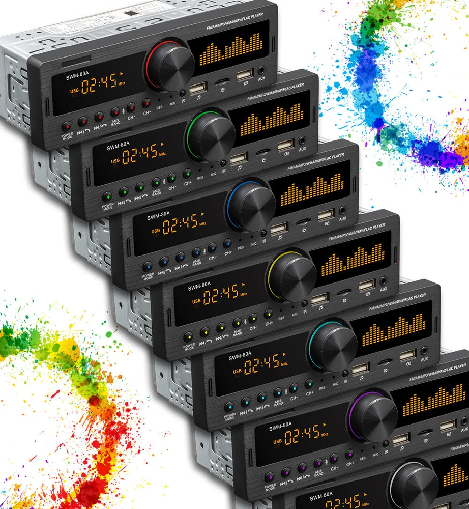 Features: Bluetooth + built-in microphone 2 USB, USB fast charging Support for hands-free calls. Support car locate via smart-phone APP. Support advanced audio transmission mode. Support the clock indicating that the power is off. High-quality digital stereo AM/FM radio Radio frequency:FM(87.5~108MHz)/AM(522~1620KHZ) Support for USB / TF card reader Audio support: MP3 / WMA / WAV formats and so on. Support folder reading function Support for remote control. Electronic rotary volume control MP3 playback supports pause / preview / repeat / random play and 10 up / down selections. Electronic type bass / treble / left and right balance / front and rear balance volume control Front AUX audio input port Rear L / R terminal RCA audio output port. 4-track high-power output (4 high-power speakers) Working voltage: DC12V Radio: Model: SWM-80A Main function: MP3, 2 USB, TF interface, AM, FM, Bluetooth, auxiliary input Audio format: MP3 / WMA / WAV formats and so on. Amplifier output power / channel: 60W x 4 Interface: 2 USB / TF / AUX IN Input voltage: 12V Bluetooth version: V4.0 Dimensions: 183mm (L) x 53mm (H) x 60mm (W) Note: 1. This car multimedia player is compatible with all cars. Please check the size of the product. 2. Installation requires knowledge of electronic products. Please install it with professional help. 3. If you are unsure whether this model is suitable for your car or not, you can send a message to our customer service for assistance. Package Included: 1x car stereo 1x remote control 1x power cable 1x English user manual 1x mounting kit Shipping 1. We ship to Worldwide,e xcluded some far away places. 2. We only ship to confirmed PAYPAL address; your PAYPAL address must match your Shipping address. 3. Any non-received items caused by invalid address registered on PayPal are not in our full refund or replacement policy. Shipping fee has including the local handing and packaging fee. 4. All the items will be shipping within 1-2 working days after receiving the payment, except some holidays. 5. When the shipping method is express delivery, some areas need to pay remote fees to the courier company. Taxes, Customs & Duties 1. Some countries are required to collect customs duties. Please confirm your local customs duties before placing orders. 2. We will not be responsible for any custom delay or tax, because transit time is highly depended and provided by postal Service. Returns 1. If you have not satisfied as you received the item, please return it within 30 days for a replacement or money back. Please contact us before you return it. 2. All returned items must be in the original packaging with all components and accessories included, and you must provide us the return shipping information (The shipment or the tracking number) 3. Return shipping fee is to be paid by the buyers. We will not be responsible for any custom duty or import tax. Warranty 1.One Year Manufacturer's Warranty for defective items (excluding items damaged and/or misused after receipt). 2.Defective items must be reported and returned to us within the warranty period (and in the original packaging, if possible). You must tell us what the defect is and give us your eBay ID. We do not repair or replace items with an expired warranty. Feedback