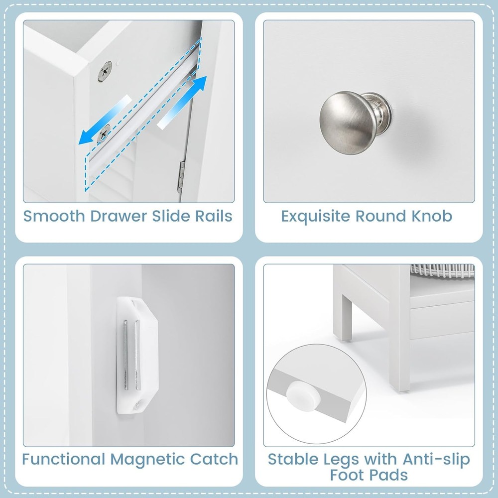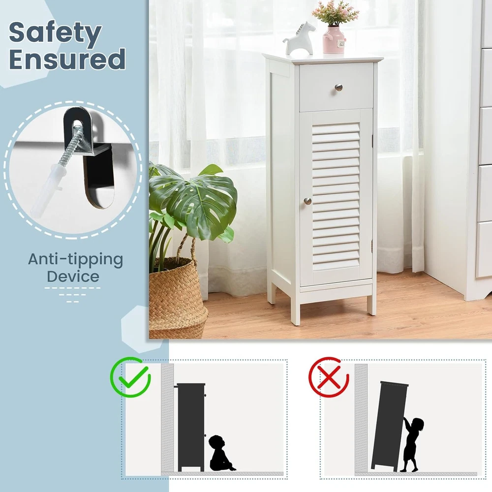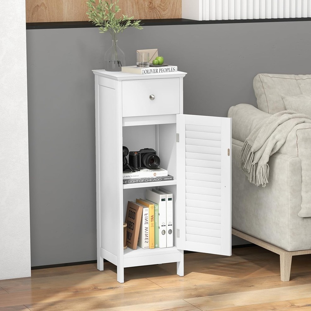Product Description About this item [Sufficient Storage Space]: This bathroom floor cabinet can keep clutter away and make you room clean and tidy. The flat top is perfect for displaying your favorite home decor items or placing your most-used items for easy access. In addition, 1 door cabinet and 1 drawer keep towels, toiletries, books and other sundries organized. [Stability & Safety Ensured]: Made of durable MDF and engineered wood and supported by 4 stable legs with anti-slip foot pads, this storage organizer ensures great stability and durability for long term. More importantly, the floor cabinet can be fixed to the wall with the included anti-tipping device for added safety and stability. [Adjustable Shelf Design]: The 3-position adjustable shelf inside the cabinet provides large and customized storage space for items of different sizes. What’s more, additional features like the smooth drawer slide rails, exquisite round knobs and functional magnetic catch help you open the drawer and cabinet easily. [Easy Assembly & Wide Application]: With detailed instructions and simple structure, our floor cabinet is easy to assemble in a short time. With a compact size of 13" x 12" x 34.5" (L x W x H), this slim cabinet is perfect for small spaces. It can be widely used in your living room, bathroom, entryway, hallway and more. [Elegant Look & Easy Maintenance]: With smooth painted finish and polished silver knobs, this bathroom cabinet boasts timeless, classic style that adds stylish storage space to your rooms. The elegant louvered door can promote air circulation while bringing elegance your home. Moreover, the waterproof surface is easy to clean with a cloth. Something We’d Like to Share: Maximize storage and display space in your home with this single door floor cabinet. With spacious tabletop, a drawer and a cabinet, this bathroom floor cabinet is perfect for storing toiletries and towels and displaying decorative accents. This storage cabinet is designed with a single shutter door that elevates the look and but also promotes ventilation. The inner shelf is adjustable in 3 positions, ideal for storing a variety of items of different sizes. Made of premium MDF and 4 sturdy legs, this single floor cabinet ensures long-lasting use. Its modern elegant look fits into any room types and designs. This storage unit can be placed anywhere in your home – kitchen, bathroom, living room or entryway to offer additional storage space. Specifications: Color: White/Grey Material: MDF, Engineered Wood Product Dimension: 13" x 12" x 34.5" (L x W x H) Adjustable Height of Shelf: 2.5" Raised Bottom Height: 3" Net Weight: 20 lbs Package Includes: 1 x Bathroom Floor Cabinet 1 x Instruction On Aug 14, 2025 at 20:04:19 PDT, seller added the following information: