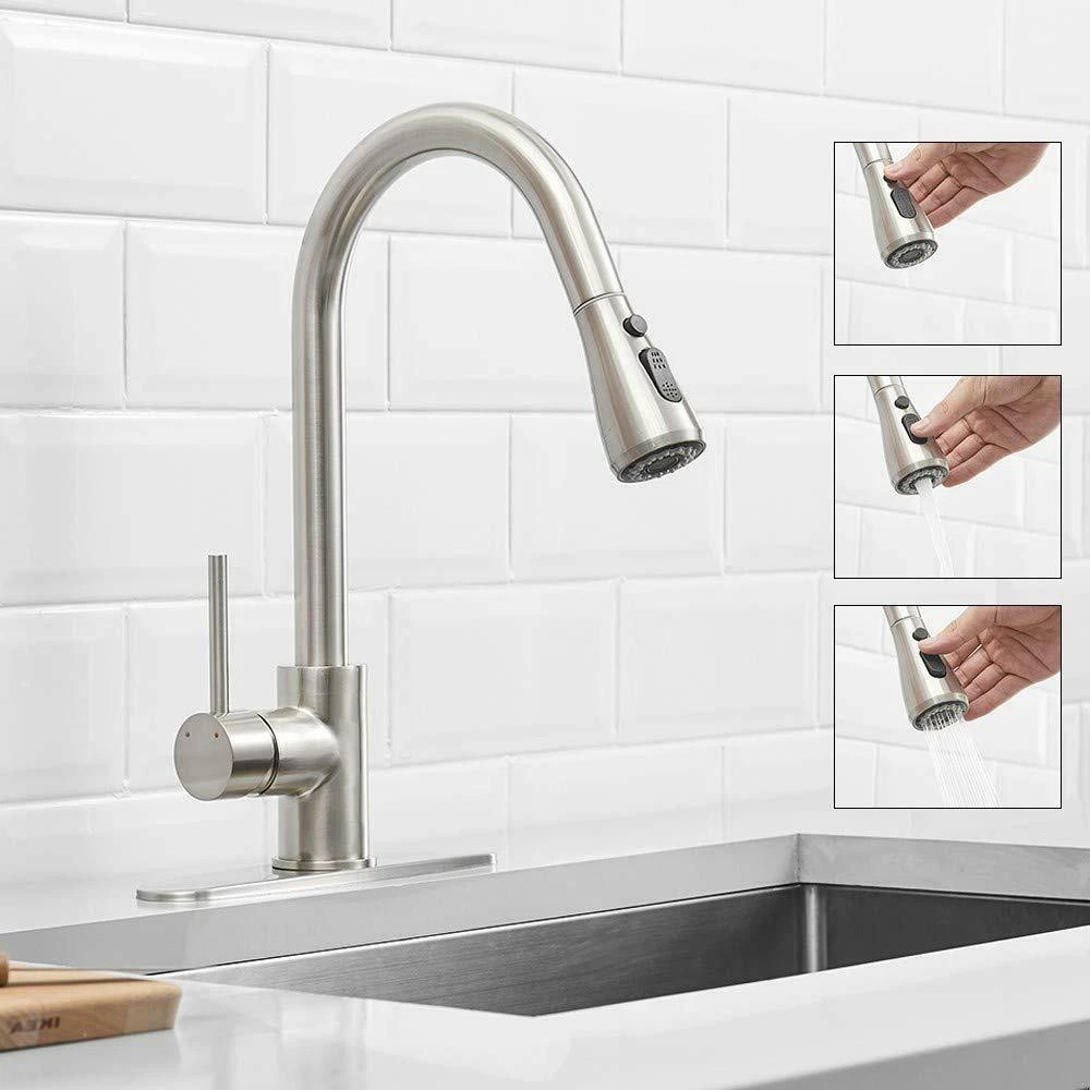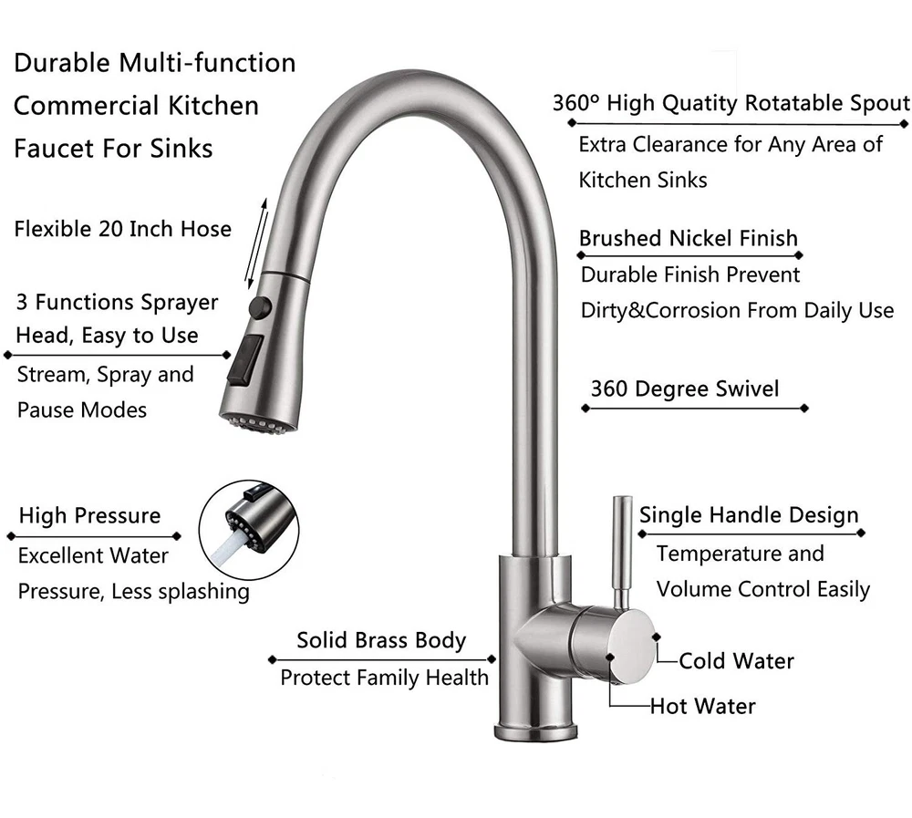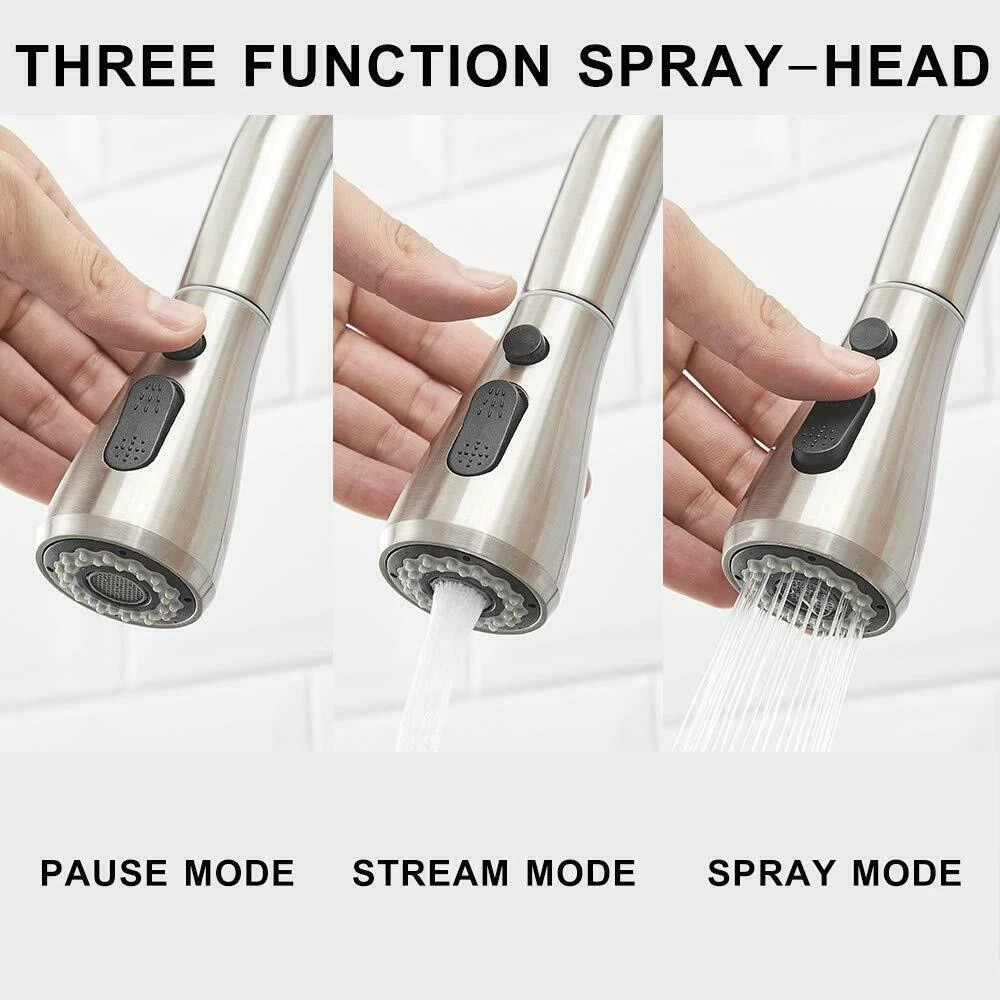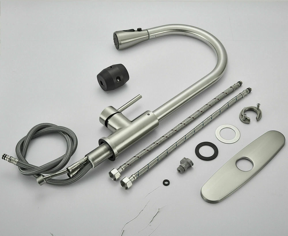 Product Description Function: Kitchen Sink Faucet Feature :Swivel Spout,pull down sprayer Finish: Brushed Nickel Number of Handles: Single Handle Installation Holes: One or Threee Holes Faucet Total Height: As picture shows Valve Type: Ceramic Valve Faucet Body Material: Stainless Steel Faucet Spout Material: ABS Faucet Handle Material: Brass With 2 pipes for cold and hot water(40cm) Water Feature:Mix Hot and Cold Water Pressures:Minimum 0.5 bar, 1.0 bar recommended Water Flow: 1.8 GPM 5 Years warranty Safety first - all bathroom faucet and commercial faucets designed for drinking water use are fully compliant with the latest federal and state lead-free standards Easy to install. Swivel Spout can make the faucet fit for double bowl kitchen sink This is a multi-attribute link, we will ship according to your choice, please choose the option you want before buying! Payment Only PayPal is Accepted. Immediately payment is required after the Winning Bid or Buy it Now Shipping Usually shipment can be arranged within 1 working days after receiving payment. We usually ship by Fedex ,UPS,China Post. Usually the delivery time is 7-20 days. Remote areas will needs extra shipping cost and more time. We ship according to the address on PayPal. (After you make the payment, PayPal will send us an email automatically, informing us the payment and shipping address.) So please make sure your address on PayPal is the right one.We do not ship to PO.BOX address Mail transit time is best estimated, but not guaranteed. As transit time varies. Contact us Shipping damage has to be reported within 7 business days of which the product was delivered. If you have any questions, please be free to contact with us by eBay massage,we will answer your questions ASAP. Feedback I describe items as well as I can. If I have missed something, please let me know. Please e-mail me before leaving feedback if you are unhappy with your item, so we can work it out. International Buyers – Please Note: Import duties, taxes, and charges are not included in the item price or shipping cost. On Jun-05-21 at 02:34:11 PDT, seller added the following information: ????? We hope our products and our service can give you a wonderful experience ?????
