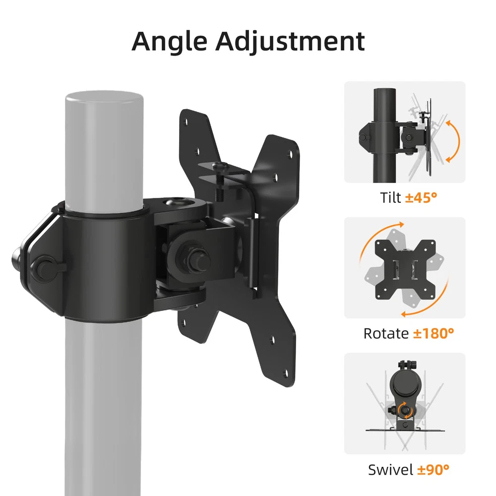 Compatibility: The vesa pole mount bracket fit most desk monitor mount and stand,fit 1.375” (3.5cm) diameter center pole.Fit monitor up to 27”, 10kgs/22lbs and Mounting Holes size 75x75mm and 100x100mm ±90° tilt,360° rotation make this monitor pole mount bracket fully adjustable. What you need for installation this head sleeve is all included in the package. Please us for sure if you have any questions about it.