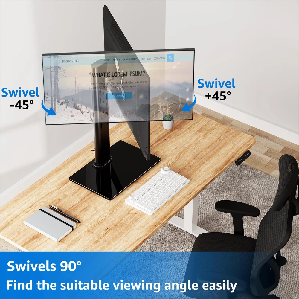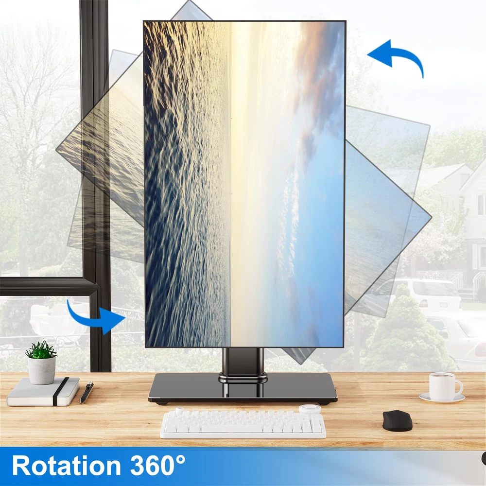 Universal Compatibility - single monitor stand holds 13,15,17,19,21,23,27,30 and 32 inch LCD LED flat or curved screens, supports up to 17.6 lbs, compatible with VESA patterns 75x75 mm and 100x100 mm. Designed with a solid tempered glass base that holds your monitor securely and steadily on your desktop Ergonomic Design - Comes with adjustable bracket offering tilt +30°/- 30°, swivel +45°/- 45°, rotation 360°, and height adjustment up to 6.89" to fit different sitting or standing positions. The free-standing design is more convenient and no need for drilling any grommet hole or using any clamp.VESA mount offers improved viewing comfort for you Free up more workspace - It's time to say goodbye to messy desktops! This single monitor stand comes with cable management to keep cords clean and organized. It also lift your monitor away from your desktop, freeing up valuable space for other items and making your desk neater and visually more comfortable. And with foot pads to prevent skidding while protecting the desk from scratches Healthy Working Style - This single monitor stand raises monitors to eye level, improving posture, correcting your working posture. Every small step you take will be the foundation for a healthy lifestyle Effortless Assembly - Easy to install within 10 mins without any hassle and comes with an instruction.We provide all the necessary hardware and instructions for simple assembly. Please feel free to contact us with any questions