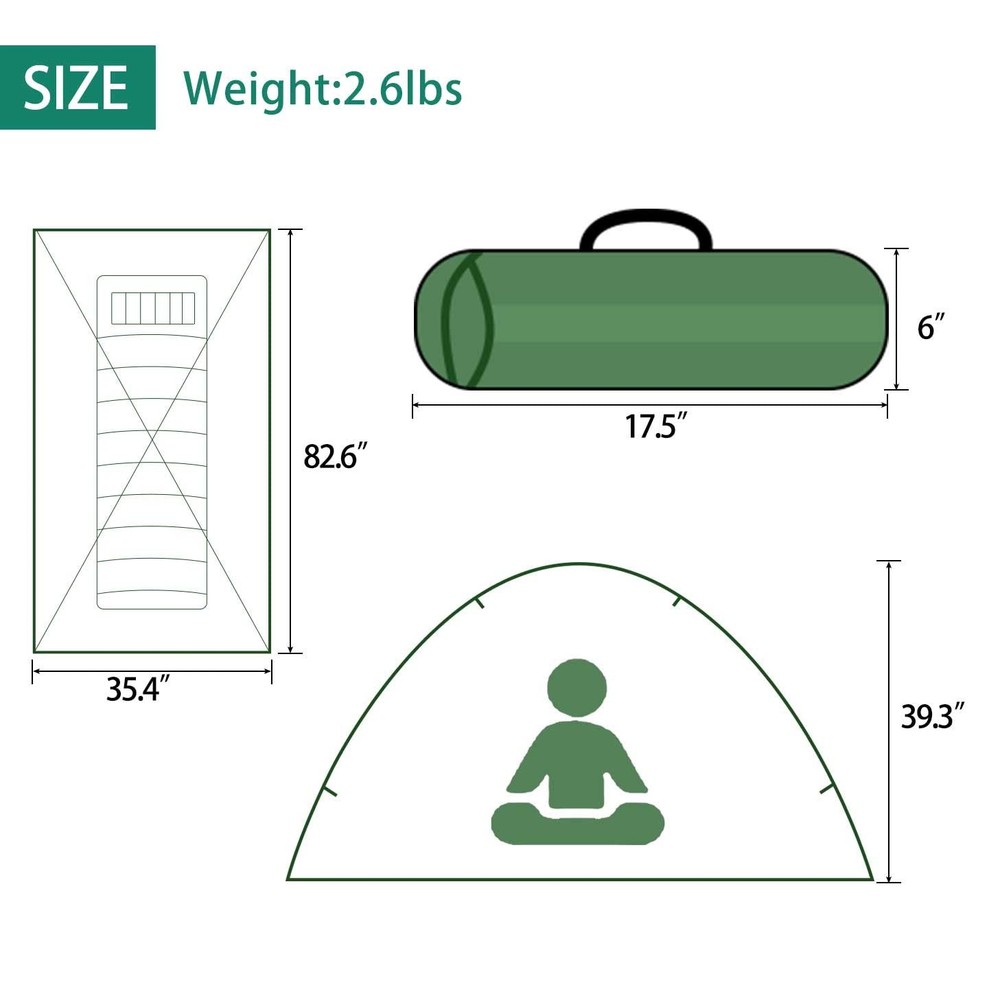 We heared your voice! Upgraded Tent - material, size, durability, and function have been improved! [Material]: Bottom sheet is made of 210D nylon fabric, water pressure resistant up to 5FT. Camouflage fabric is made of 210T Oxford. [Large Space]: Much More Space! Single Tent Size: 82.6"L x 35.4" W x 39.3" H / 210cm L x 90cm W x 100cmH. Double Tent Size: 82.6" L x 55" W x 41.3" H / 210cm L x 140cm W x 105cm H [Function]: Added top hanging hook is convenient for hanging lantern. Stronger nylon mesh is used for the entrance and ceiling, with excellent ventilation. [Portability]: Single tent weighs approx. 3lbs, Double tent weighs ~4lbs. Easy to install and carry. Can fit into your backpack. Perfect for backpacking, camping, bicycle & motorcycle touring, musical festivals, beaches, mountain climbing and other outdoor activities. Please feel free to contact us if you are not happy with the tent, we will provide you a satisfied solution.