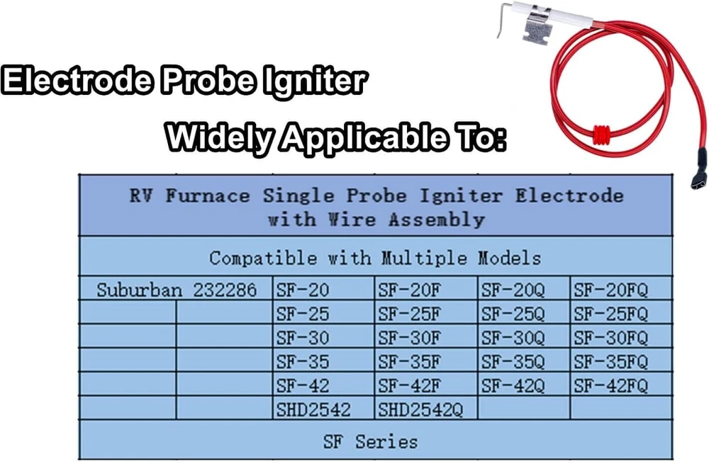Single Probe Gas Furnace Igniters Electrode with Wire Assembly,Fit For 2Pack Product Details Manufacturer: LDCRE Item Weight: 2.57 ounces Product Dimensions: 27 x 2 x 1 inches Country of Origin: China Item model number: suburban 232286 electrode (SF Series) Color: 2Pack Included Components: Case Batteries Included?: No Batteries Required?: No Brand: LDCRE Color: 2Pack Manufacturer: LDCRE Power SourceStyle: Gas PoweredIndoor Installation [ RV Furnace Parts For Suburban ]: the Rv Water Heater Replacement Parts is a Local Sense Electrode Spark Probe for Suburban Furnace , It is a Necessary Accessory for Safe Operation of camper furnace [ For suburban furnace parts Compatibility ]:The Rv Furnace Igniters Compatible With Suburban 232286 SF-20/ SF-25/ SF-30/ SF-35/ SF-42/ SF-20F/ SF-25F/ SF-30F/ SF-35F/ SF-42F/ SF-20Q/ SF-25Q/ SF-30Q/ SF-35Q/ SF-42Q/ SF-20FQ/ SF-25FQ/ SF-30FQ/ SF-35FQ/ SF-42FQ/ SHD2542/ SHD2542Q ( SF Series ) [ Easy To Install ]: The ignition needle is very easy to install, just remove the old Gas Furnace igniter and install the new one in the original position; You can also search for installation videos on the internet if you are not sure how to install [ Reliable Replacement Part ]: Designed for your RV Furnace , the spark and sensor electrode can provide reliable performance for your RV Furnace , keeps the water heaters in top condition and provides you with hot water efficiently [ Note ]: The Electrode Only Fit for Above Serial Number 934701426