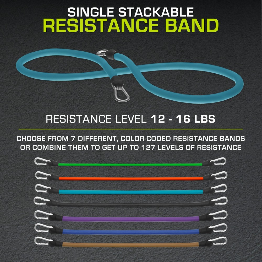 Resistance Bands are perfect for anyone who wants to stay fit but can’t make it to the gym. simple band with detachable handles can be used for a variety of toning exercises and stretches. Depending on where you place it, stand on it, or an-chor it in a doorway, you can perform a full body workout with exercises like back rows, chest presses, shoulder raises, bicep curls, and leg extensions. Elastic bands allow you to work muscles from different angles with a greater range of motion than with tradition-al weight training machines for improved strength, balance, and coordination. Available in 7 color-coded resistance levels from 5 to 50 pounds, they are an excellent tool for any level of fitness. Easy-to-use metal carabiners allow you to clip bands together for heavier resistance as needed. Each resistance tube is 48-inches long with cushioned foam handles for a comfortable grip. A door anchor is included so you can take your workout anywhere! Perfect for use with P90X, Pilates Slimin6, Insanity, Yoga and other training programs. The heavy duty, double-dipped latex material is durable yet light-weight. Compact and hassle-free, it’s the perfect solution for anyone trying to stay fit and healthy while on the run. Resistance Levels Green- 5 to 8 pounds Red- 8 to 12 pounds Blue- 12 to 16 pounds Black- 16 to 20 pounds Purple- 20 to 30 pounds Navy- 30 to 40 pounds Brown- 40 to 50 pounds COLOR-CODED RESISTANCE - 7 color-coded bands are sold individually but can be combined using durable metal carabiners to provide up to 23 levels of resistance DURABLE CONSTRUCTION - Made with a double-dipping process ensures these heavy duty, high performance latex tube bands prevent breaking and overstretch-ing with normal use VERSATILE & EASY TO USE – Just band can strengthen and tone all of your muscles through a full range of motion. Ideal for home workouts, Pilates exercises, P90X, rehabilitation, outdoor workouts and travel – use them anywhere! FEATURES - Includes 2 soft foam handles for superior comfort, door anchor and exercise guide. Great for shoulder raises, chest presses, back rows and more; WEIGHT & SIZE: Measures 48-inches long and offers approximately 12-16 pounds of resistance. Simple clip-on system makes it easy to stack weight to keep workouts challenging and work various muscle groups.