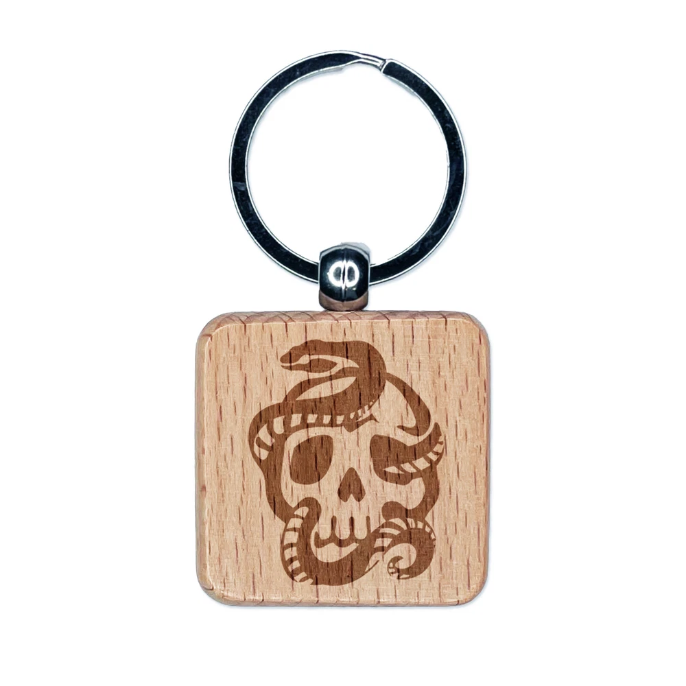 Sinister Skull with Snake Serpent Engraved Wood Square Keychain Tag Charm