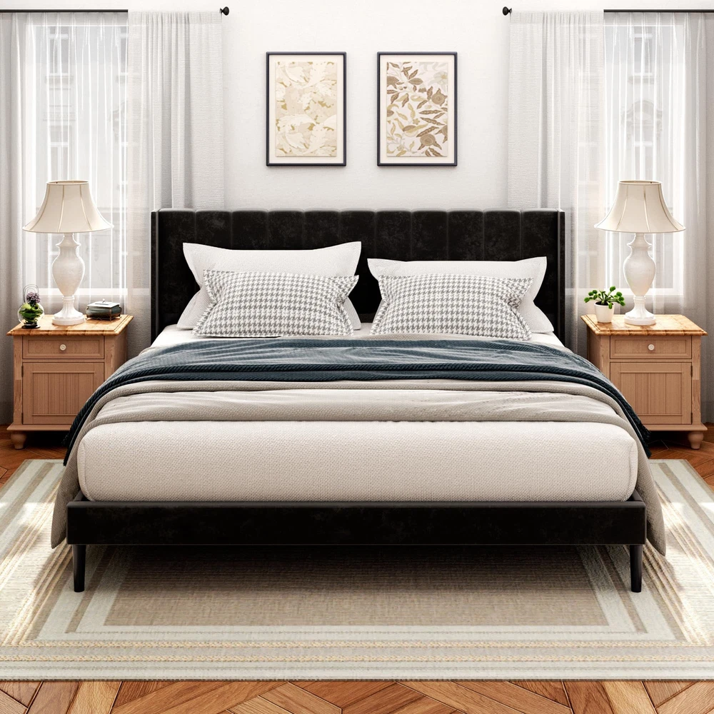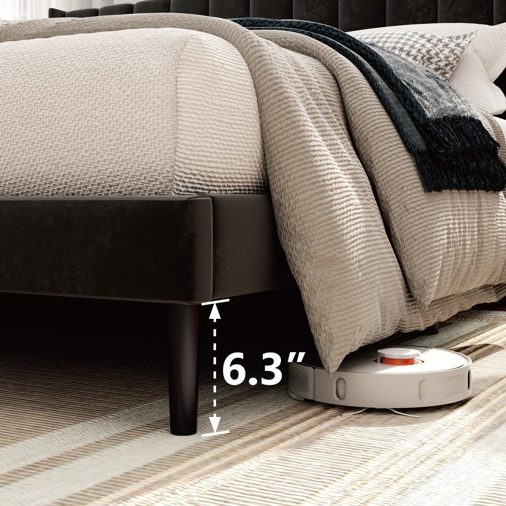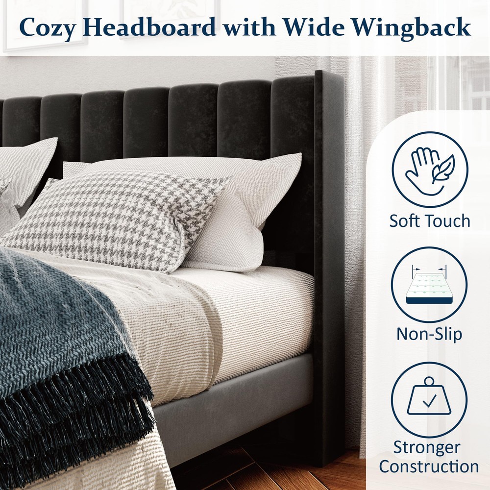 LUXURY WING BACK: Wide backrest design provides unrivaled stability, prevents pillows from slipping, and supports your head and shoulders as you lean against the headboard. Sturdy & Resistant: Made with a sturdy high-quality metal frame and center support legs blend naturally into the sturdy frame to provide dense and strong support. Weight capacity: 1000 Lbs. Thoughtful Design: 6" under-bed storage space is perfect for storing extra odds and ends. The sound-quieting features of the foot pads and sound-absorbing foam ensure a good night’s sleep. No Box Spring Needed: Durable velcro wooden slats are designed to support and extend the life of your latex, memory foam, or spring mattress. Mattress thickness recommended being 8"-12". Quick Setup: Easy to assemble in about 30 minutes, enjoy a hassle-free installation with no additional tools or springs.