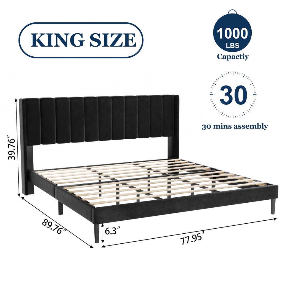 Sismplly King Size Bed Frame with Vertical Channel Tufted Wingback Headboard