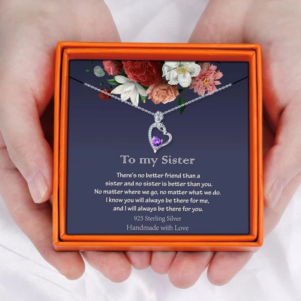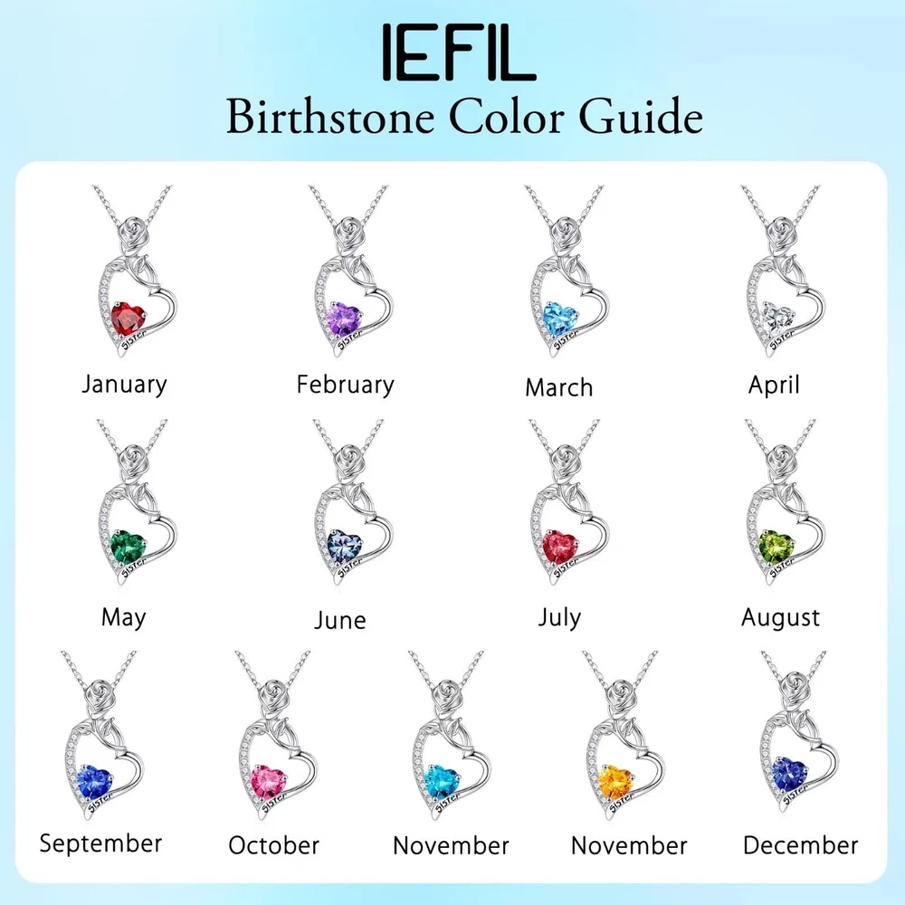 925 Sterling Silver Rose Heart Birthstone Necklace: There are 13 different colored Birthstones representing the months from Jan to Dec. Chain length: 18"+2" Pendant size: 0.8"*0.5" Material: Both the chain and pendant are made up of Sterling Silver and plated with white gold. Comfortable Wear: Lead free, nickel free and cadmium free, no irritation. Package: Rose Flower Birthstone Heart necklace comes with a Delicate Card, a Small Envelope, a Thank You Card, a Silver Polishing Cloth and an Box. Sisters Gifts from Sister Sister Gifts Valentines Day Gifts for Sisters Mothers Day Gifts for Sisters Sister Birthday Gifts Sister Christmas Gifts Best Gifts for Sister: Thank you for love of our product, when your sister receive the gifts, we believe it is a surprise! UNIQUE NECKLACE DESIGN: From a distance, it consists of a rose and a heart, and when you look closely, there is a word "Sister" engraved on the bottom right of the heart pendant. At the center of the heart is a Birthstone pendant and it represents the month of your birth. Perfect gifts for your sisters. 925 STERLING SILVER NECKLACE: Both the chain and pendant are made up of Sterling Silver and plated with white gold. It's lead and nickel free and will never fade on you. THE BIRTHDAY STONES: There are 13 different natural stones representing different birth years, you can choose the color according to your birth month. Perfect sister's gifts from sister. DAINTY GIFT PACKAGE: The sister necklace comes with an box, a thank you card, a small envelopes, a silver polishing cloth and a dainty card. It's ready for giving your mom. Perfect Mother's Day Gifts, Valentine's Day Gifts and Christmas gifts for sister. AFTER SALES SERVICE: Any question about your Sister Birthstone Necklace, please contact us and we will answer your question within 24hours and give you a satisfactory answer.