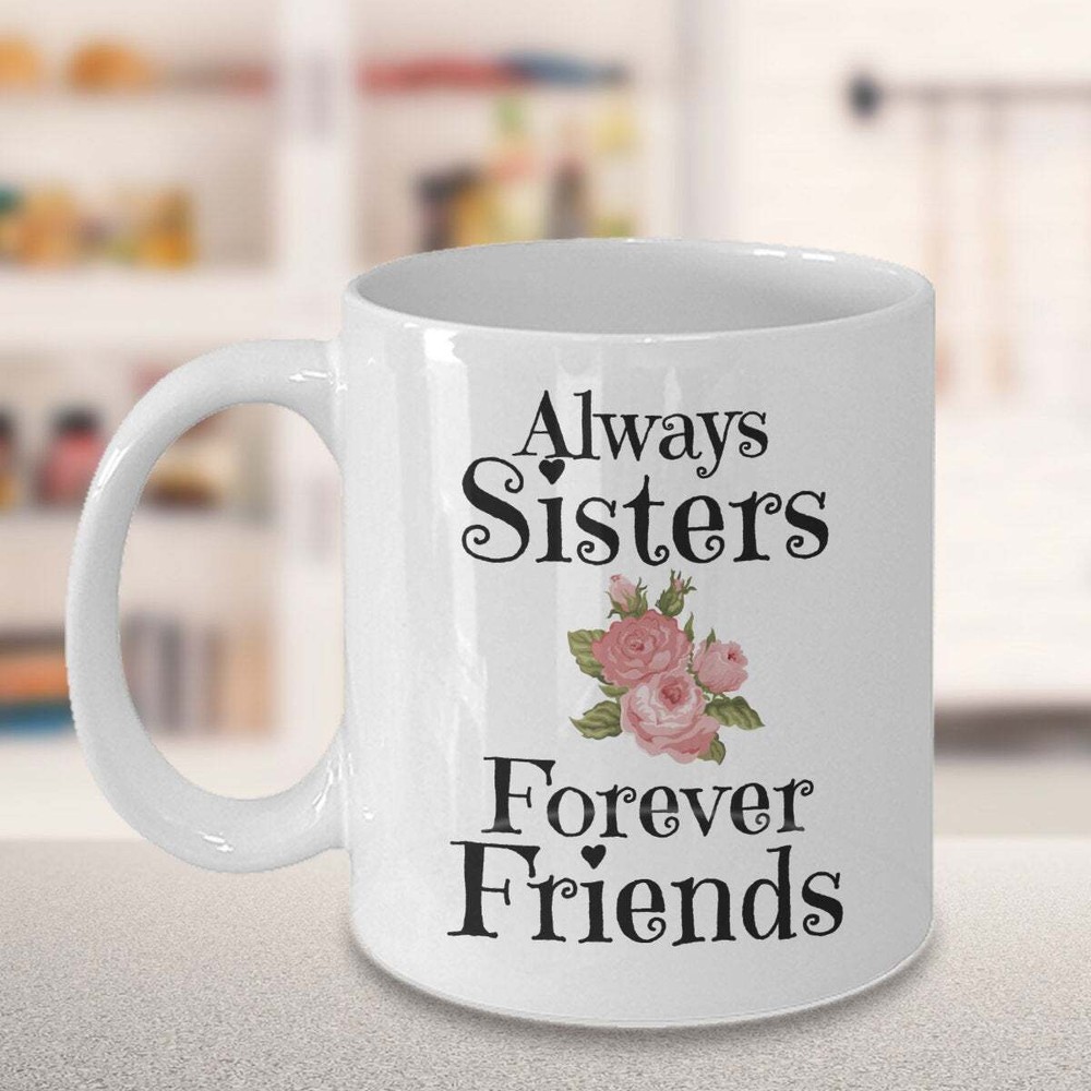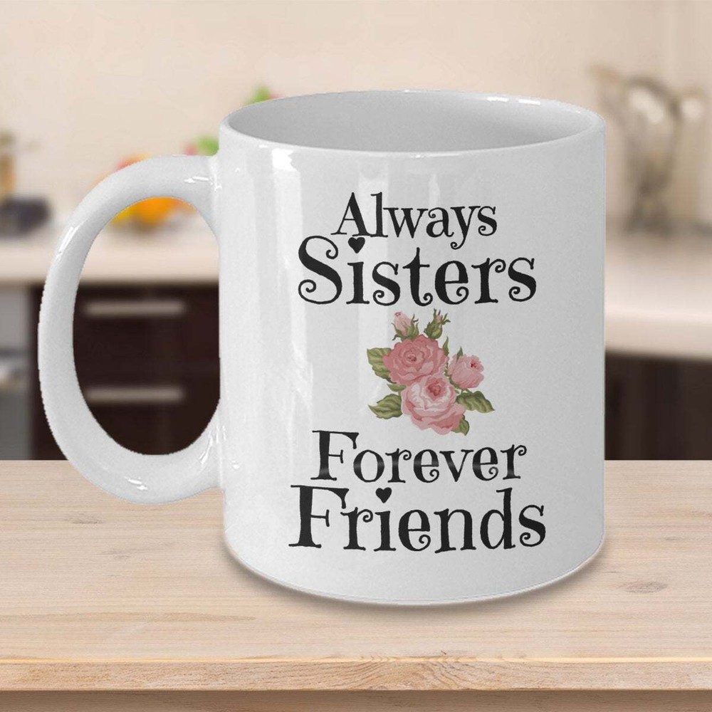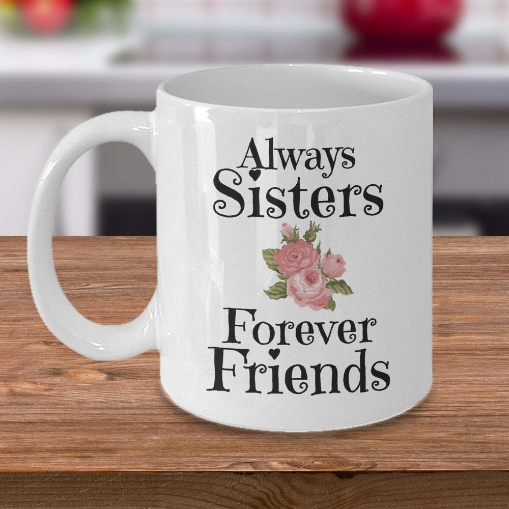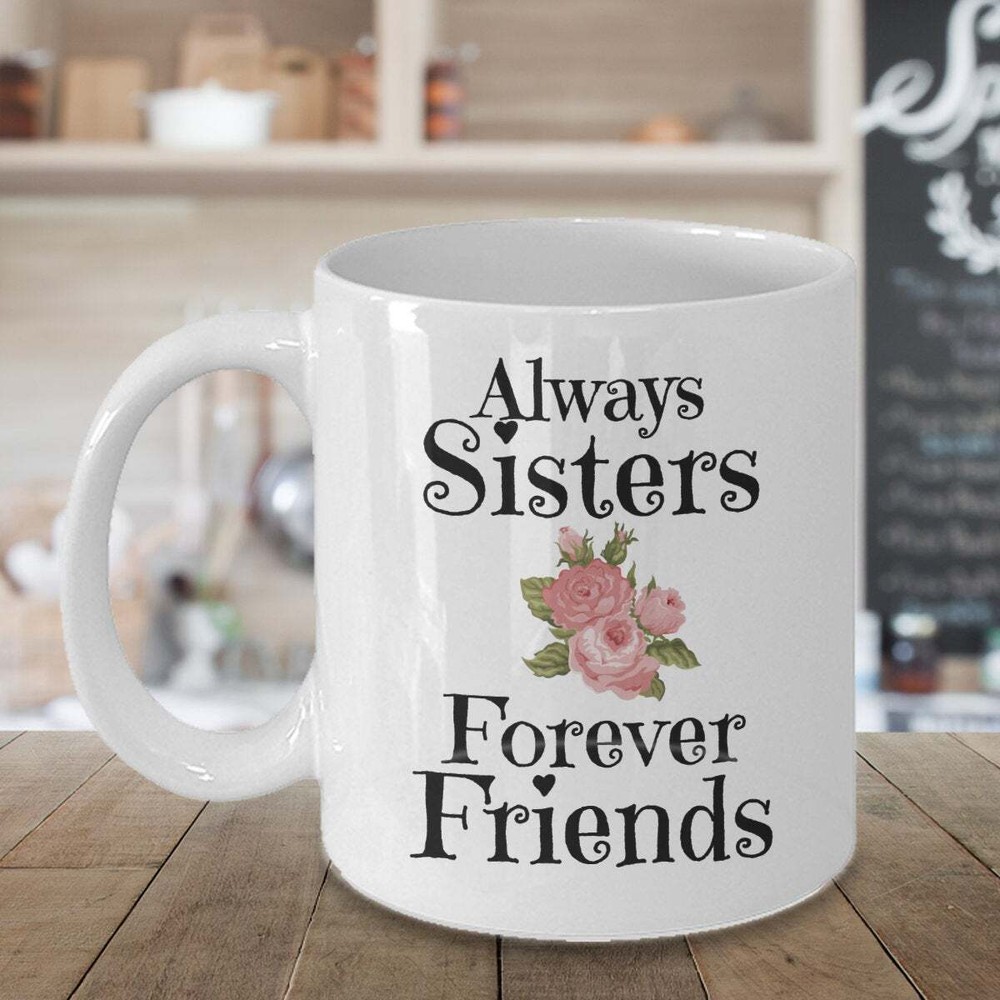 Sister Mug Always Sisters Forever Friends Coffee Mug Best Friend Mug Sister Product Details.. This high quality 11oz. ceramic white mug has a premium hard coat that provides crisp and vibrant color reproduction sure to last for years. Perfect for all hot & cold beverages. The highest quality printing possible is used. It will never fade no matter how many times you wash it. Material: 100% Ceramic. Print both sides. Dishwasher and Microwave Safe. High Gloss + Premium White Finish. Printed in the U.S.A. Personalized & Custom. We support personalized and custom mug to add custom, when placing an order, you can add notes to the "order note" in shipping address section. Also you can contact us directly via message. Shipping Info. Ready to ship in 1 to 2 business days, All products are made-to-order and proudly printed in the United States. Shipped by USPS and DHL, You will receive your order in 5-7 days. Replace & Refund. All products are defective during shipping broken, chipped will be replaced free of charge. You are not satisfied with the product, we will refund 100% money to you. If any other issues arise, please do not hesitate to message, we would be more than happy to assist you.