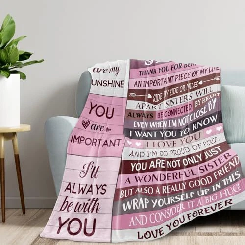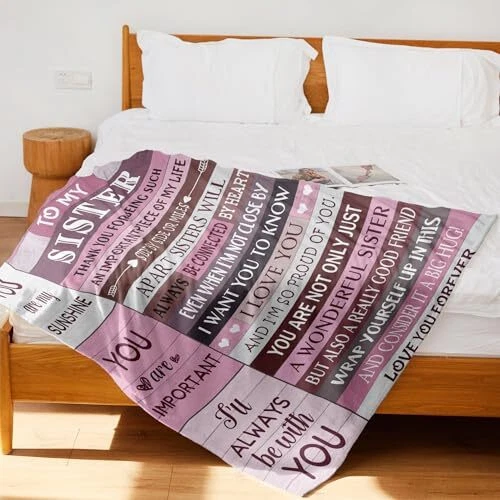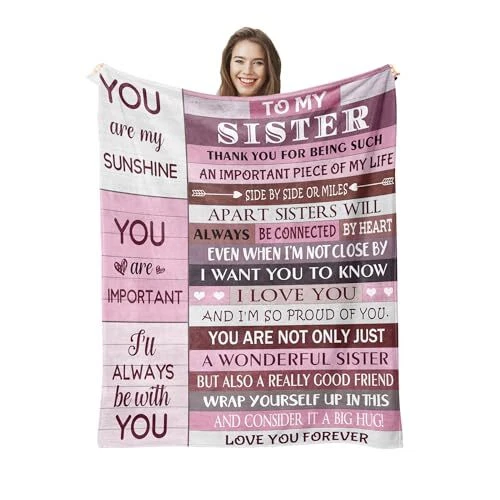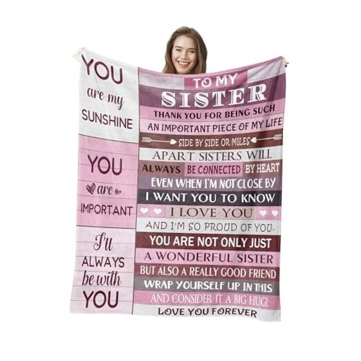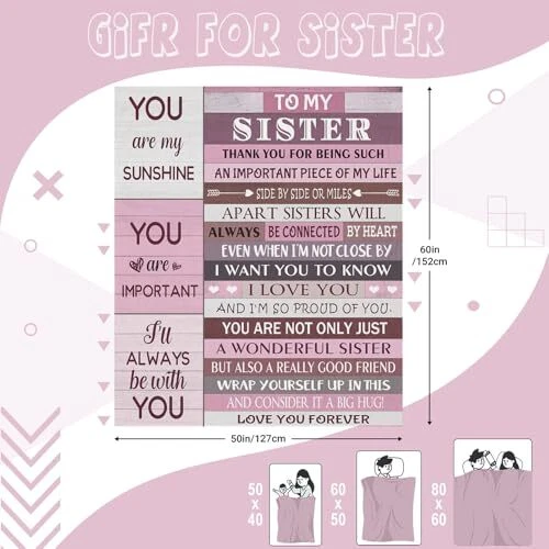 Return Policy Fast Delivery Trusted seller Sister Gifts, Gifts for Sister, Sister Birthday Gifts, Sisters Gifts from Sister, Birthday Gifts for Sister, Best Gift for Sister, Christmas Sister Gifts Blanket (60x50 Inches) Product Description Sweet Sister Gift: Looking for a special gift for your sister? This meaningful gift shows your love for her. 'side by side or miles apart sisters will always be connected by heart.' expresses your everlasting sisterhood. Moderate Size: Our warm and cozy sister blanket can accompany your sister on many occasions, which is great for napping, watching TV, reading, and snuggling. 50" x 60" just the right size for use in a bed, sofa, or car. Occasion: Whether for a birthday, Christmas, Thanksgiving, graduation or other special holidays, send a thoughtful gift to your sister. I'm sure whoever receives it will be delighted. Soft Material: This blanket is soft, warm, and lightweight. No pilling and no fading. It's very soft and durable to feel like a warm hug. The pattern is visible, Even in cool weather, it keeps you warm on a cold night. Cleaning Method: Wash separately in cold water and it is better to wash the blankets in a mesh laundry bag. Tumble dry on low heat. Do not iron or press with heat Shipping Returns Payment Shipping Shipping is FREE to all addresses other than APO/PO boxes in the lower 48 states. All our stock ships from US-based warehouses. Shipped via USPS or UPS (depending on location and package weight) Unless stated otherwise, all orders will ship within 24-72 hours of your payment being processed. Check our feedback to see the great reviews of FAST shipping we offer. Returns Seller does not accept returns Payment We currently accept payment via eBay managed payments only. Once payment is cleared, we will dispatch your shipment within 1-3 business days. Please refer to the "Shipping" tab for more information regarding shipping speed to your destination.