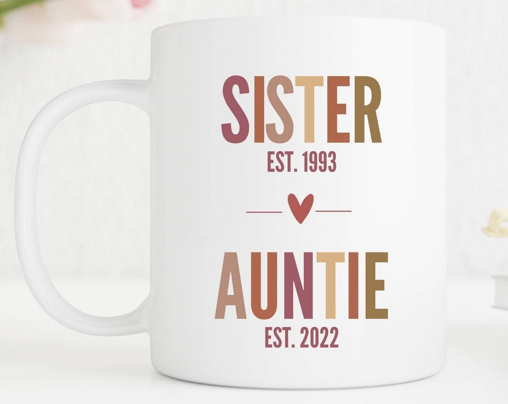 Sister To Aunt Mug New Auntie Mug Pregnancy Reveal To Auntie Personalized Mug Product Details.. This high quality 11oz. ceramic white mug has a premium hard coat that provides crisp and vibrant color reproduction sure to last for years. Perfect for all hot & cold beverages. The highest quality printing possible is used. It will never fade no matter how many times you wash it. Material: 100% Ceramic. Print both sides. Dishwasher and Microwave Safe. High Gloss + Premium White Finish. Printed in the U.S.A. Personalized & Custom. We support personalized and custom mug to add custom, when placing an order, you can add notes to the "order note" in shipping address section. Also you can contact us directly via message. Shipping Info. Ready to ship in 1 to 2 business days, All products are made-to-order and proudly printed in the United States. Shipped by USPS and DHL, You will receive your order in 5-7 days. Replace & Refund. All products are defective during shipping broken, chipped will be replaced free of charge. You are not satisfied with the product, we will refund 100% money to you. If any other issues arise, please do not hesitate to message, we would be more than happy to assist you.