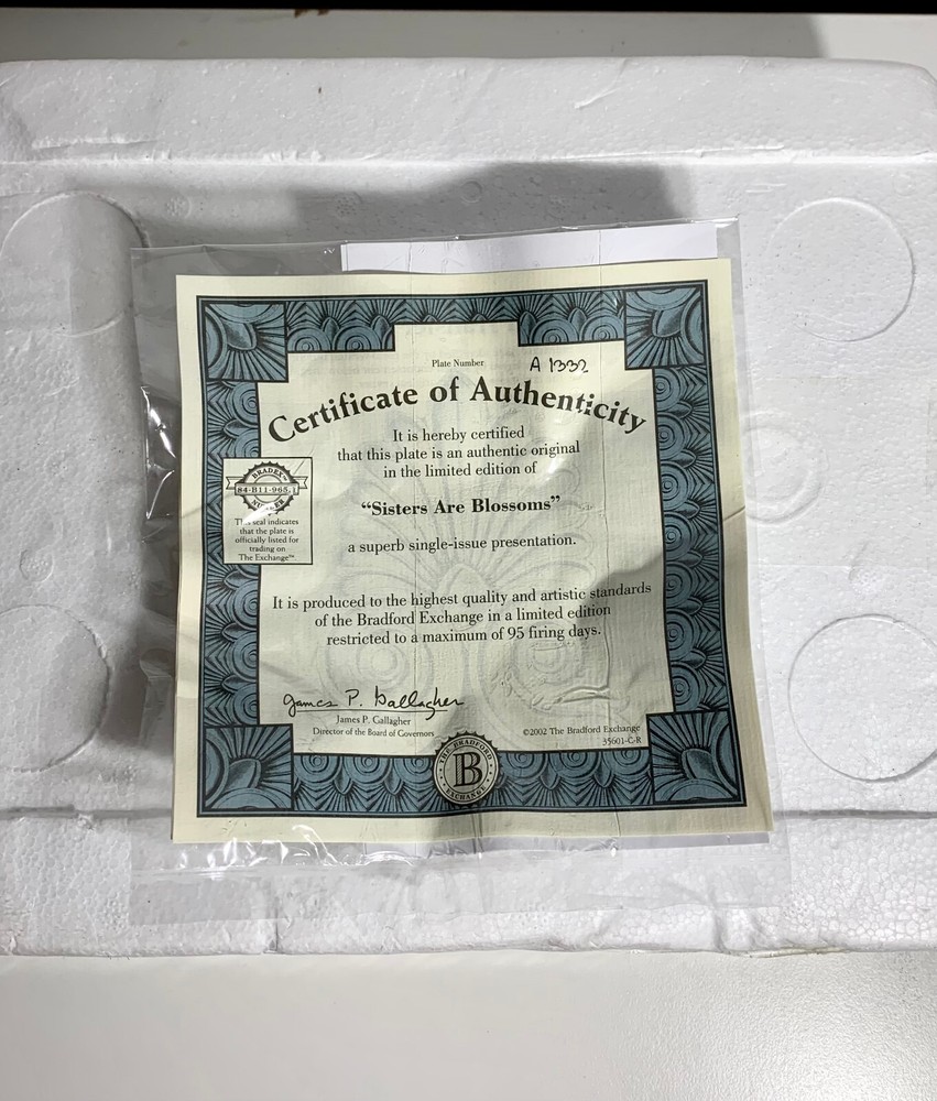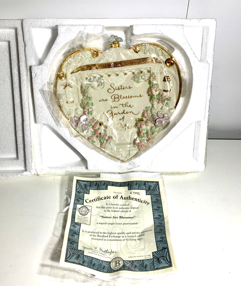 Bradford Exchange Sisters Are Blossoms from the Heart Collector's Wall Plate 2002 New old stock Bradford Exchange wall hanging plate Heart shaped Sister's are Blossoms Measures: 7.25" wide x 7.5" high Has original Styrofoam packaging with some wear/marks Has Certificate of Authenticity Please view all the photographs for Condition of the Item! Thank You and Have a Great Day !