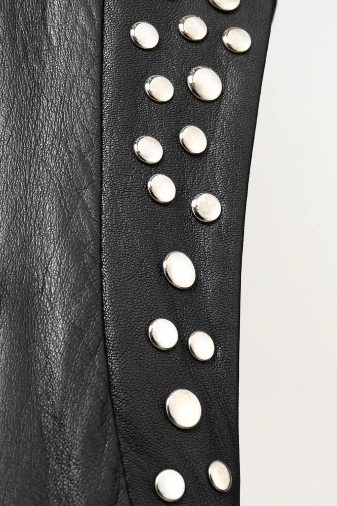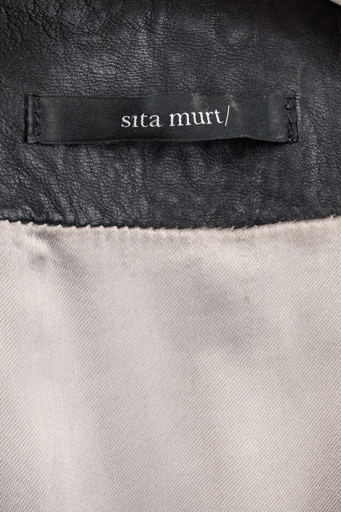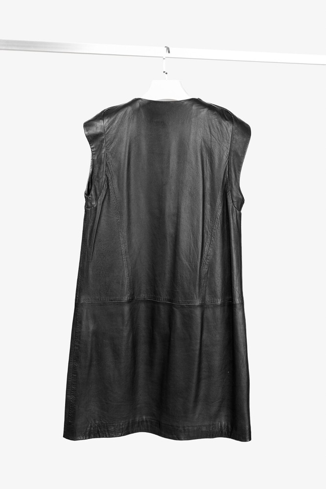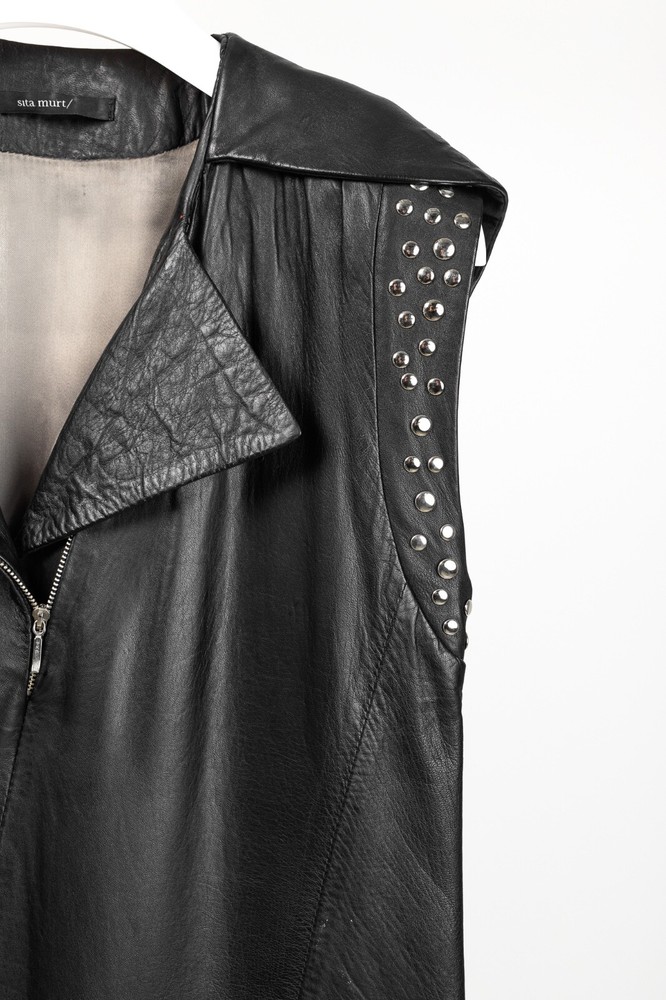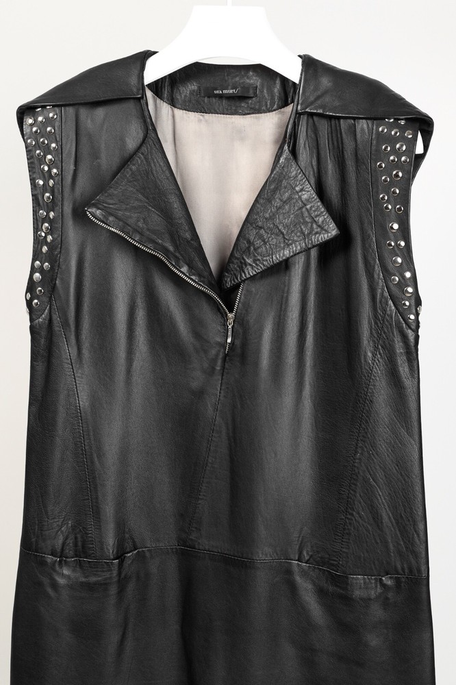This dress from Sita Murt is crafted in a soft black leather, and is embellished with silver-tone studs on the armholes. It features a sleeveless design, layered shoulders, a square neckline, an offset front zip, front seam pockets, a mini-length hem, and is lined in a grey satin. Size: XL Condition: Excellent; some punctures on inside of left armhole; light marking on neckline, front left waist, center front hem. Approximate Measurements (laid flat): Shoulder: 17.75" (45 cm) Chest: 19" (48 cm) Length from back: 37" (94 cm) Composition: Outside: 100% leather. Inside: 100% acetate. Trim: 100% metal.