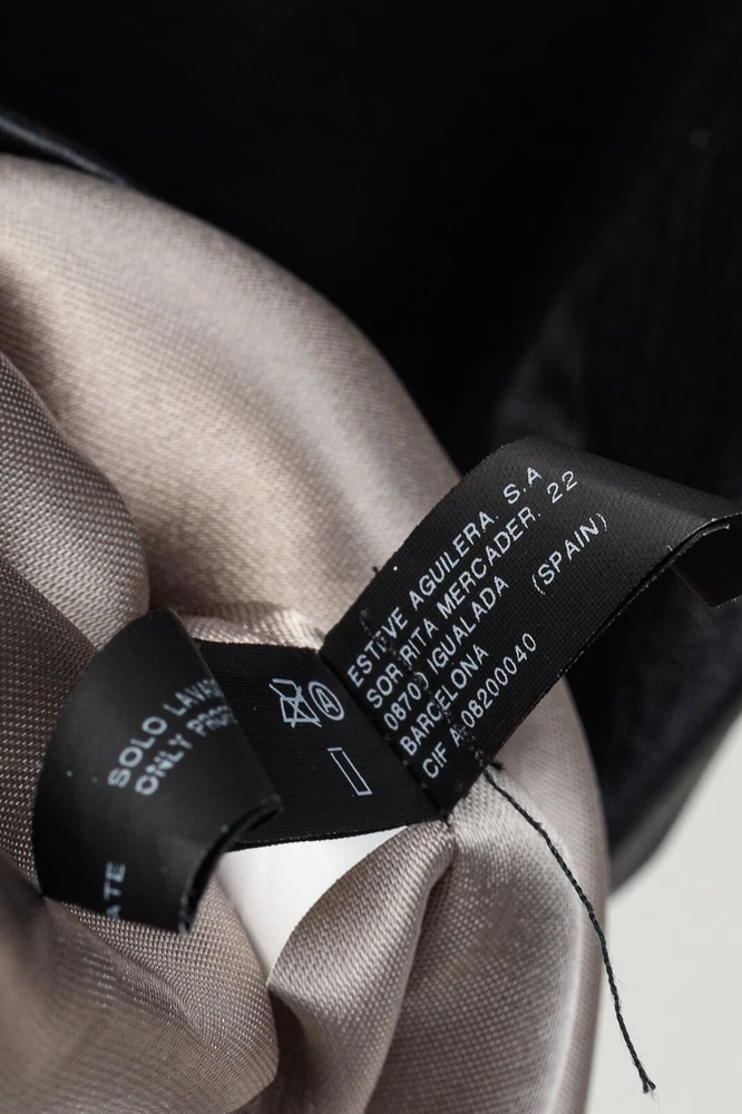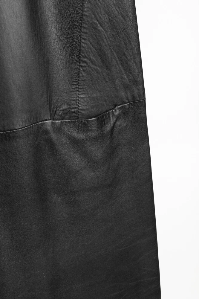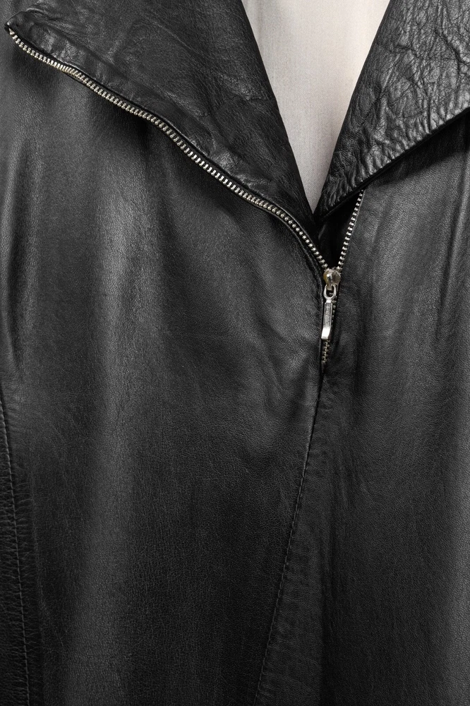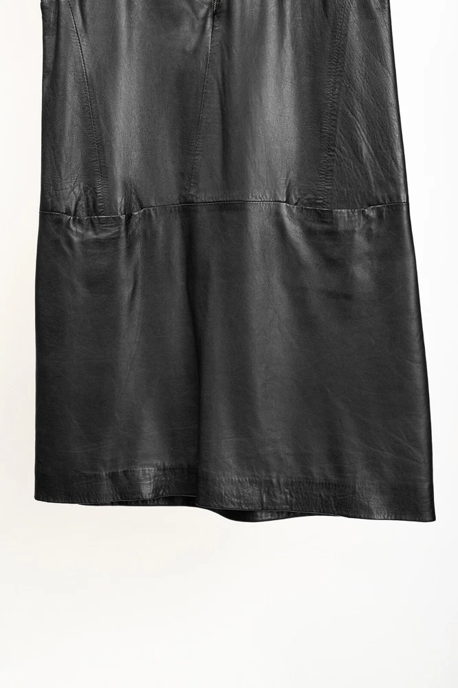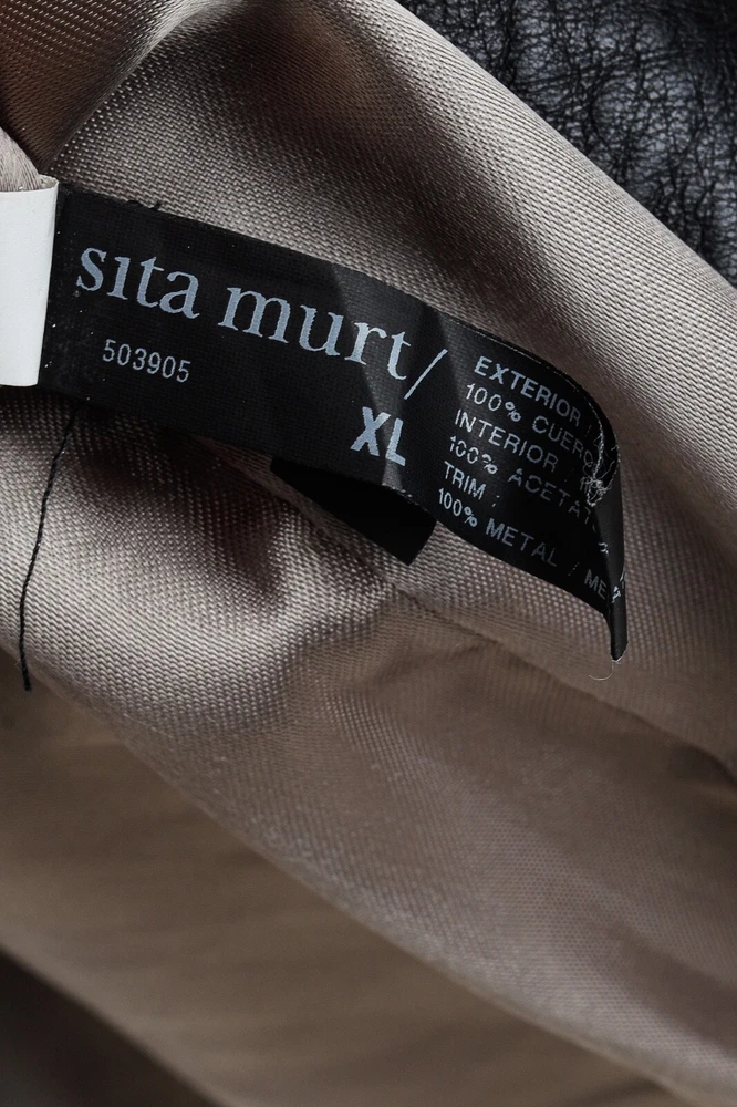 This dress from Sita Murt is crafted in a soft black leather, and is embellished with silver-tone studs on the armholes. It features a sleeveless design, layered shoulders, a square neckline, an offset front zip, front seam pockets, a mini-length hem, and is lined in a grey satin. Size: XL Condition: Excellent; some punctures on inside of left armhole; light marking on neckline, front left waist, center front hem. Approximate Measurements (laid flat): Shoulder: 17.75" (45 cm) Chest: 19" (48 cm) Length from back: 37" (94 cm) Composition: Outside: 100% leather. Inside: 100% acetate. Trim: 100% metal.