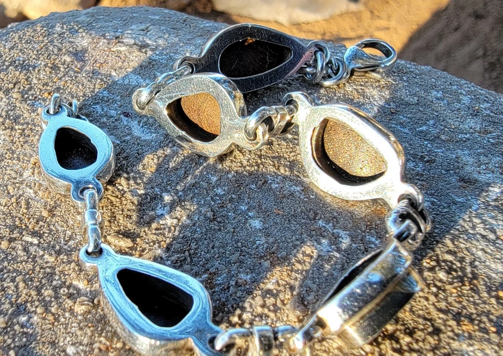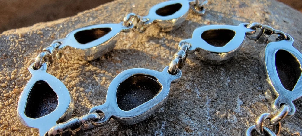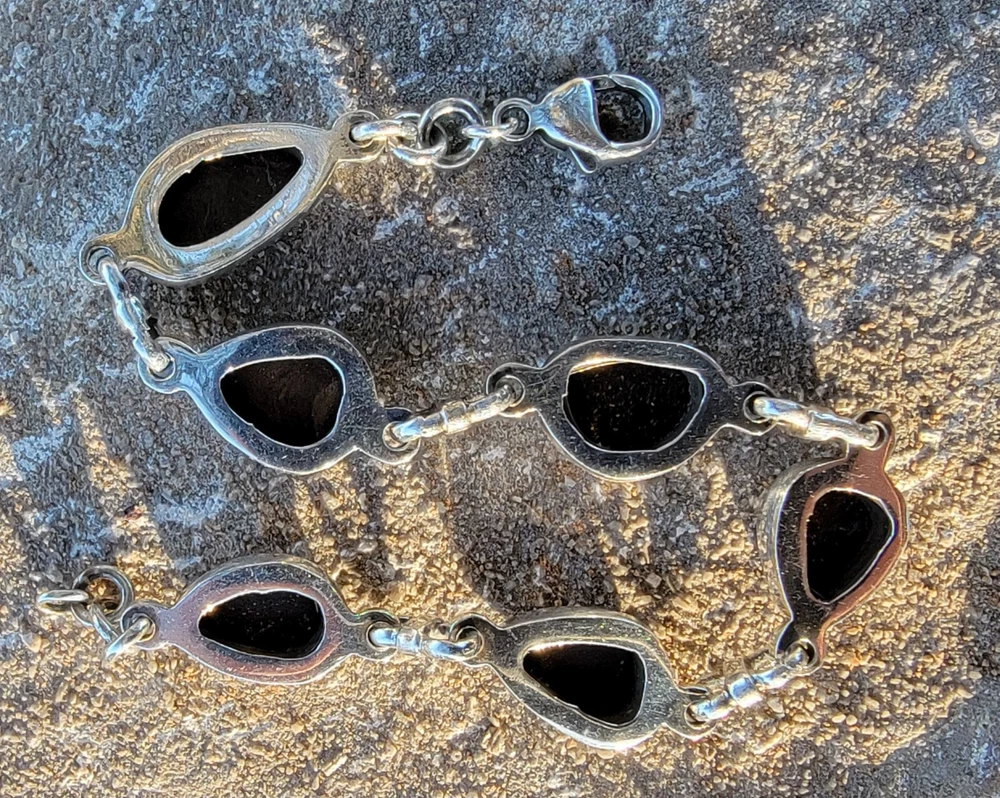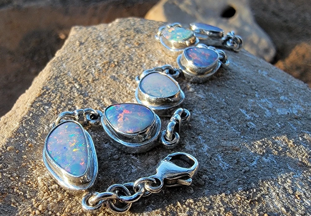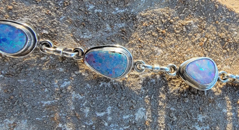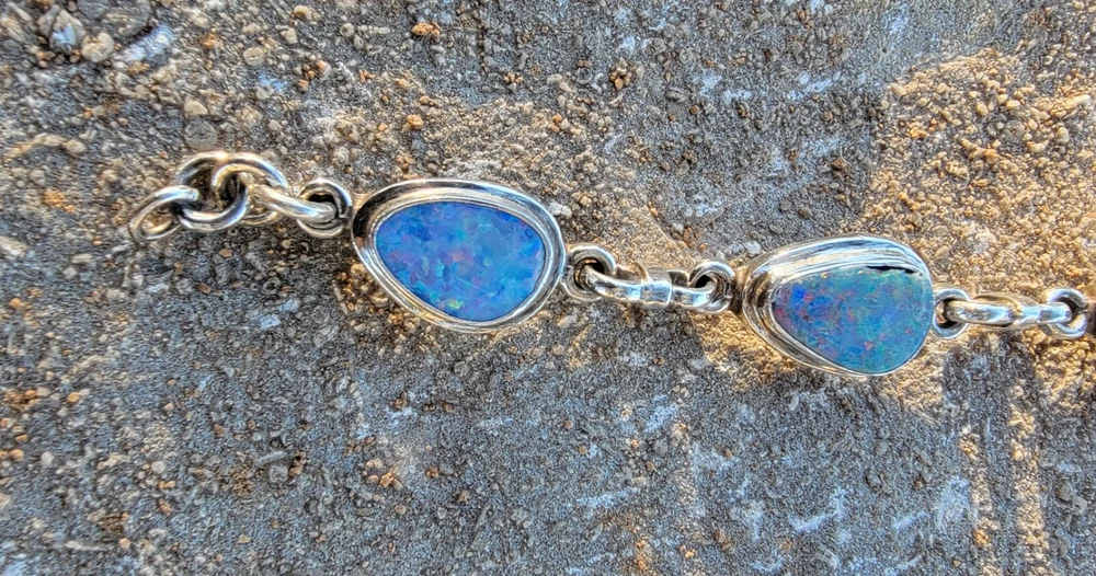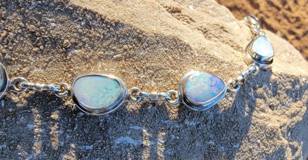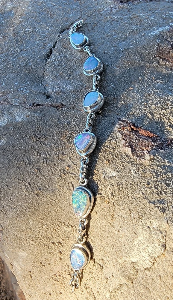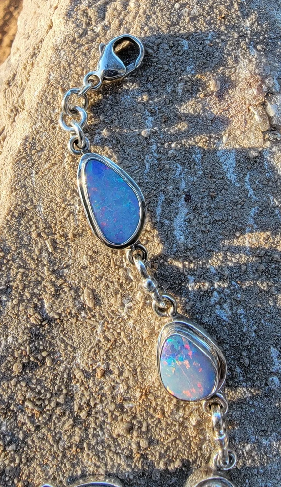 This bracelet features six assymetrical Australian Opal Doublets set in .925 solid Sterling Silver bezels. Each asymmetrical, natural doublet opals showcases a multicolor display, creating a unique and eye-catching piece. The bracelet is adjustable and has a secure lobster closure measuring a length of 7.5 inches. Details/ Dimentions: Six (6) total doublet assymetrical shaped Australian opals, Bezel setting (approx 1/4 5k 1/3 in diam, 4 mm thickness .925 Sterling Silver (unmarked) Links between opals measure 9.5 mm x 5mm x 1.25 mm Every link in the chain is silver soldered (securely closed) Total weight 18.9 grams Made in Australia (unmarked)