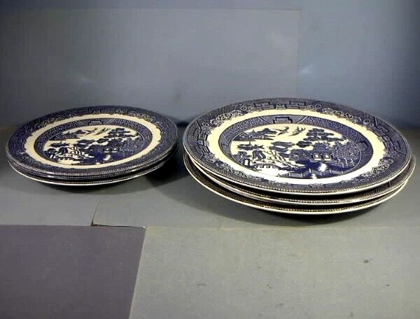 Size, dinner plates 10.25" diameter, salad plates 7 7/8" diameter. Color blue and white. Here we have three dinner and three salad plates in the Blue Willow pattern. Made by the Johnson Brothers China Co. England. The plates are in good condition. Please search pop471 for more stuff.